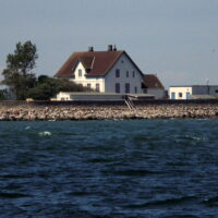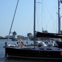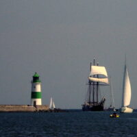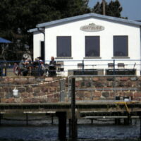 14:15Uhr erreichen wir die Einfahrt in die Schlei – etwas schade, jetzt hat das Segeln richtig Spaß gemacht. Wir bergen das Groß und segeln nur mit Fock am grün-weißem, 15m hohem Leuchtturm Schleimünde entlang. Dahinter gleich der Hafen Schleimünde mit dem bekannten Lokal „Giftbude“.