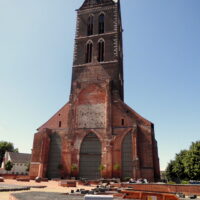 Nächste Ziel der Marienkirchturm. Durch Luftminen wurde das Kirchenschiff von St. Marien sehr stark zerstört. Der Turm blieb dabei erhalten. Die Ziffernblätter der Uhr haben einen Durchmesser von 5m. 1960 wurde die Ruine des Kirchenschiffs gesprengt. Langhaus und Chor sind nur noch als Bodendenkmal erhalten.