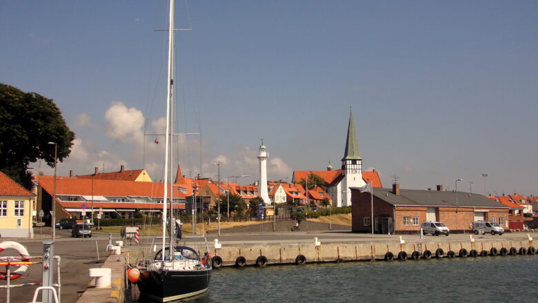 Heute ist nun wirklich Bornholm unser Ziel. Der Wind hat auf West gedreht und damit lässt sich die Insel gut erreichen. Wir legen 8:45Uhr ab, können nach 10min die Segel setzen (Groß 1x gerefft und Fock voll). Wir haben Wind mit 13 bis 15kn, raumschots geht es mit über 8kn auf einen Kurs von 125°, also direkt auf Roenne zu. In 5½h erreichen wir nach 36 gesegelten Seemeilen die Hauptstadt von Bornholm und legen uns in den Nordhafen an die Pier. Sonnenschein den ganzen Tag. Der Stadtrundgang vom Reiseführer beginnt an der Nikolai-Kirche, von der man einen schönen Blick auf das Meer und den Hafen hat. In Inneren beeindruckt im Kirchenschiff die Fregatte „Danneborg“, die südlichen und nördlichen Querschiffe und die Orgel. Jedes Jahr im August werden hier Orgelkonzerte mit Organisten aus der ganzen Welt abgehalten.