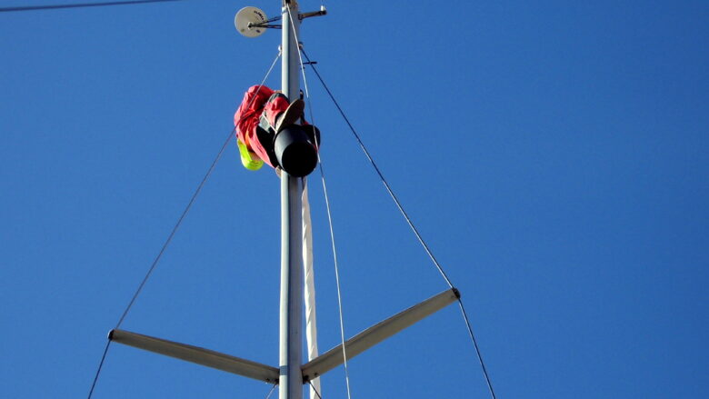 Dann hatten wir doch noch Glück. Unser Bootsnachbar hat sich bereit erklärt, Jockel in den Mast hoch zu kurbeln. Ines hat dabei mitgeholfen. Die Großschot muss neu eingefädelt werden, das hat natürlich seine Zeit gedauert, so dass Jörg ziemlich lange oben gehangen hat. Aber der Erfolg zählt, die Großschot ist repariert und wir können morgen wieder segeln! Noch ein Gläschen zum Dankeschön bei unseren Nachbarn, dann ist es auch genug für heute.