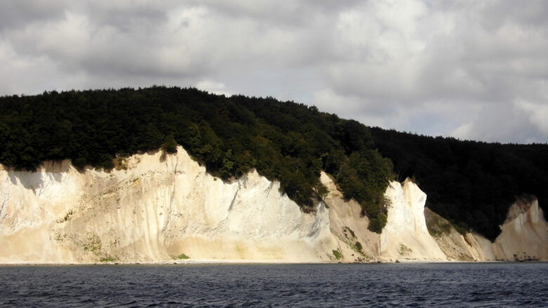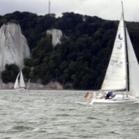 Es ist leicht bewölkt, der vorausgesagte Wind ist da. Schon im Hafen setzen wir das Groß 1x gerefft, dann vor der Mole die Fock dazu. Und schon geht’s raumschots ab, schön wie immer der Blick auf Saßnitz, die Stubbenkammer und der Königsstuhl.