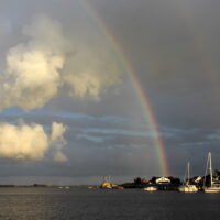 Als wir Lohme querab haben, hoch am Wind, Kurs 305°, Speed zwischen 7 und 8kn. Mehrfach bringen uns Wolken sowohl Regenschauer als auch verstärkten Wind, d.h. die Fock muss gerefft und dann wieder ausgerefft werden. 15:10Uhr haben wir endlich die Höhe erreicht, um nach Hiddensee zu gelangen. Und was macht der liebe Wind – er dreht auf WNW. So wäre diese Höhe nicht notwendig gewesen. Aber Spaß macht‘s nun trotzdem. Da der Wind auf 22kn zunimmt, wird das Groß nochmals gerefft und wieder geht’s raumschots rauschend durchs Wasser. Die Fahrrinne zwischen Hiddensee und Rügen können wir gut segeln, erst als wir Richtung Vitte abbiegen müssen, haben wir den Wind von vorn. 17:50Uhr Stadthafen Vitte, gerammelt voll, wir legen uns bei einem Fischer ins Päckchen. Heute waren es 7½h und 46sm. Abends bleiben wir an Bord, schauen auf das Wasser, die Wolken und mehrfach auf Regenbögen.