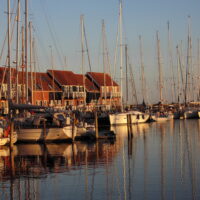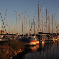 Der Fischer will um 9:00Uhr ablegen, wir 10min früher. Es ist stark bewölkt, nachts hat es geregnet. Das Groß im Hafenbereich zu setzen misslingt, aber die Fock bringt uns in der gesamten Fahrrinne bei Wind aus West mit 10 bis 13 kn auch gut vorwärts. Erst als wir das Tonnenpaar 1/2 erreichen, können wir das Groß (1x gerefft) dazu setzen. Ab 10:30Uhr können wir unseren Kurs auf Moen direkt absetzen und ab geht’s wieder in Rauschefahrt. Schön von weitem die Kreidefelsen Moensklint. 14:55Uhr ist die Hafeneinfahrt erreicht, direkt beim Anlegen erwischt uns ein tüchtiger Regenschauer mit entsprechendem Wind. Kurz danach scheint die Sonne vom blauen Himmel. Schöne 38sm waren es heute. Mittagessen an Bord, Ausruhen, Liegegebühr von 160DKR bezahlen, weiter die Ruhe genießen unsere Nachmittag- und Abendbeschäftigungen. Wieder tauchen Bekannte auf, Segler von der SG Scharmützelsee, also Schwätzchen halten. Hafenspaziergang am Abend – den Hafen hat Jörg noch nie so voll gesehen. Da ist unser Platz vor dem Hafenmeistergebäude an der Pier super gut.