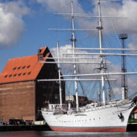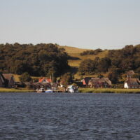 Hinter der Brücke segeln wir mit achterlichem Wind gleich weiter, ein entspanntes Segeln im gesamten Strelasund bei ~12kn Wind. Gegen 15:00Uhr sind wir auf dem Greifswalder Bodden. Den queren wir raumschots mit „Rauschefahrt“, Kurs 50°. Schon 16:30Uhr die Ansteuerung nach Thiessow erreicht, Motor an, Segeln bergen und in der oft sehr schmalen Fahrrinne bis in den Hafen fahren. Der Hafen ist ziemlich voll, als 2. im Päckchen haben wir 17:00Uhr nach 7h die Leinen fest. Die Sonne scheint vom blauen Himmel, die hügelige Landschaft bei der Einfahrt nach Thiessow begeistert uns immer wieder.