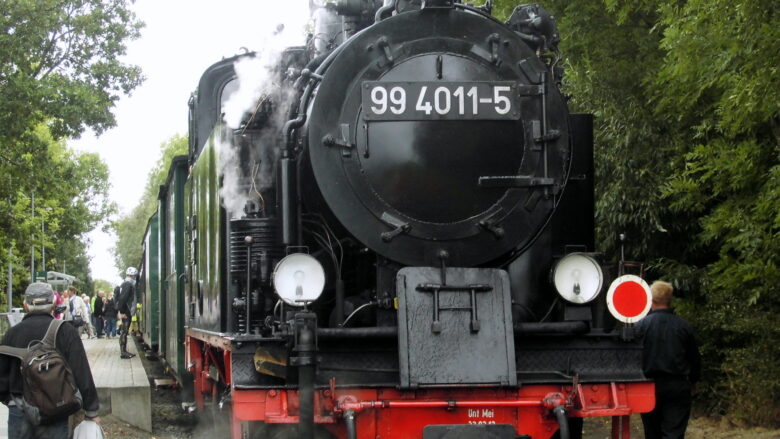 Der Himmel ist bedeckt, es regnet und ist grau in grau, so wie unsere Stimmung. Mehrfach nerven wir den Werkstattmeister Herrn Dittmer, aber die Herren von Volvo-Penta kommen nicht aus dem Knick. Mittags hört der Regen auf, zur Ablenkung wandern wir am Bodden entlang manchmal an der Küste manchmal im Wald über Neuendorf nach Wreechen, also dieses Mal in Richtung Süden. Auch hier wird viel von der Küste weggespült und manche Bäume haben kein langes Leben mehr. Schön die Allee mit den alten Weidenbäumen und die alten restaurierten Fischerhäuser. Wieder in Lauterbach: Der „Rasende Roland“ läuft gerade ein, so ist ein Blick auf die Dampflok der Schmalspurbahn und die Waggons möglich.