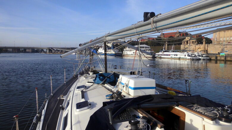 Jörg baut den Windgenerator ab und bereitet das Boot zum Mastlegen vor. Da der Wind auf 3kn zurückgeht, muss der neue Motor wieder ran. Vorteil: die Segel können abgeschlagen werden und auch der Großbaum wird nicht mehr gebraucht. So ist bei der Ankunft in der Marina Hotele in Stettin alles zum Mastlegen vorbereitet. Unterwegs hatten wir uns telefonisch angekündigt. Und bald kam der Hafenmeister und die Arbeit konnte beginnen. Nach 1h war es geschafft, dann natürlich noch alles verzurren. Die Sonne scheint – es ist ein angenehm warmer Nachmittag. Abends wusste Jörg, was er gemacht hat. Kurz vor dem Schlafengehen kommt Regen, jetzt stört er uns nicht.