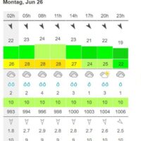 26.6.: Heute Hafentag, die Windvorhersage erfordert das. Wind in Böen aus NNW mit bis 30kn müssen wir uns nicht antun. Morgen soll es wieder normal sein, d.h. auf etwa 15kn zurückgehen. Und Regen gibt es heute außerdem genügend dazu. Sogar die professionellen Fischer sind zurückgekommen, weil es draußen kein Arbeiten sei.