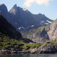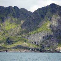 7.7.: Aufstehen, ….., Sonne, kein Wind. Wir müssen die 15sm bis Aa auf der Lofoten-Insel Moskenesöy motoren. 2 bis 5kn Wind und spiegelglattes Wasser, aber eine wunderschöne Sicht auf die rund 600m hohen Berge. Die Einfahrt nach Aa nicht ganz einfach, aber dank elektronischer Seekarte gut zu bewältigen. An der kommunalen Pier (67°41,8’N 12°48,3’O) legen wir 12:00 an.