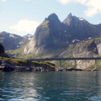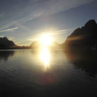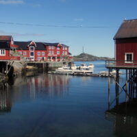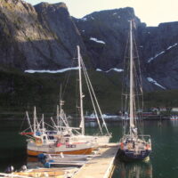 Wir haben heute zwar schon ganz viel Schönes gesehen, wollen trotzdem noch nach Reine, wieder kein Wind – nochmal 5sm mit Motor und dabei immer wieder der Blick auf die Felsen. 17:30 sind wir in Reine an einen Schwimmsteg fest. (67°56,1’N 13°05,1’O). So schön hier das Panorama ist, am liebsten wäre ich wieder losgefahren. Für das Liegen an einem vergammelten Steg ohne Wasser sind 400NOK zu zahlen – ziemlich unverschämt. Wir bleiben doch (man gönnt sich ja sonst nichts!!!), da für morgen Vormittag eine Wanderung geplant ist. Heute Abend nur ein kleiner Rundgang im Ort, der wegen seiner Lage zu den schönsten Orten der Lofoten gehören soll.