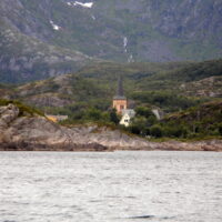 11.30 Motor an und Ablegen, das Groß gleich im Hafen, die Fock kommt knapp außerhalb dazu. 12kn aus NNW lassen uns gut segeln. Vorbei geht es an den 947m hohen Vaagekallen und an Kabelvaag mit der Lofotenkathedrale. Nach 2h ist die Einfahrt in den Hafen von Solvär erreicht.