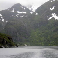 14.7.: Heute ist früh Aufstehen angesagt, Der Raftsund hat starke Strömungen. Wenn in Bodö Hochwasser ist, strömt er etwas zeitverzögert nach Nord. Wir mussten spätestens 7:00 ablegen, um keinen Gegenstrom (der bei ungünstigen Bedingungen bis zu 8kn sein kann) zu haben. 7:03 haben wir diesen wunderschönen Fjord verlassen und biegen in den Raftsund ein.
