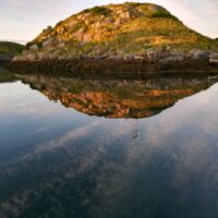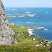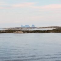 Da wir im Päckchen an einem Wikingerboot liegen und es bei Tide ziemlich flach wird, wollen wir noch auf die größere Nachbarinsel Husöy mit dem Hauptort Träna. Den dortigen Gästeschwimmsteg erreichen wir nach 45min (66°29,7’N 12°05,0’O), hier kostet die Übernachtung inkl. Strom und Wasser 100NOK. Nach Mittagessen und Ausruhen ein Spaziergang in das Zentrum mit schöner Kirche und ansonsten auch alles schön. Zu mehr fehlt der Antrieb. In der Sonne bei wenig Wind ist es 19:00 noch sehr warm, 22:00 sind noch 19°. Der kurze Weg auf einen kleinen Hügel nahe der Marina lohnt, zwischen den Felszacken von Sanna scheint die Sonne und 23:00 ist in unserm Hafen der Himmel rot.