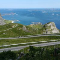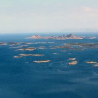 27.7. Heute ist nun wirklich das Träna-Archipel dran. 9:00 ablegen, dann mit Motor durch die Fahrstraße zwischen den Schären, schöne, wenn auch kahle Felsen. Nach 40min Segel setzen, bei NNO mit 14kn ein superschnelles Segeln. Knapp 2h für 12sm, in den Felsen der Inselgruppe Motoreinsatz. Wir legen zuerst auf Sanna(66°26,7’N 12°11,5’O) mit seinen 4 zackigen 250 bis 350m hohen Felsen an. Und machen uns mit Taschenlampen auf zur Wanderung. Den Berg mit der Radarstation gilt es zu bezwingen. Zuerst haben wir den falschen Weg erwischt und landen in der gewaltigen Höhlenkirche, in der auch Trauungen stattfinden. Wieder zurück und durch den Ort, bis wir den Tunneleingang haben. Der Tunnel ist unbeleuchtet und hat eine Länge von 700m stetig aufwärts gehend. So groß, dass auch kleine LKW durch fahren können. Hinter dem Tunnel schon eine Supersicht, wir wollen es aber noch besser. Bis zur Radarstation sind noch einige Höhenmeter zu überwinden. Uns von oben der Rundumblick: blaues Wasser, weiße Sandstrände (die flachen Stellen davor türkisfarben), die vielen, vielen Schären, grüne Wiesen, Häuser, die Felsen der größeren Inseln und das Festland in der Ferne und nicht zuletzt der Anlegesteg mit unserm Boot. Das Schwitzen hat sich gelohnt.