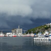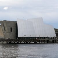 Und gut, dass wir nicht so spät abgelegt haben, die Wolkenwand mit dem Starkwind kam schon 3h früher als angekündigt. Wir waren etwa ½h fertig mit dem Anlegen, da ging es mächtig zur Sache. Wegen der Starkwindvorhersage hatten wir uns für Rörvik entschieden, da das ein geschützter Hafen ist (20sm entfernt von Leka). Und das neue futuristische Gebäude ist die vom König Hakon eingeweihte Konzerthalle.