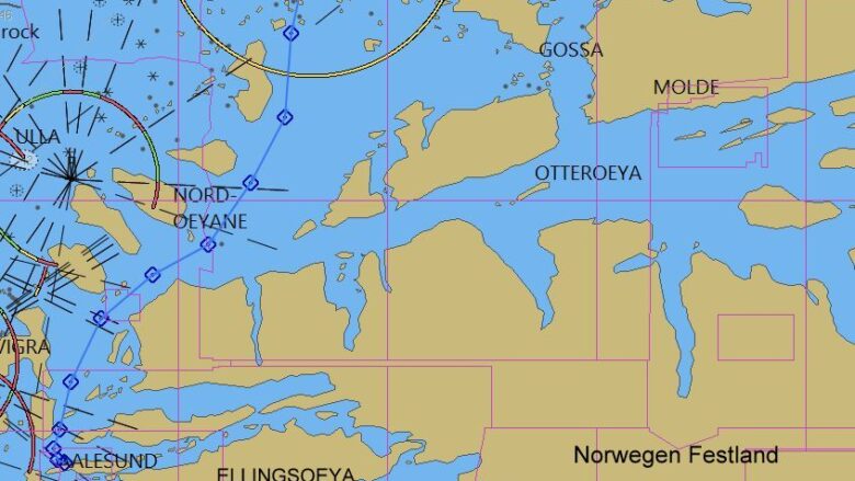 7sm vor Alesund kommt Wind mit 10 bis 12kn genau von vorn, bei dem schlechtem Wetter zu kreuzen, wollen wir nicht. So muss der Motor weiter brummen.