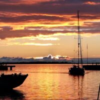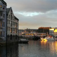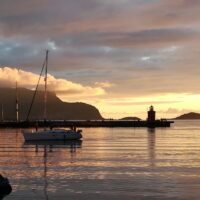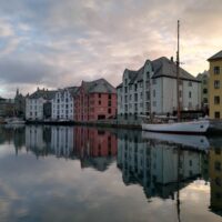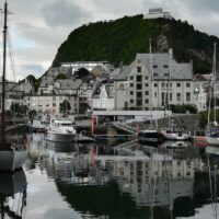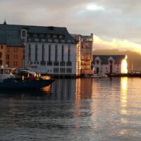 In Alesund zuerst an die Tankstelle, dann haben wir Glück: 2 Motorboote fahren ab und machen den Liegeplatz im inneren Hafenteil frei. Kaum 1h später das herrlichste Wetter hier, Sonne vom blauem Himmel, wenig Wind – für das Liegen in der Plicht genau richtig. In den Abendstunden bummeln wir im schönen Alesund mit seinen vielen Jugendstilhäusern und lassen uns von der untergehenden Sonne verzaubern.