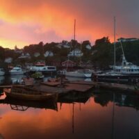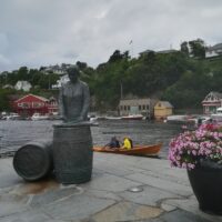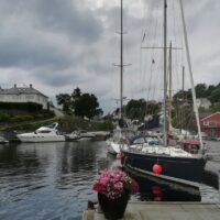 Im Vatlestraumen 1kn Gegenstrom, dass ist noch okay. Und dann ist Kreuzen angesagt. Durch das Inselarchipel von Leröy und Bjakoröy muss der Motor mithelfen – die vielen Inseln meist mit Bäumen bewachsen sehr schön. Deshalb auch die Wahl dieses Weges. Ab 12:00 geht es über den Korsfjord, Wind aus OSO mit 17kn, später mehr. Weiter Kreuzen, dazu 2 Reffs ins Groß. Immer wieder Regenschauer, auch beim Queren des Björnafjords. Wir wählen die Durchfahrt zwischen Hyfteröy und Reksteren. Hier wird es immer böiger, in die Fock muss ebenfalls ein Reff. Spitzenwert 33kn Wind, da ist das Boot kaum zu halten und die Scheuerleiste schleift tüchtig im Wasser. Da die dunklen Wolken nicht abnehmen, entscheiden wir uns für einen Liegeplatz auf Selbjörn und zwar für Bekkjarvik. Keine schlechte Wahl, am Schwimmsteg innen ein geschützter Platz, Liegegebühr 200NOK (Strom und Wasser incl.) in schöner Umgebung.