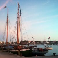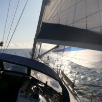 Bis zur Kadet-Rinne klappt das gut, die muss rechtwinklig überquert und natürlich Frachtern ausgewichen werden. Hier brauchten wir zusätzlich den Motor, um schnell genug zu sein. Als nächstes „stört“ das Windfeld vor dem Darß, der Wind kommt zu spitz – also Gennaker wieder einsammeln. Mit 3 bis 5kn kommen wir voran, langsamer zwar als gedacht. Nun die Sonne scheint, im Windschutz ist es fast zu warm. Die Sicht ist heute besonders gut, bis kurz vor Hiddensee sind die Felsen von Mön noch zu erkennen. 17:30 biegen wir in den Tonnenbereich nördlich von Hiddensee ein. 18:30 liegen wir im Stadthafen von Vitte. Deutschland hat uns nach rund 3300sm über Grund wieder.