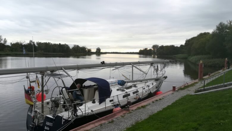 Heute Sonne und Wind, er kam aus Süden und hat bestimmt mit ½kn gebremst. 15:20 ist Mescherin querab, hurra wir haben deutschen Boden unter uns.