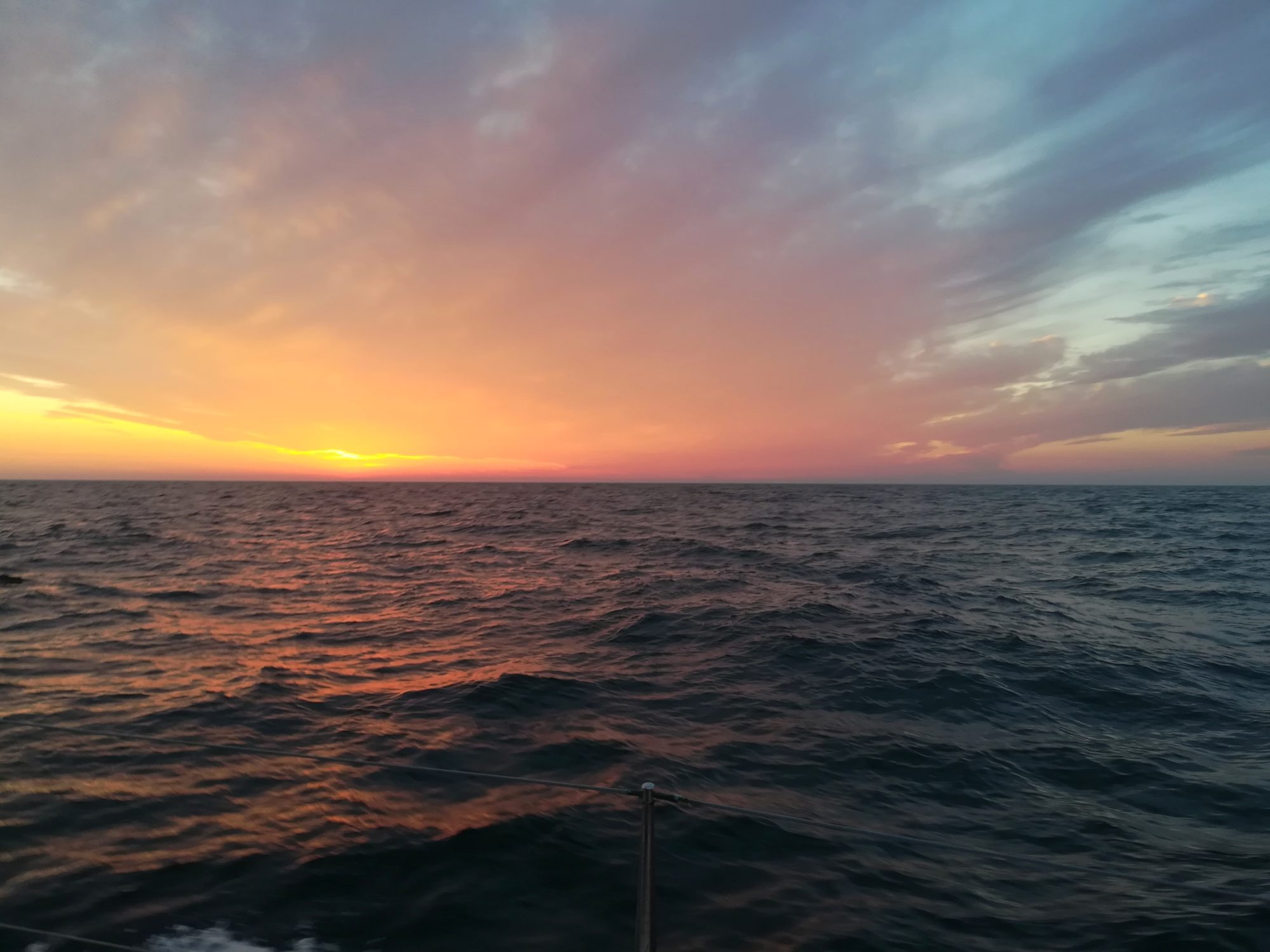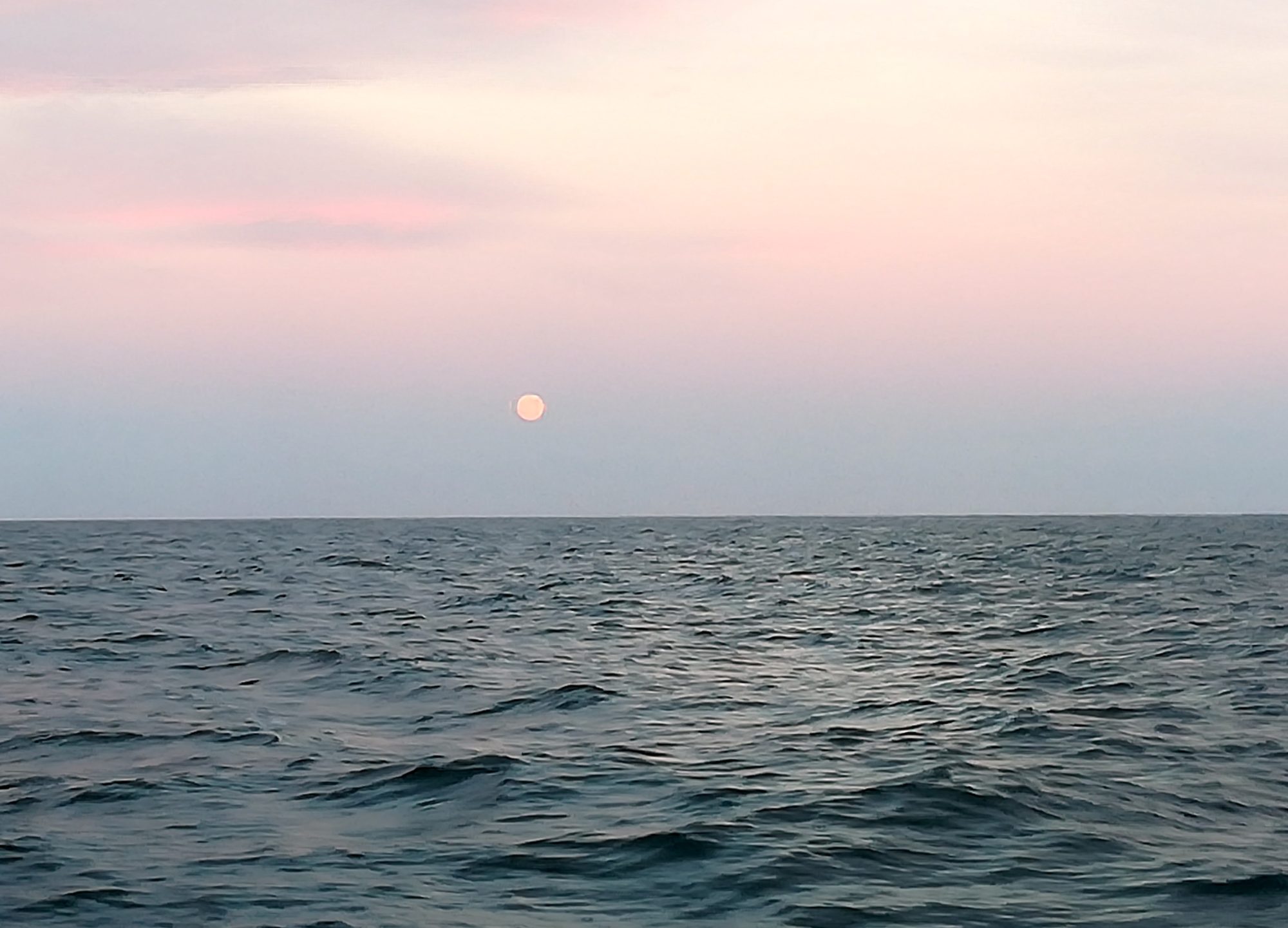 29.5./30.5., Dienstag/Mittwoch, 15/16. Tag: Wieder bester Wind aus NO, dass heißt es geht achterlich bis raumschots weiter. Das 2. ETMAL ist 127sm. 12:27 Überquerung des Nullmeridians, ab jetzt also die Breitenangabe in °W. Wieder Sonne,blauer Himmel und blaues Wasser – wunderschön. Auch der Sonnenuntergang toll und gegenüber der Vollmond am Himmel.