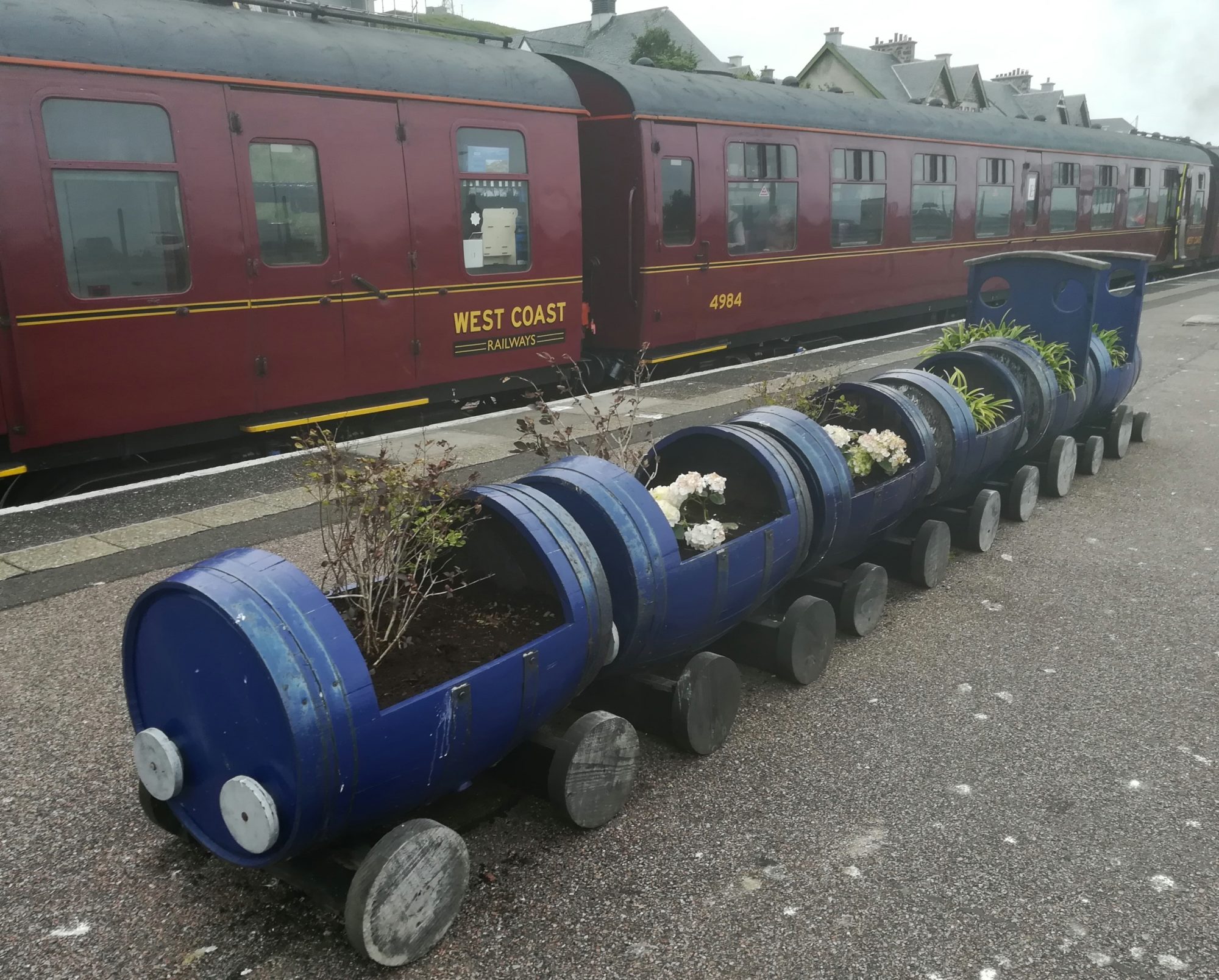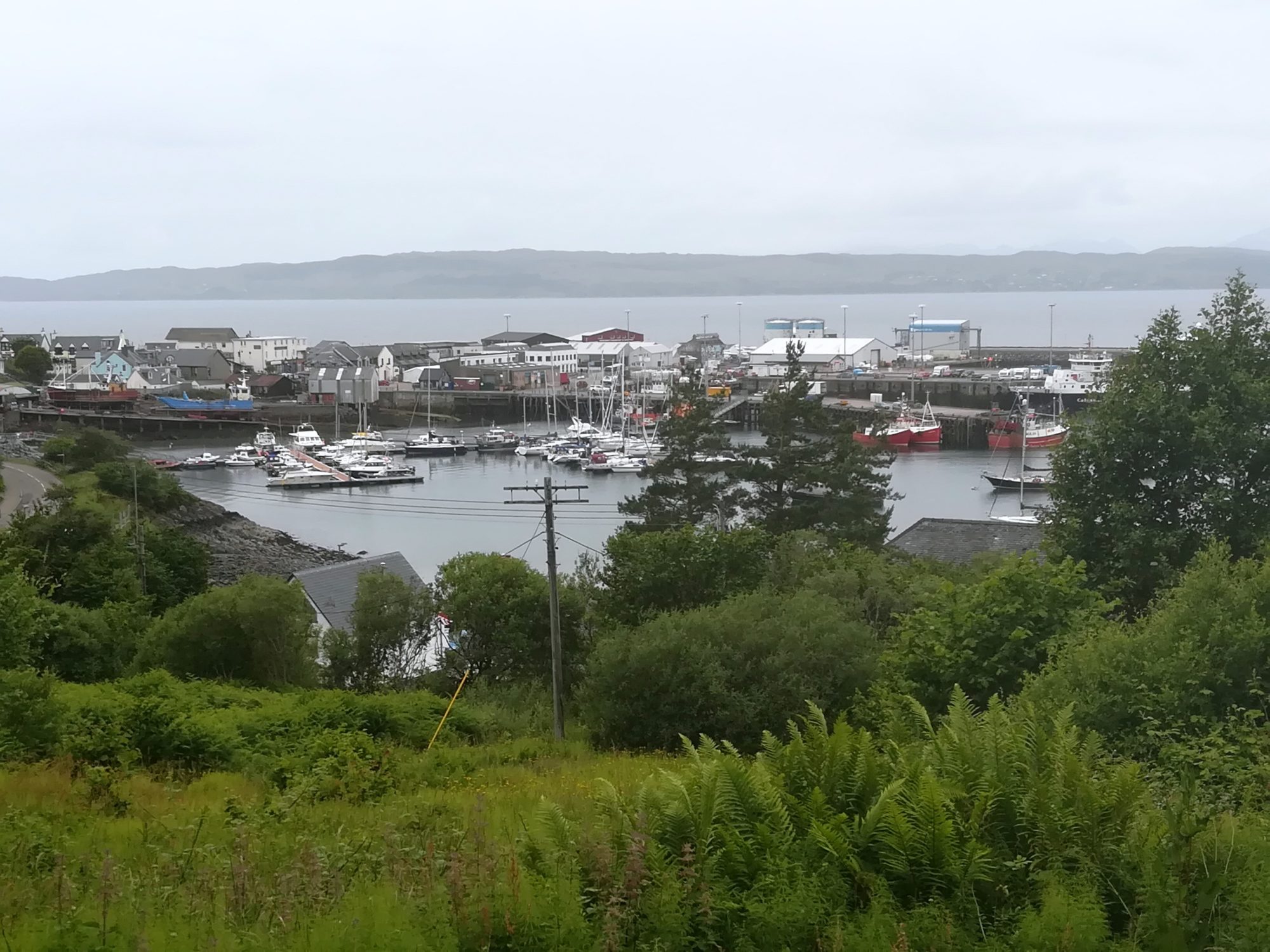 Die Inseln Muck und Eigg bleiben bb, im Panorama beide recht schön. 15:15 ist die Einfahrt von Mallaig erreicht, dreimal Rot übereinander lässt uns aber nicht einfahren. Zwei Fähren nacheinander sind im kleinen Hafen, wir müssen Kreise drehen. 15:45 sind die Lichter aus, wir fahren in den Hafen und haben das Boot nach10min am Schwimmsteg nach 33sm über Grund angebunden. (57°00,3’N 05°49,5’W). Nach etwas verspäteten Mittagessen und kleiner Pause geht es in den Ort, hier ist eine Endstation des „Jacobite Zugs“ (Fort William ist die andere). Eine 1-stündige Wanderung auf einem Rundweg oberhalb des Ortes bringt u.a. eine schöne Aussicht auf den Hafen.