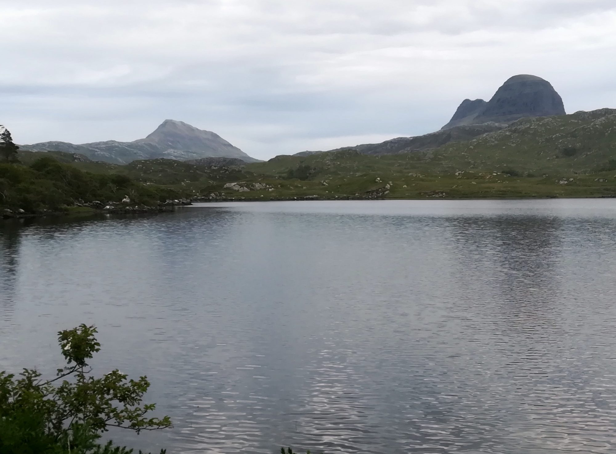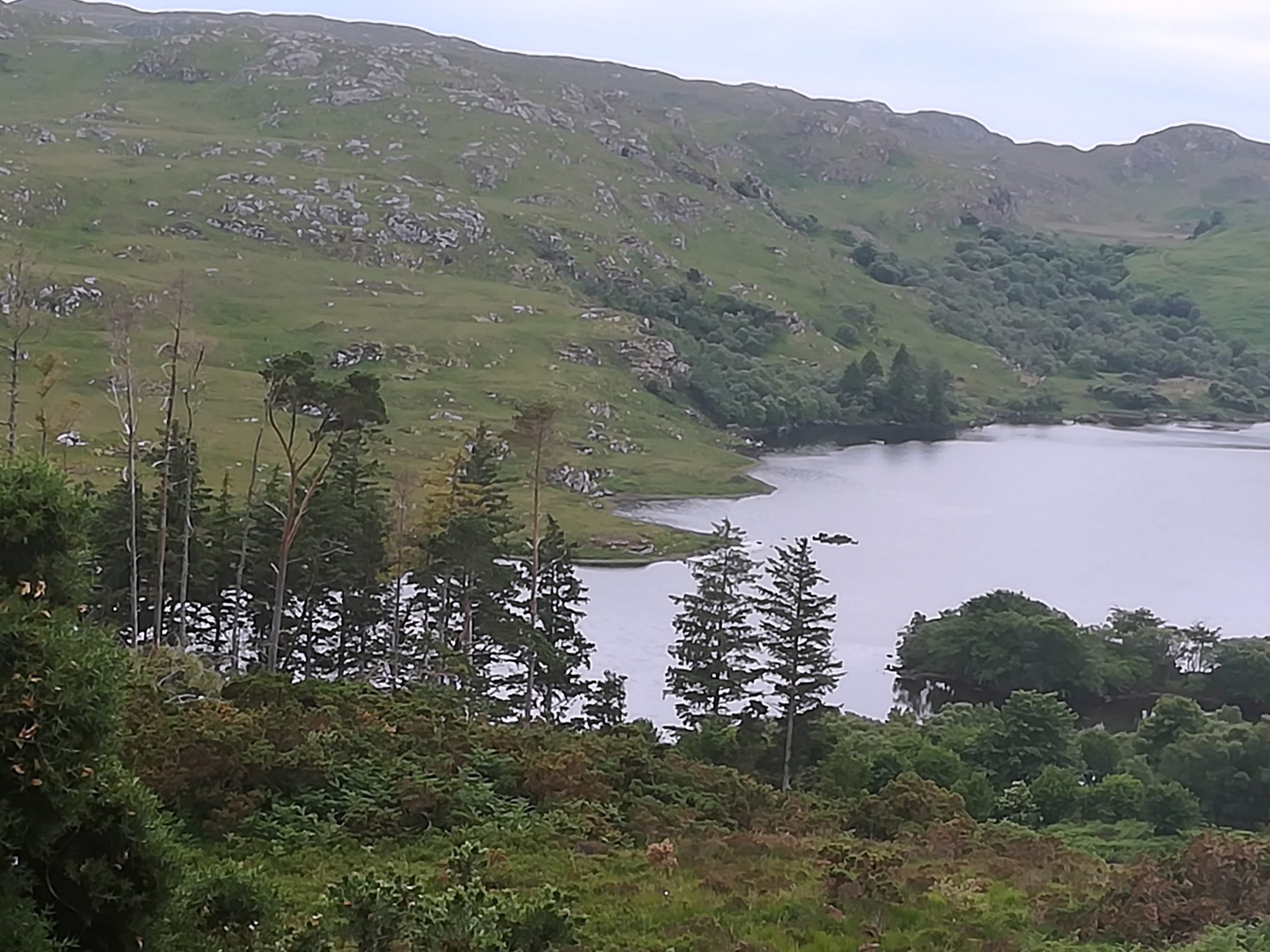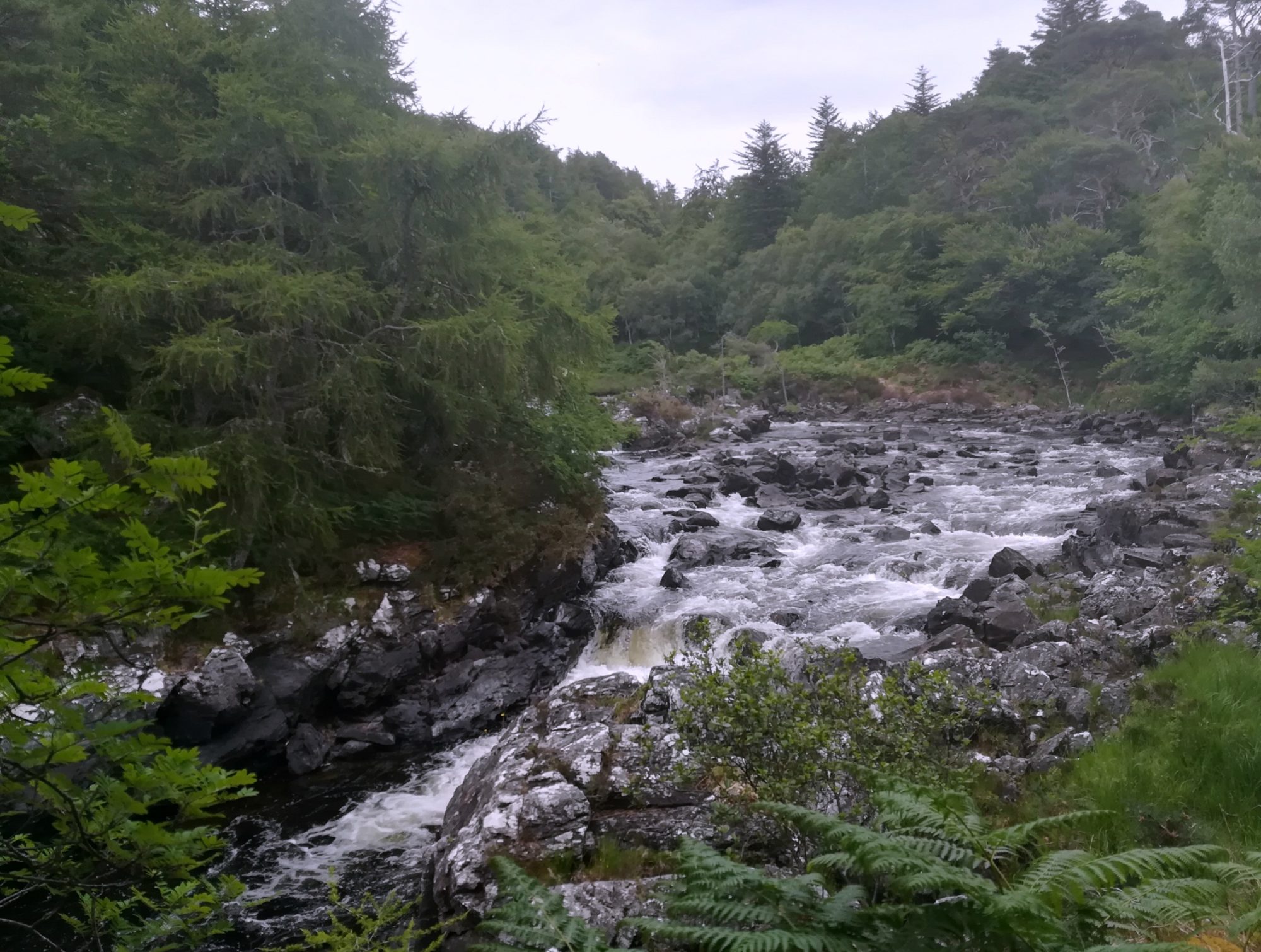 Mittagessen an Bord, dann geht es ausgeruht zur 2. Tour. Es ist wirklich kaum Wind und bewölkt. Unser Weg führt zuerst entlang des wildromantischen River Inver, später sind Wehre gebaut für das Angeln von Forellen. Dann geht es bergauf auf eine Hochebene mit schönen Blicken auf die Gipfel und in die Täler. Talabwärts erreichen wir einen Binnensee und dann noch Landstraße bis zum Boot.