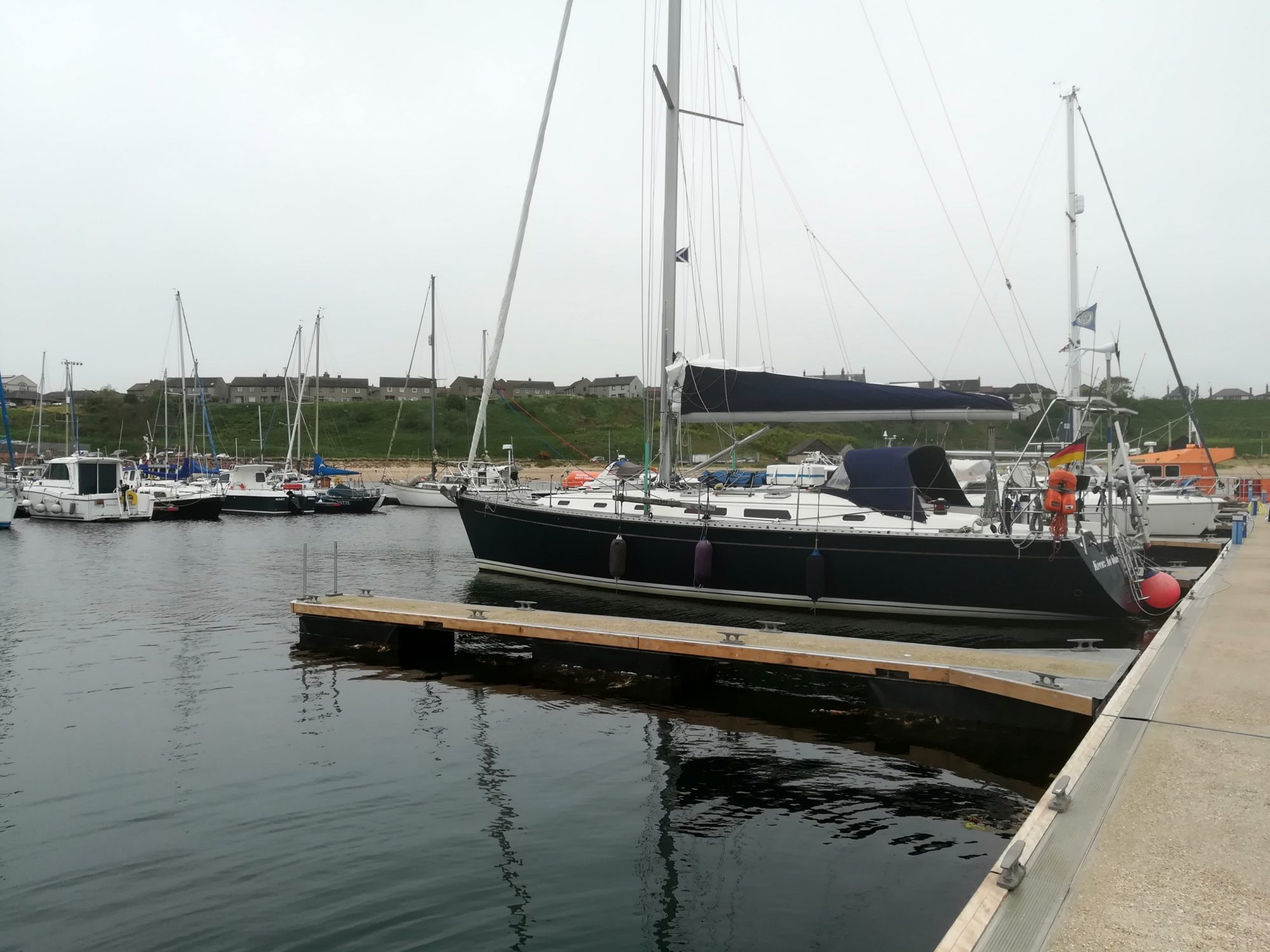 Zur Bekräftigung kommt ein Boot der Hafenwache und teilt uns mit, dass wir zum nächsten Hafen müssen, und der ist 28sm entfernt. Damit fällt leider der geplante Hafentag mit Besichtigungsprogramm in Aberdeen weg. Das einzig Positive ist, dass der Nebel etwas weniger wird und damit die Küste sichtbar. Gegen 17:00 kommt sogar die Sonne für eine Stunde zum Vorschein. Segelversuche scheitern sowohl an der Windstärke als auch -richtung. 21:16 ist die Hafeneinfahrt erreicht, nach 13¼h ist das Boot wieder angebunden. 68sm sind zurückgelegt. Wir sind in der Marina Peterhead (57°29,8°,01°47,5’W) angekommen.
