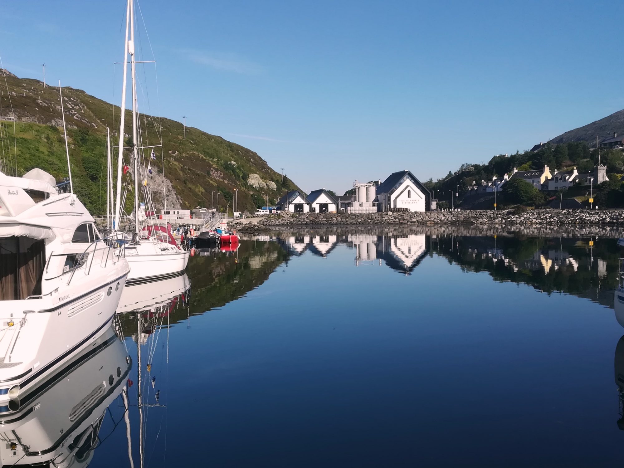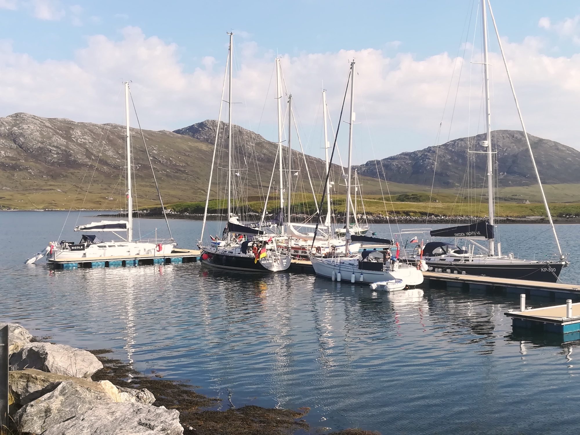 Eigentlich wollten wir heute nach Leverburgh, die dortigen Pontoons sahen uns aber nicht vertrauenserweckend aus. Deshalb in der Fahrrinne zwischen den vielen Inseln hindurch wieder zurück. 13:20 lohnt es sich, die Segel zu setzen, Wind aus Süd mit rund 8kn – wir kreuzen entlang der Küste von North Uist. 16:00 ist der kleine Hafen von Lochmaddy/North Uist (57°35,8’N 07°09,5’W) erreicht. Ortsbesichtigung und kleine Wanderung folgen. Es gibt hier viele kleine Lochs, eine urische Landschaft besonders bei Niedrigwasser. Und 19:00 sind hier noch 21°C bei Sonnenschein – was für ein Wetter hier !!!!