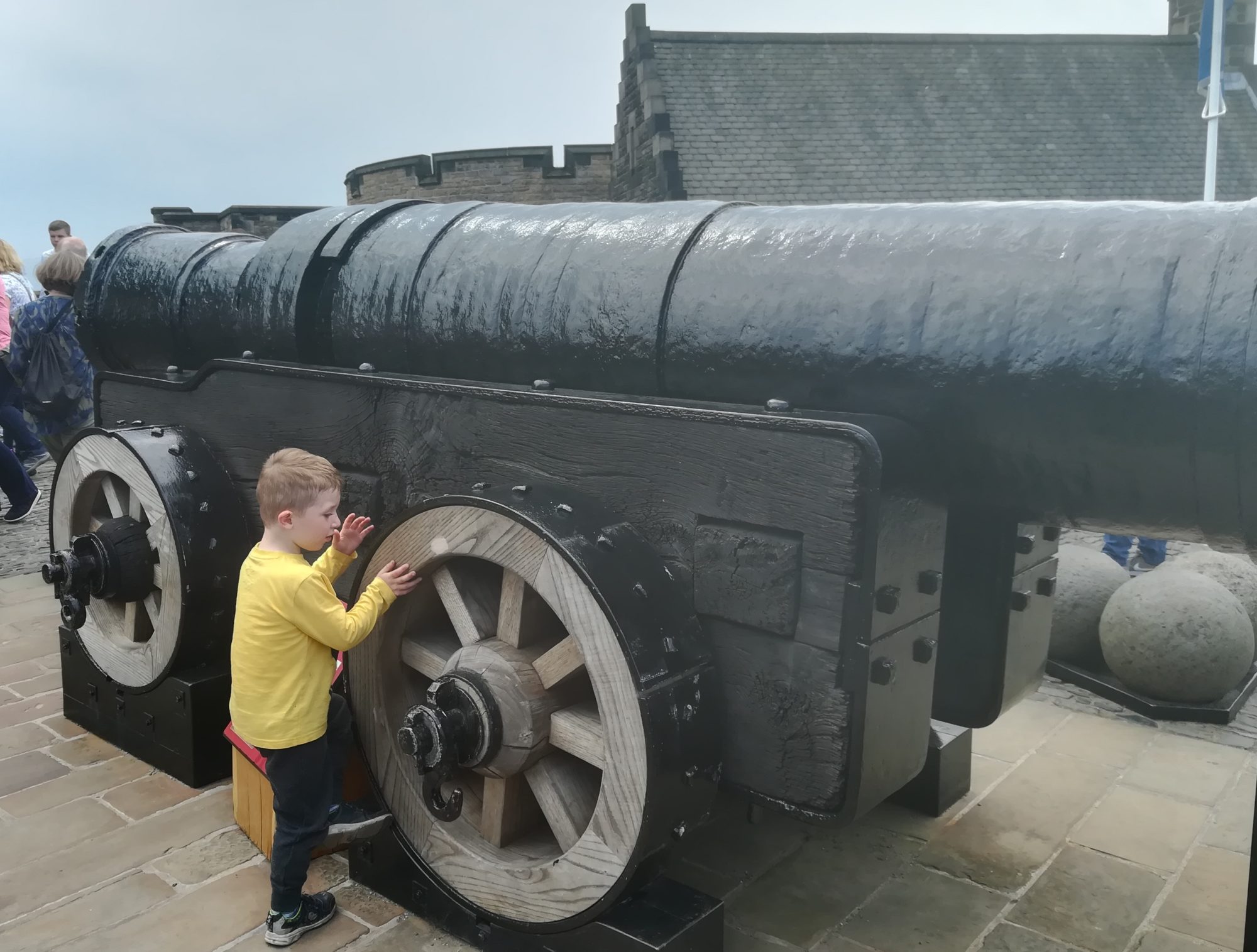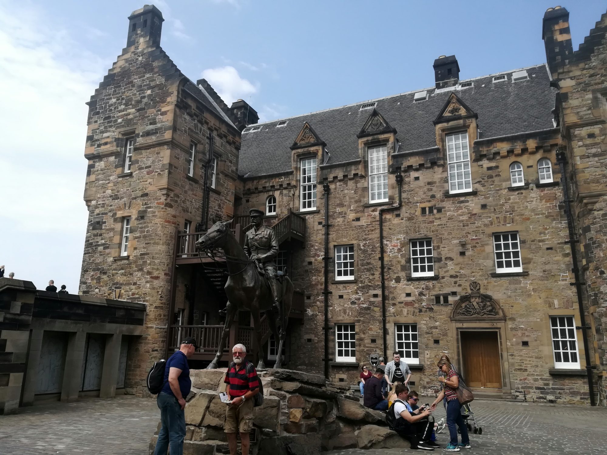 Wir sind für 15£/ Person auf Burgbesichtigungstour. Das Abfeuern der Ein-Uhr-Kanone haben wir knapp verpasst, da standen wir noch nach einem Ticket an. Zuerst laufen wir in Richtung des Nationalen Kriegsmuseums mit dem Reiterdenkmal von Earl Haig und schöner Aussicht von der Burgmauer auf Usher Hall und….