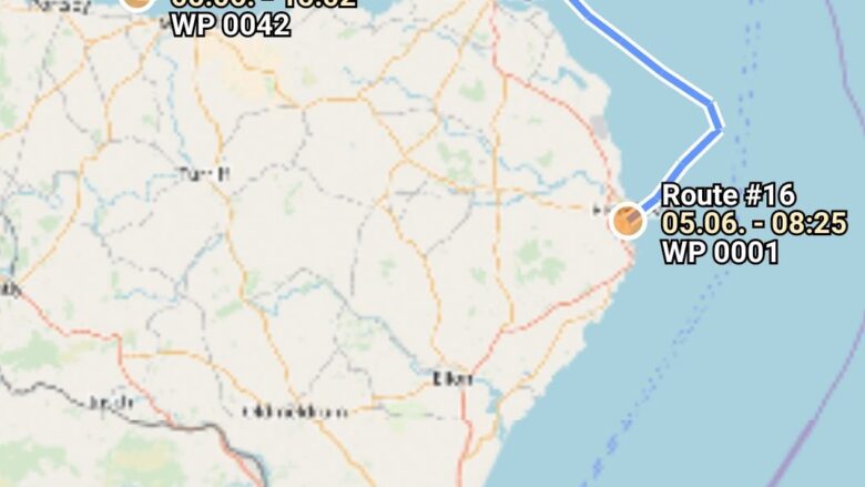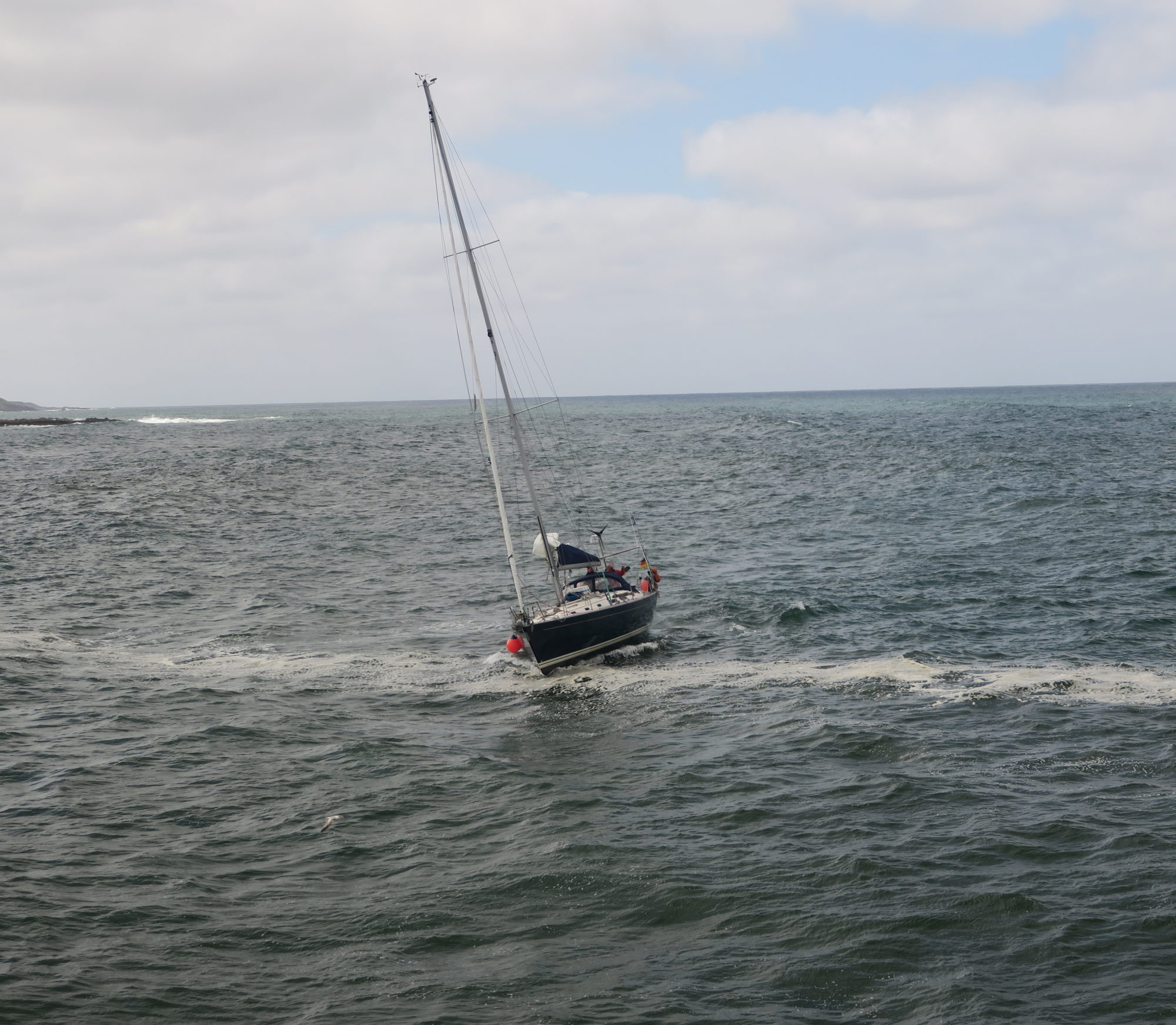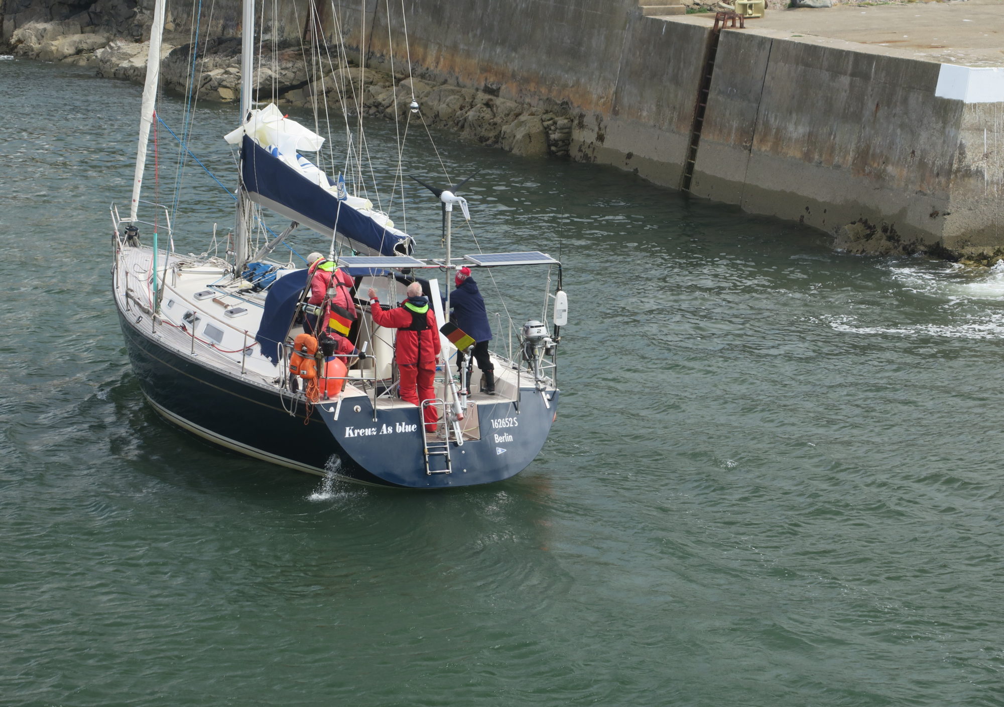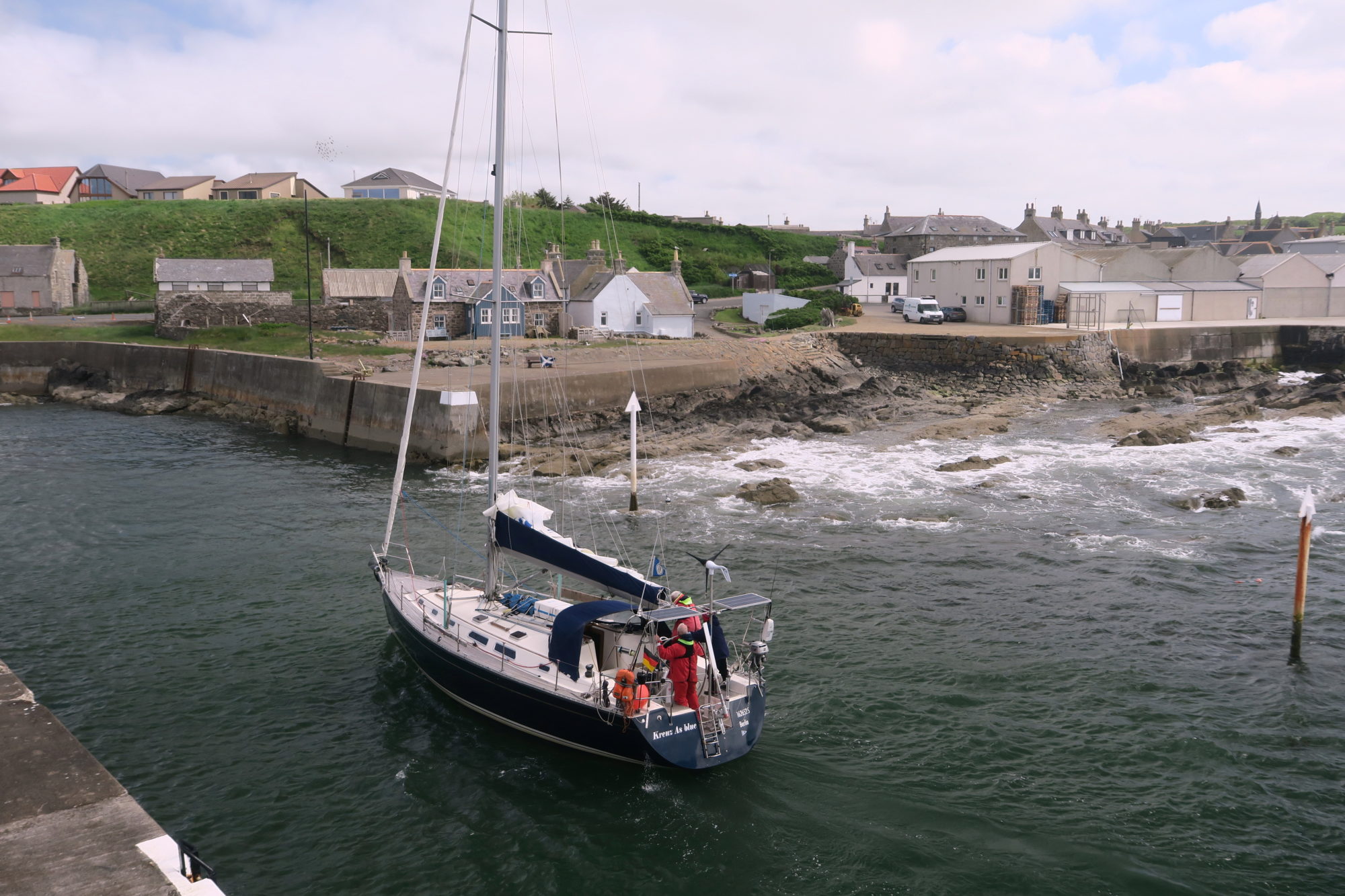 5.6., Dienstag, 22. Tag: 8:25 abgelegt und mit fast Vollgas aus dem Hafen (draußen erwartet uns eine ziemlich hohe und kappelige Welle) und dann auch zum Segelsetzen. Groß gleich 2xgerefft, Fock voll dazu und schon rauschen wir hoch am Wind ab. Nach einer ½ h eine Wende, 10:00 ist die Höhe von Rattray Hd. erreicht, wir können auf 300° abfallen.   Gegen 12:00 liegt Fraserburgh querab, neuer Kurs 281°. Der Wind bleibt: 14kn aus NNO, ab 13:00 segeln wir mit achterlichem Wind. 15:00 ist Whitehills erreicht und dann geht es in die sehr schmale und dann rechtwinklige Einfahrt (war ziemlich aufregend). 15:30 ist das Boot am Besucher-Schwimmsteg (57°40,8’N 02°34,6’W) fest, wir können aufatmen!! Heute sind 41sm in 7h fast nur segelnd zurückgelegt.
