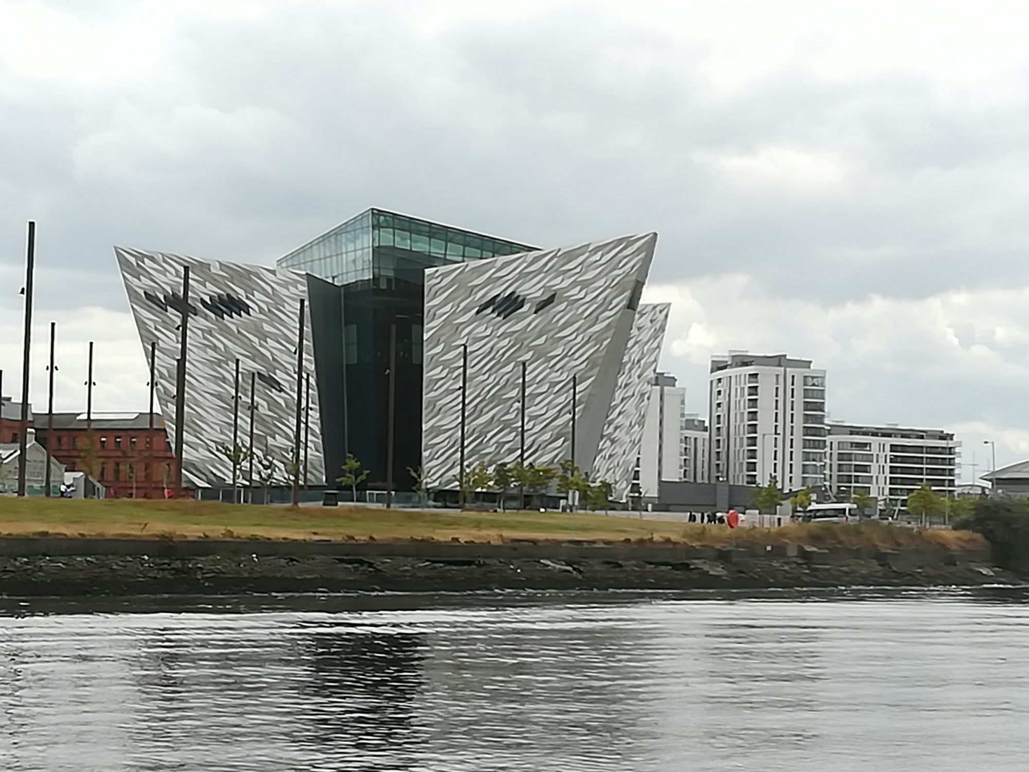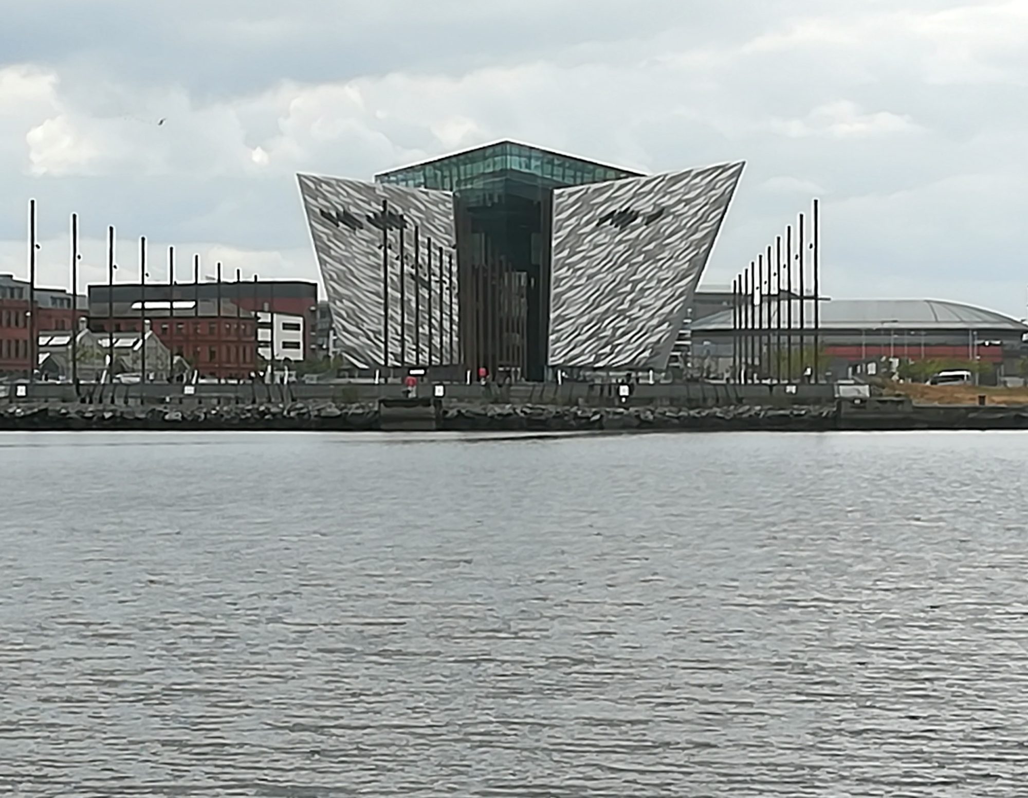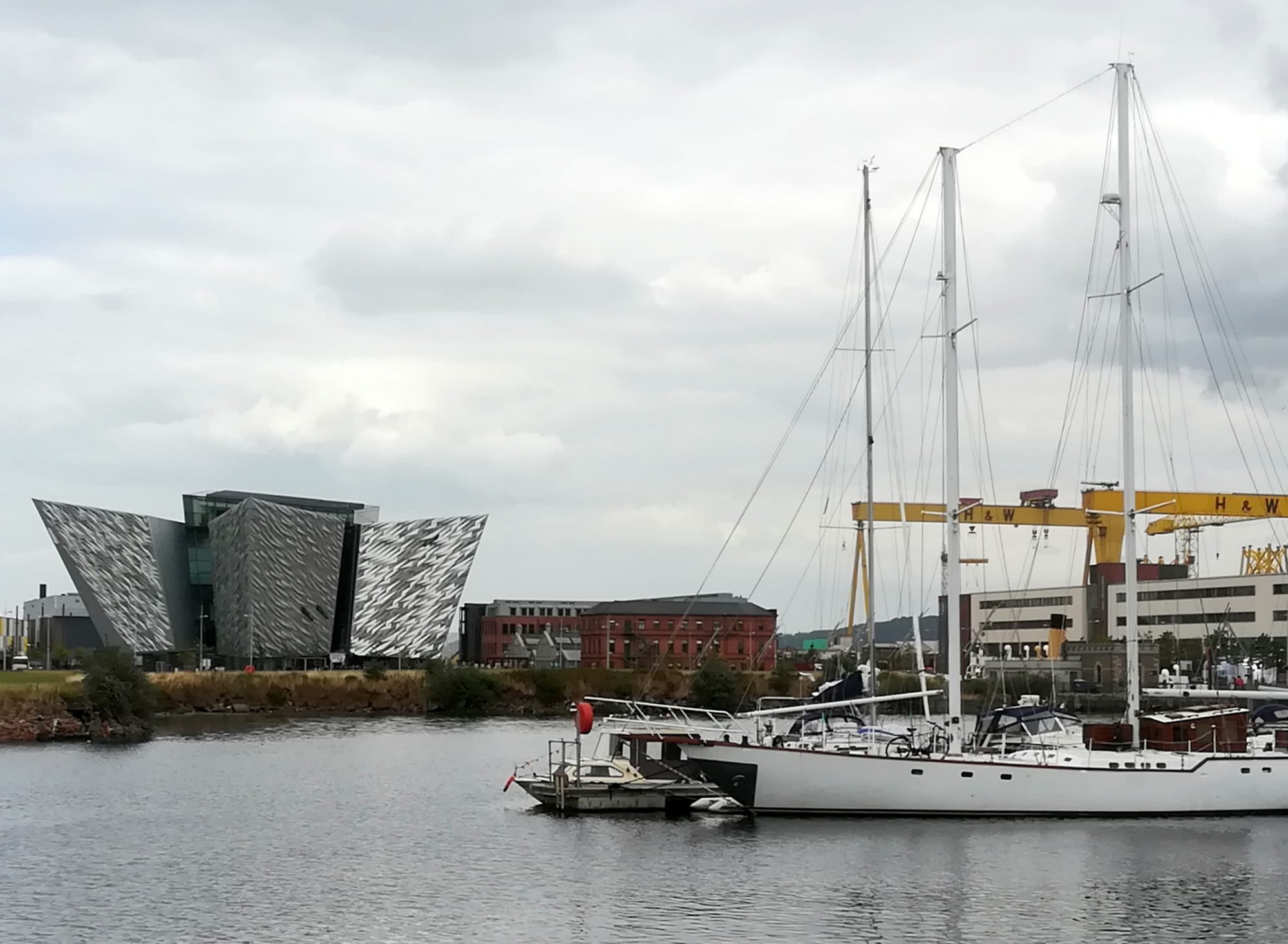 Also es bleibt weiter unter Hochdruckeinfluss. Von den 30sm konnten wir heute 12sm einigermaßen segeln, u.a. hat uns der Schiebestrom von bis zu 2kn gut vorwärts gebracht. Im Belfast Lough ging dann gar nichts mehr. Man muss möglichst in der Fahrrinne bleiben und den Großschiffverkehr beachten. Gegen 12:30 sind wir im Hafenbereich mit Container- und Kreuzfahrtschiffen, 13:20 ist das Abercorn Basin Belfast erreicht, an einem Finger-/Schwimmsteg finden wir Platz (54°42,2’N 05°46,=’W). Vorher sind wir an dem einen Schiffsbug nachempfundenen silbernen Außenmauern des Titanic Museums vorbeigefahren. (2012 fertiggestellt). Auf dem ehemaligen Gelände der Docks von „Harland&Wolff“ wurde das neue Titanic Quarter errichtet, dort wo die Titanic gebaut wurde.