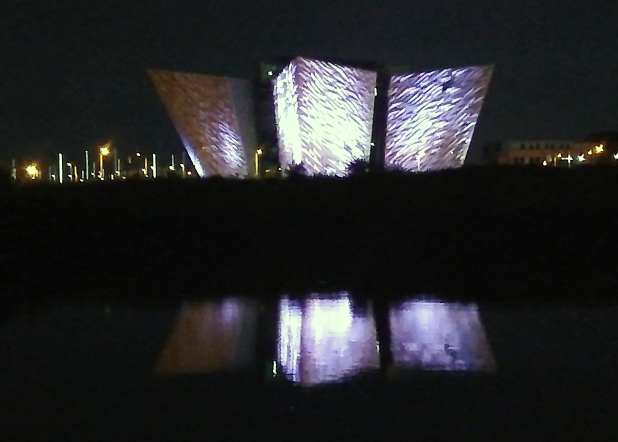 Und spät abends haben wir vom Boot aus diesen Blick auf das Titanic Museum.
