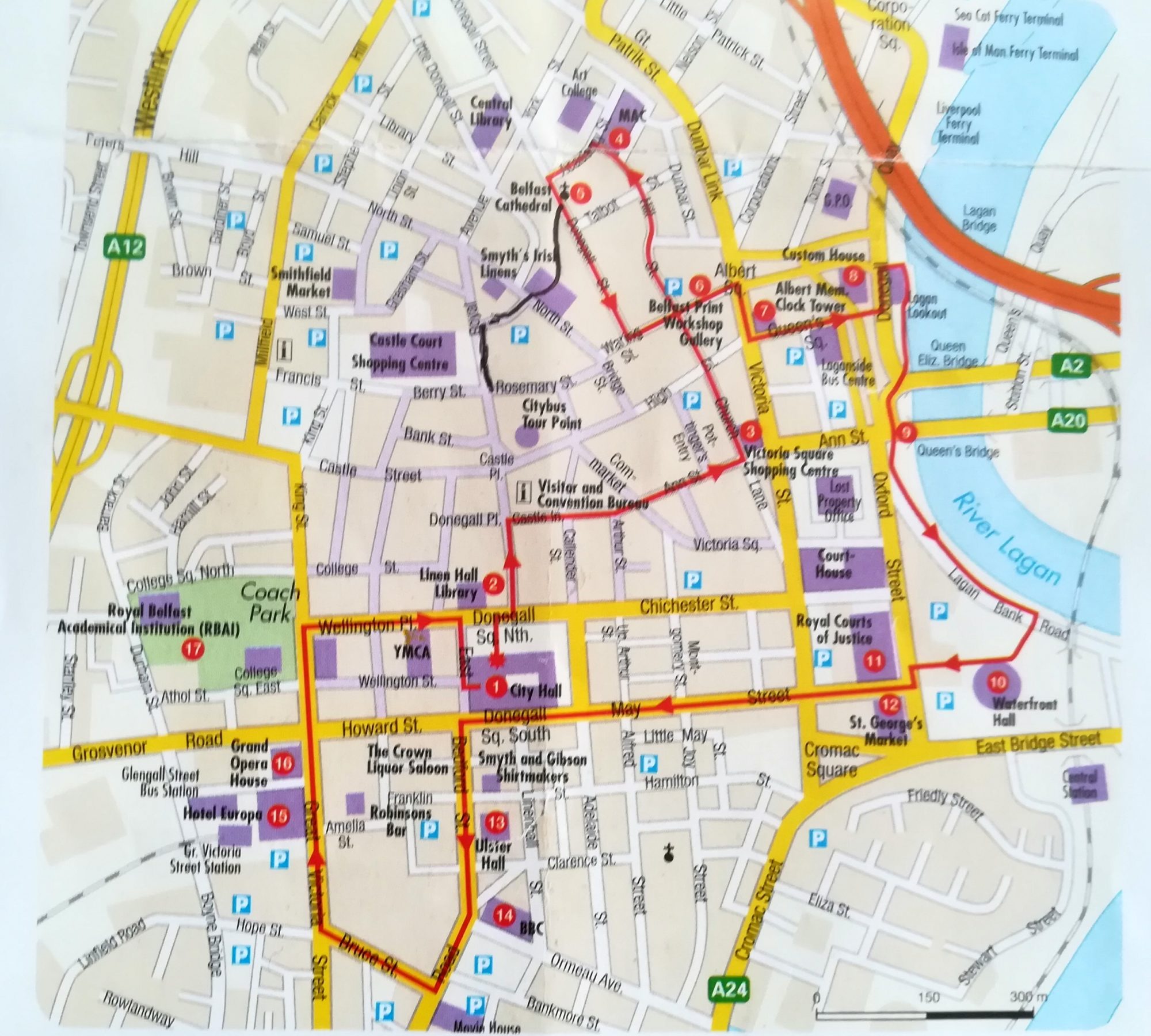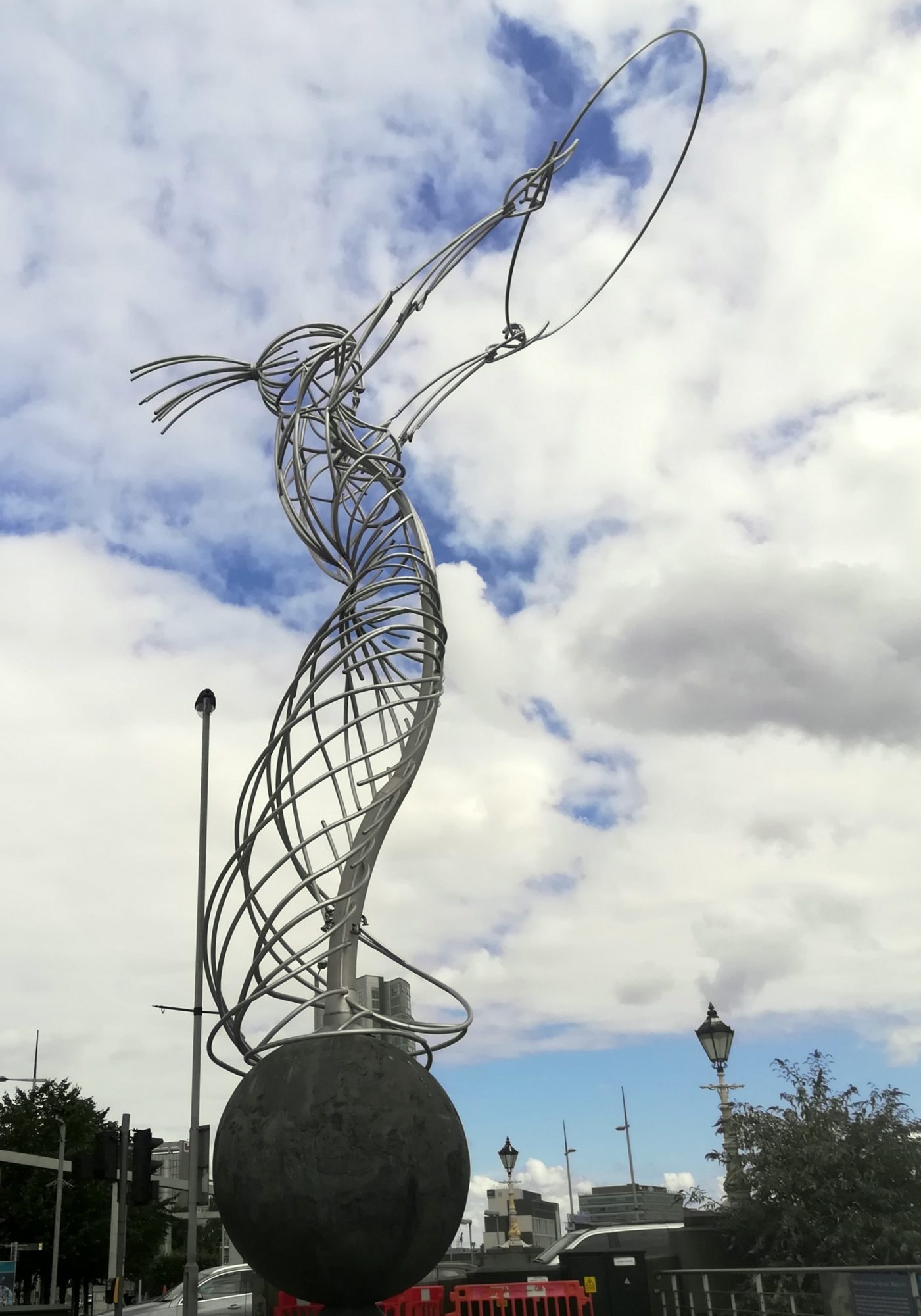 19.7., Donnerstag, 66. Tag: Heute wieder ohne Regen – sicher ungewöhnlich für Belfast. Stadtbummel nach Vorschlag des Reiseführers zu Fuß. Die besonderen Sehenswürdigkeiten zähle ich einfach mit Kommentar und Bild auf. An der Queen’s Bridge die Skulptur Harmonie of Belfast, weiter der St. Georg’s Market (leider nur fr. bis so. geöffnet, dann aber mit Livemusik),