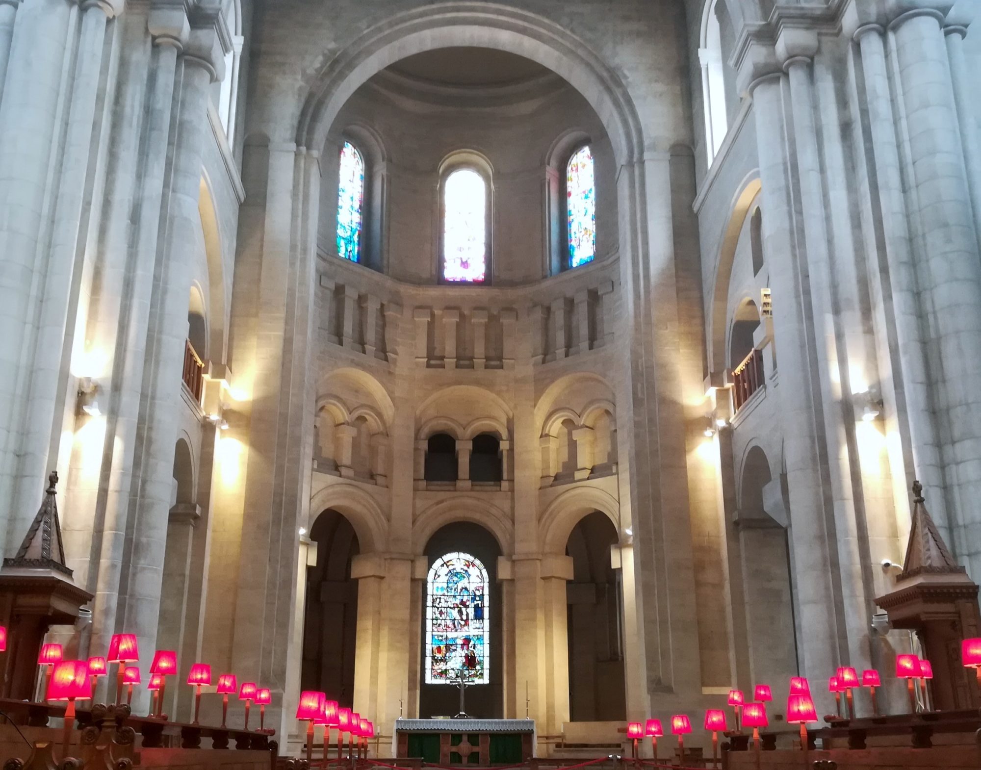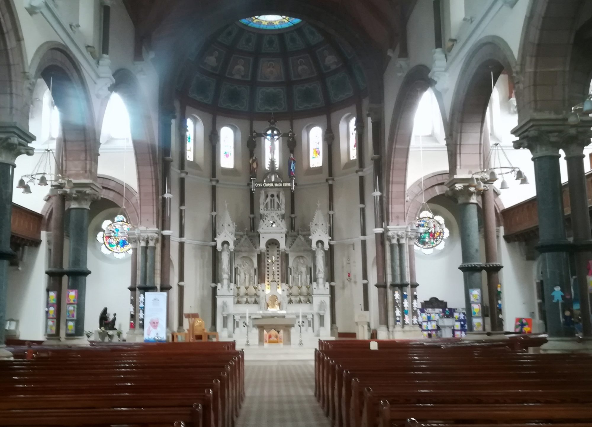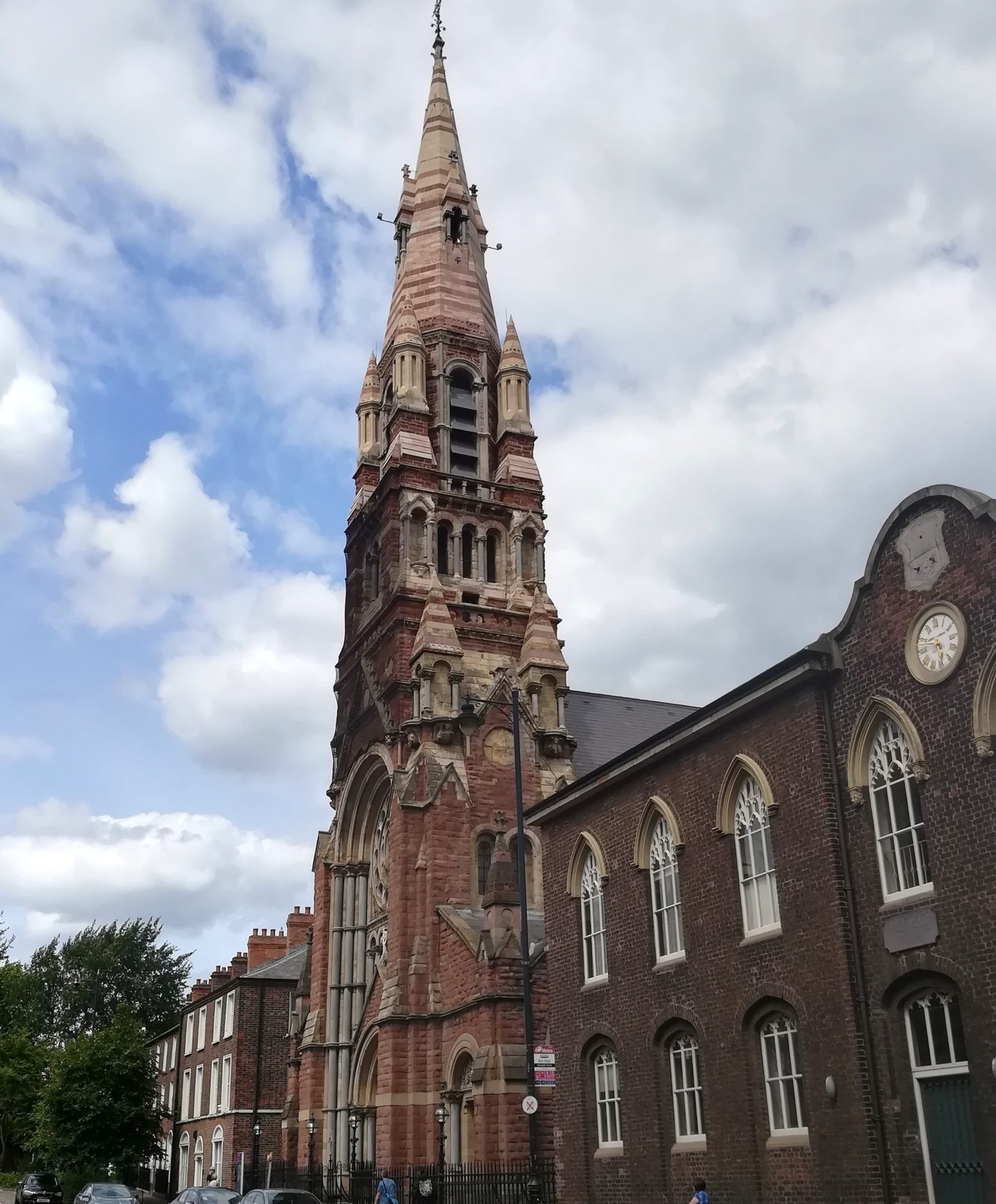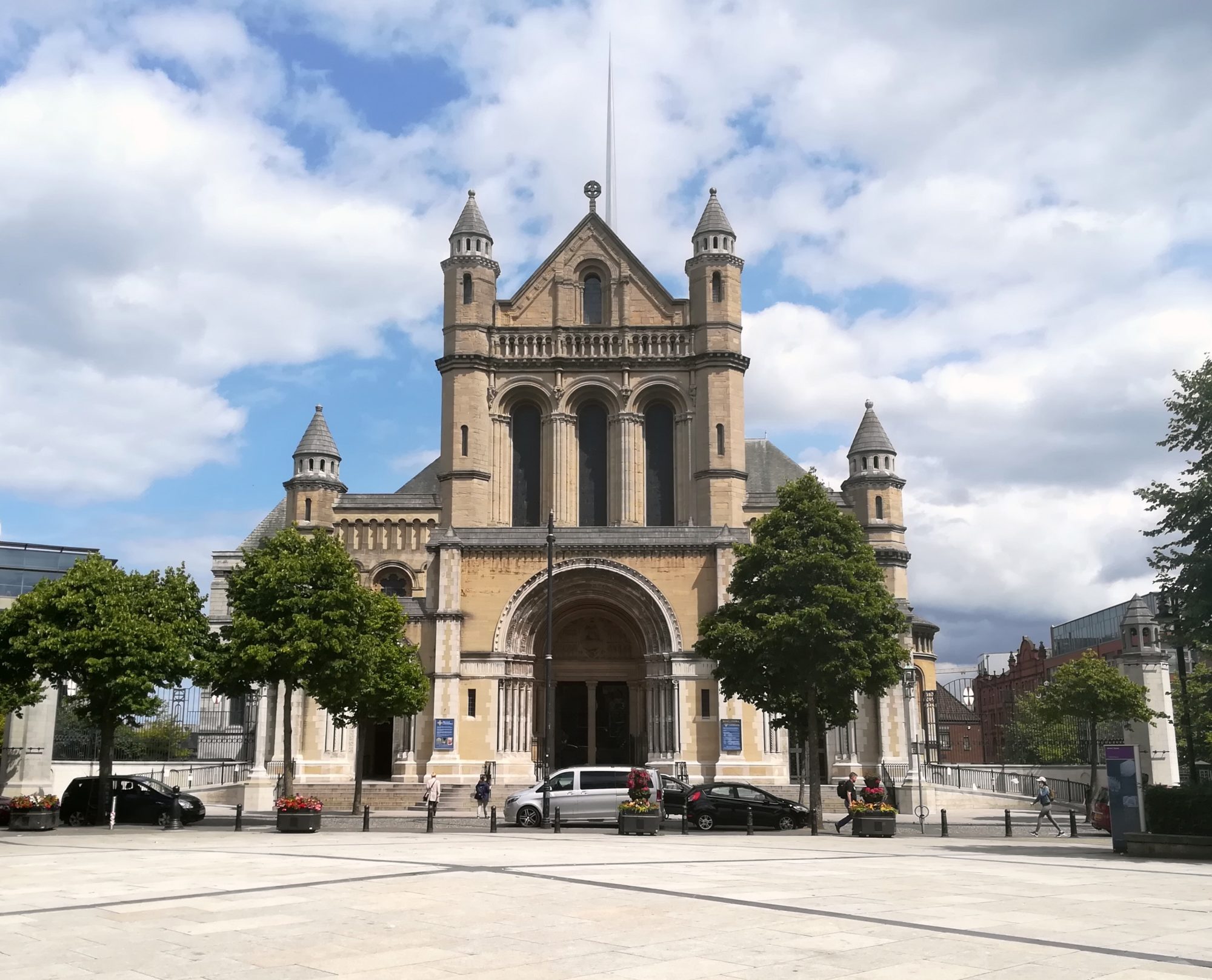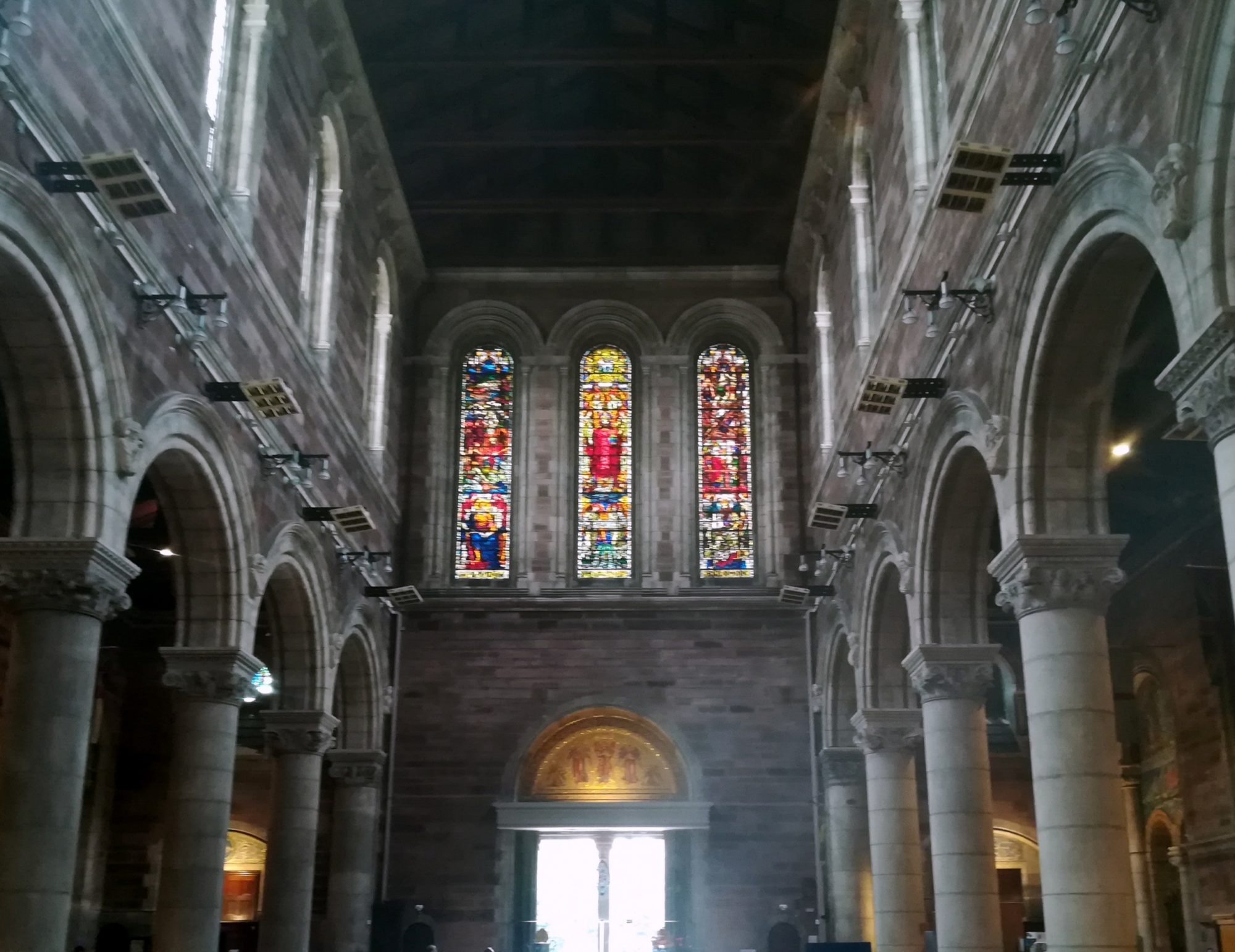 Und an den vielen Kirchen vorbei, zwei nehmen wir uns vor. 1) die protestantische neoromanische Belfast Kathedrale (von außen und innen sehr sehenswert, mit Eintritt) und 2) die katholische Kirche St. Petrick (auch ziemlich groß, aber total leer).