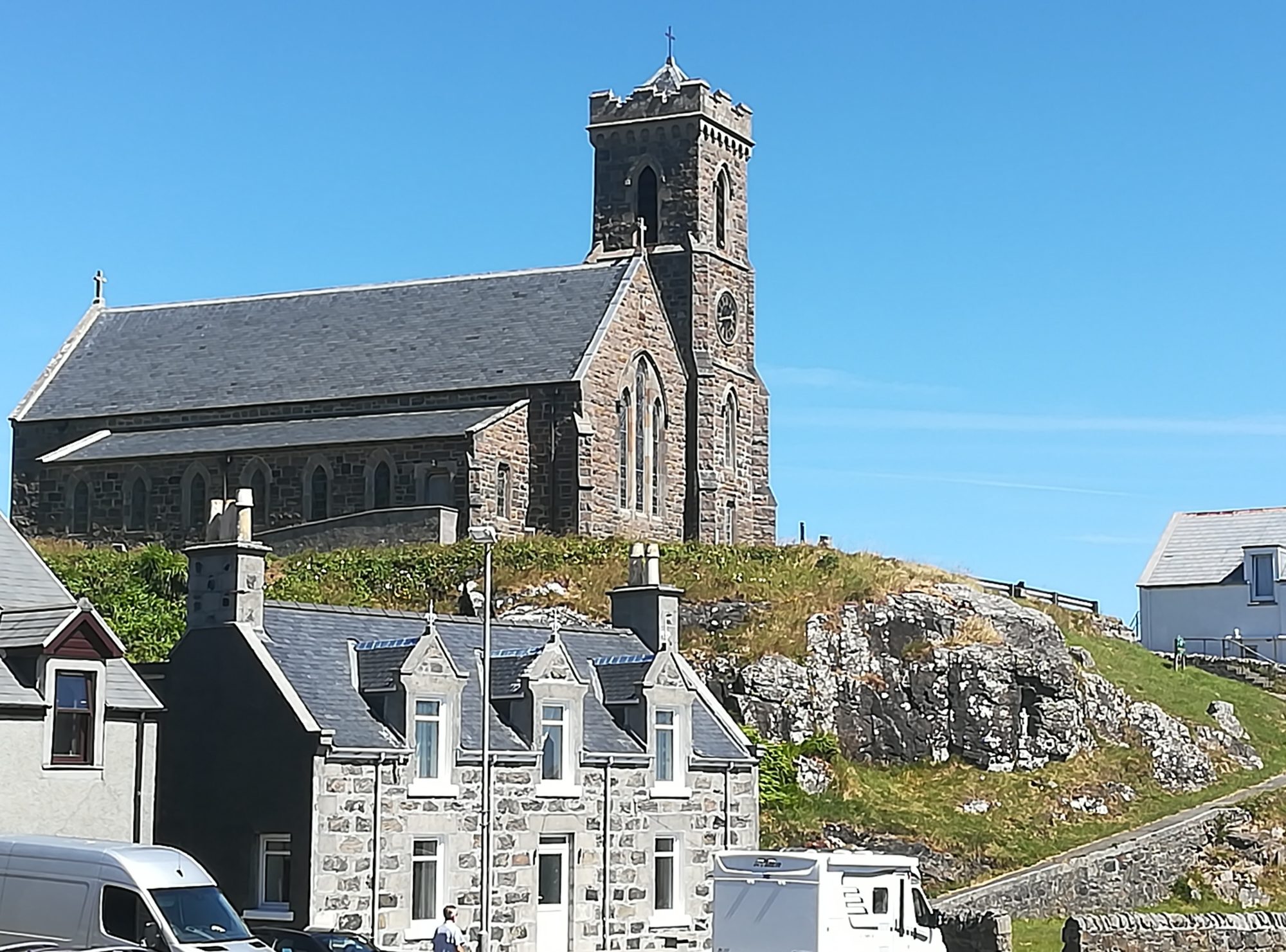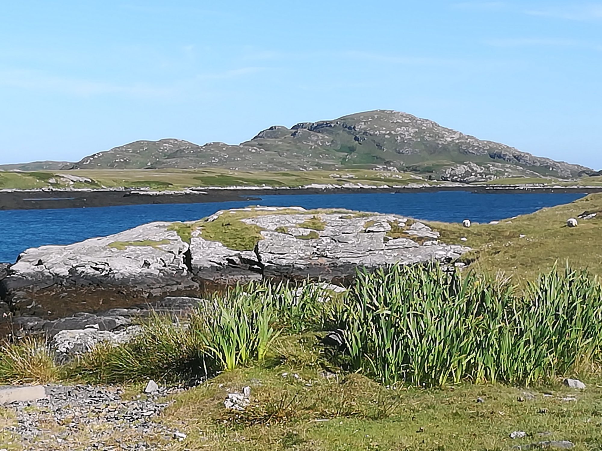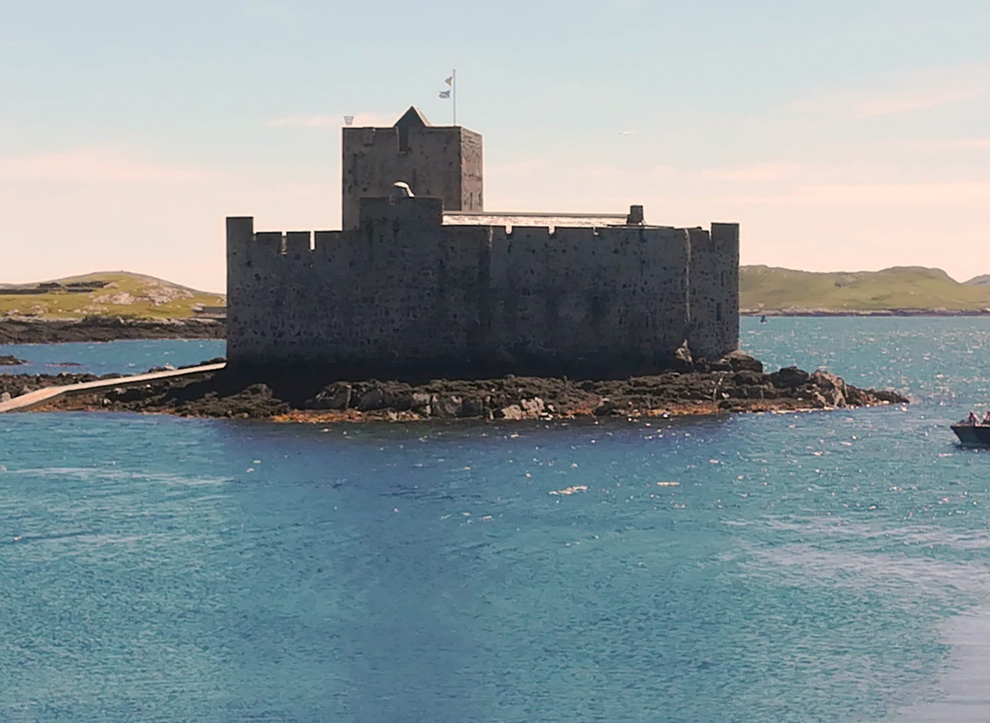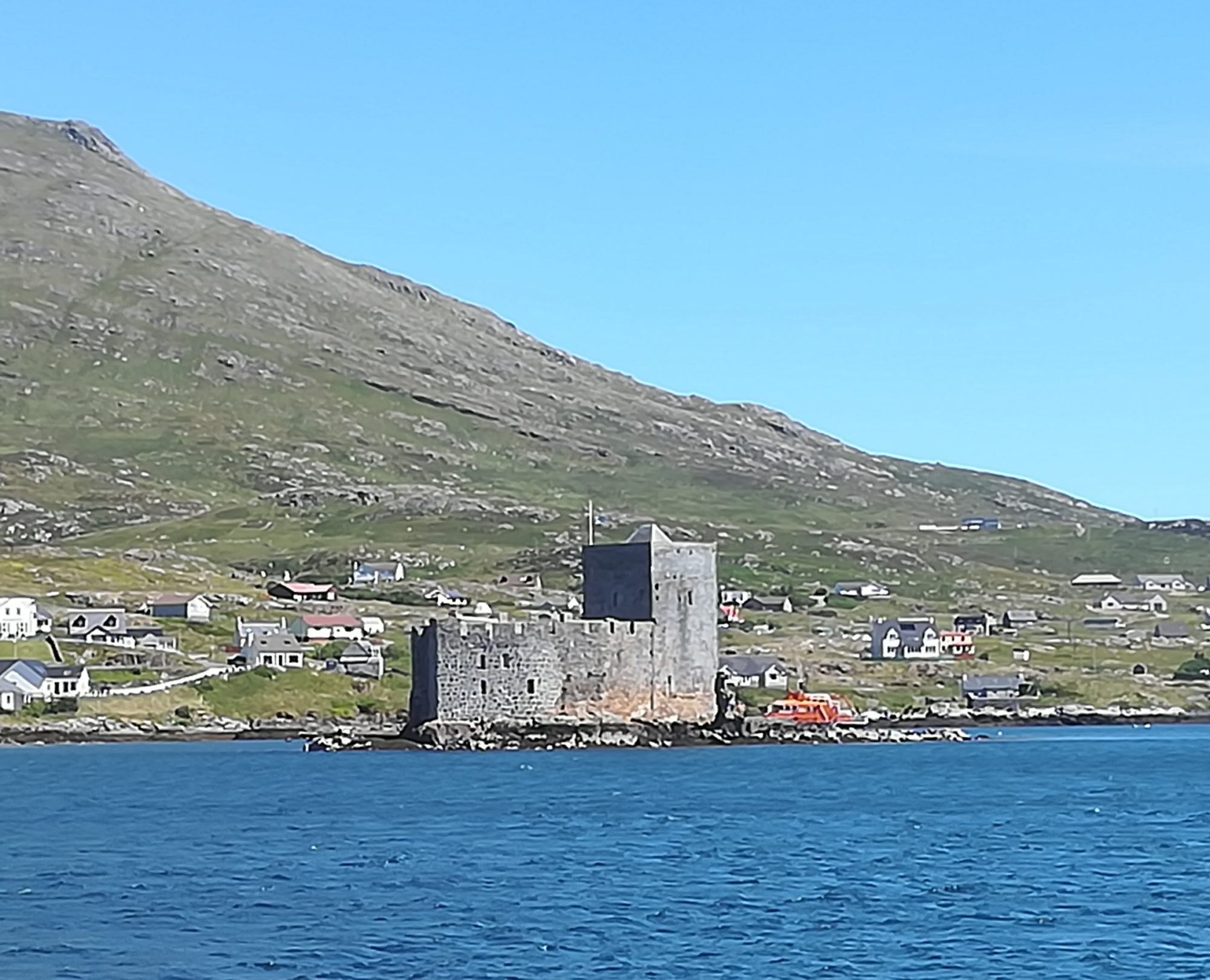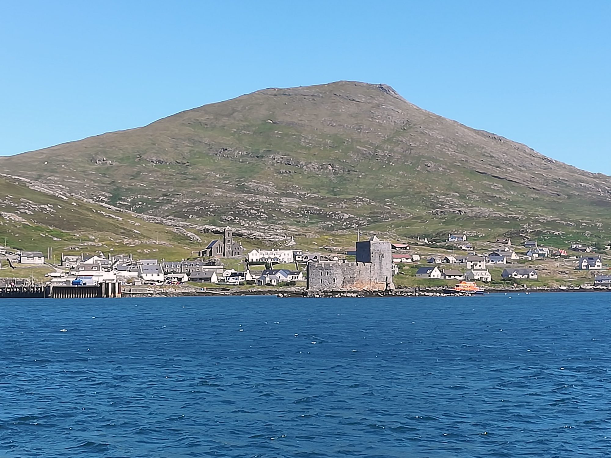 2.7., Montag, 49. Tag: Wunderbares Segeln: Sonne, blauer Himmel, Wind, schöne Küste. Wir segeln weiter auf The Sea of Hebrides entlang von South Uist, Eriskay und Barra, die Insel Skye bb am Horizont. Wind kommt von NNO mit ~12kn, in nur 4¼h sind die 20sm zurückgelegt. Schön schon vom Meer aus die weißen Sandstrände von Vatersay und die Berge von Barra. In Castlebay/Barra legen wir an einem Schwimmsteg an, eine ziemlich große Anlage – allerdings ohne Toilette und Dusche. 30£ sind trotzdem zu zahlen. Das Kisimul-Castle auf einer kleinen Insel in der Bucht kann man zwar besichtigen, es soll sich aber nicht besonders lohnen.
