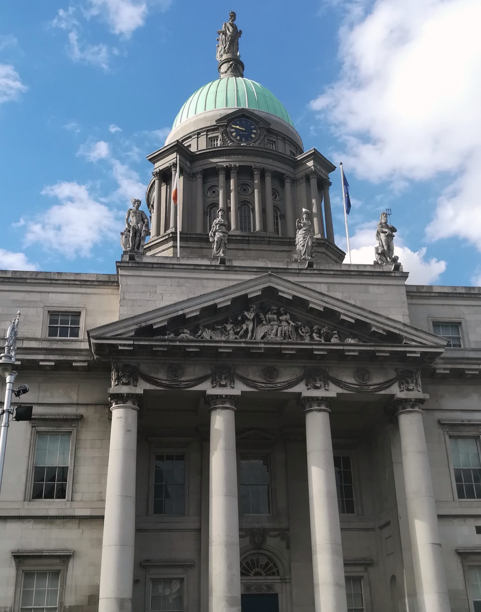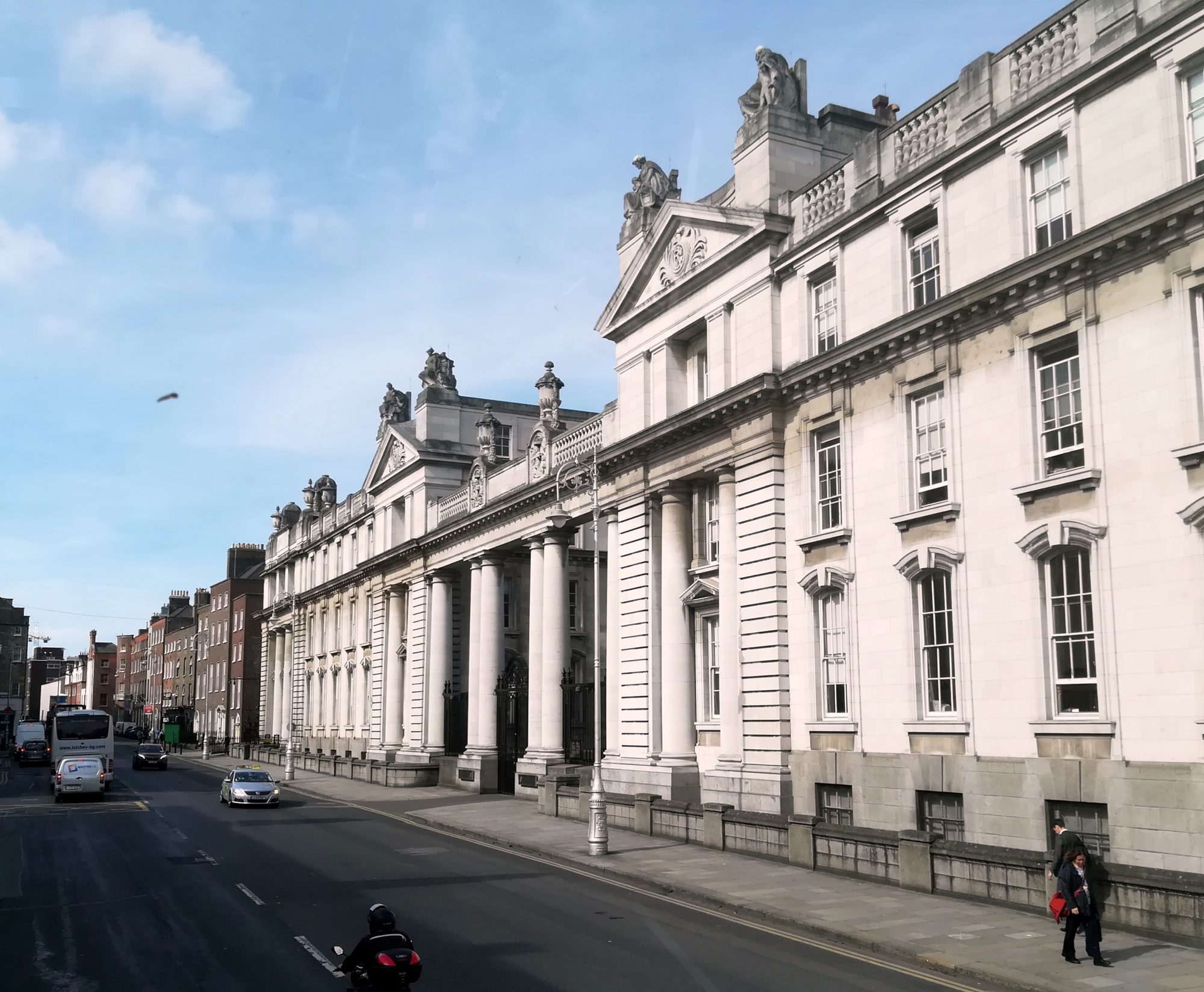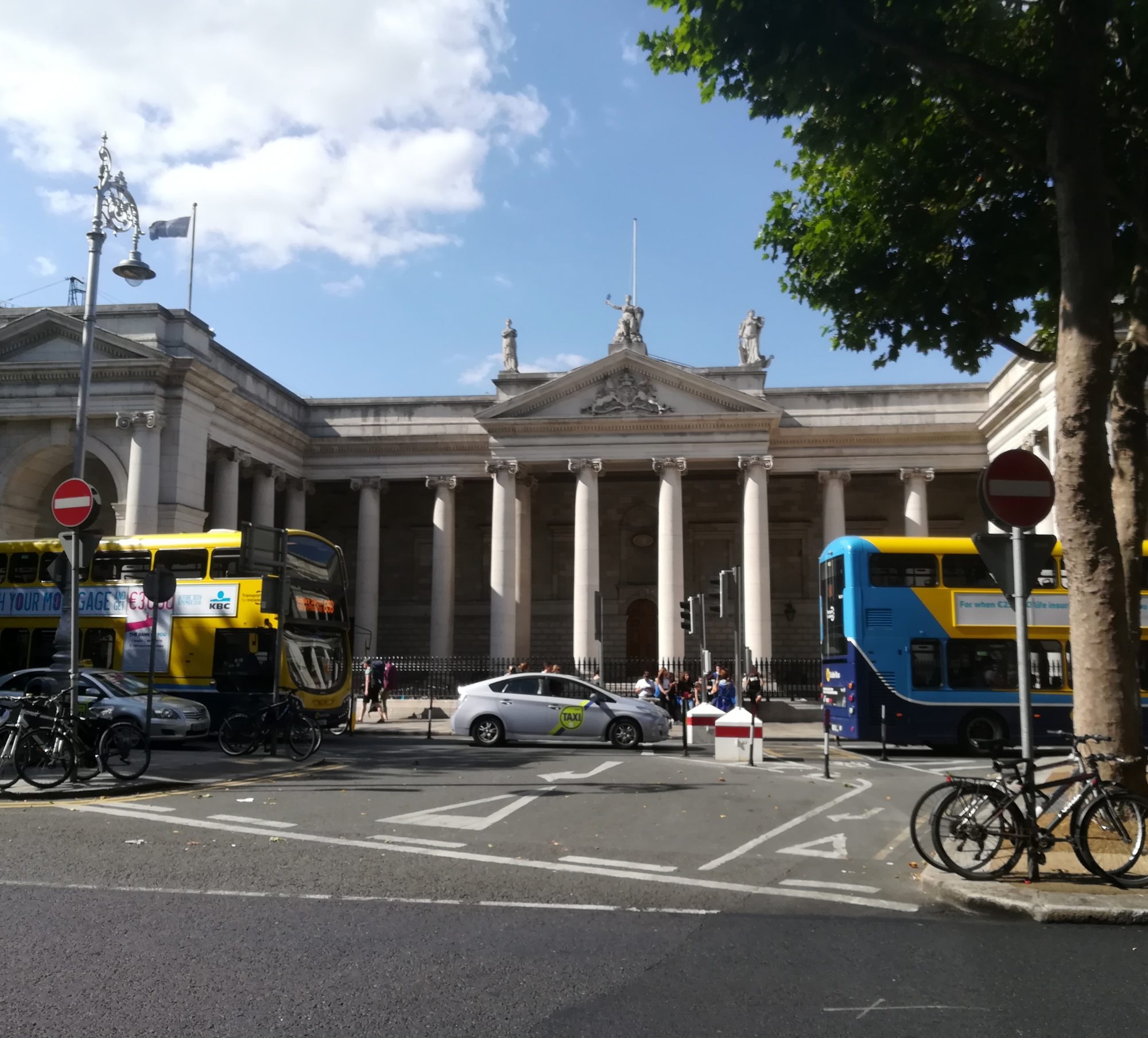 gleich gegenüber das imposante Gebäude der Bank of Irland (ursprünglich gebaut als Tagungsort des irischen Parlaments), das Leinster House (in dem heute die beiden Kammern des irischen Parlaments tagen),