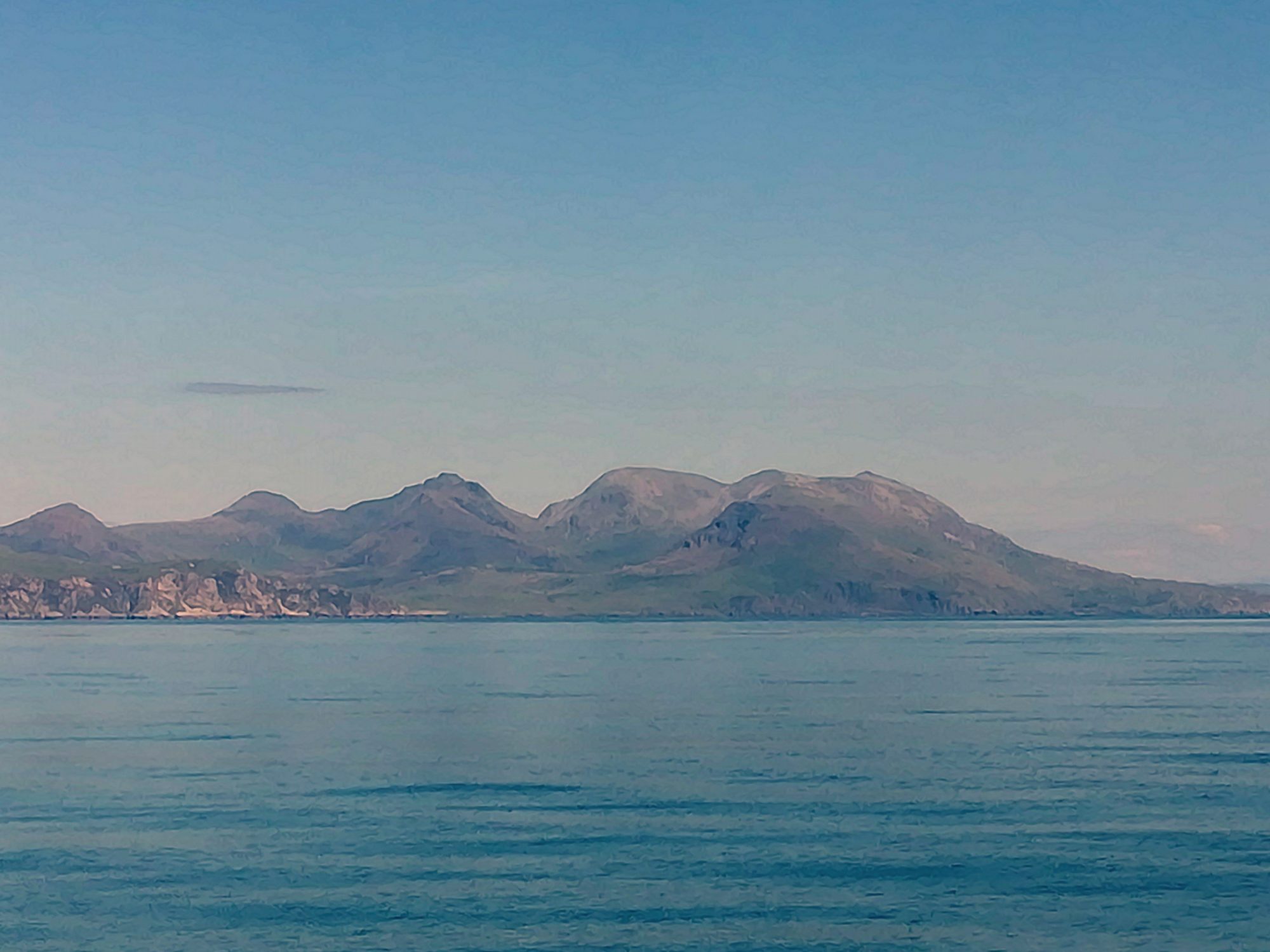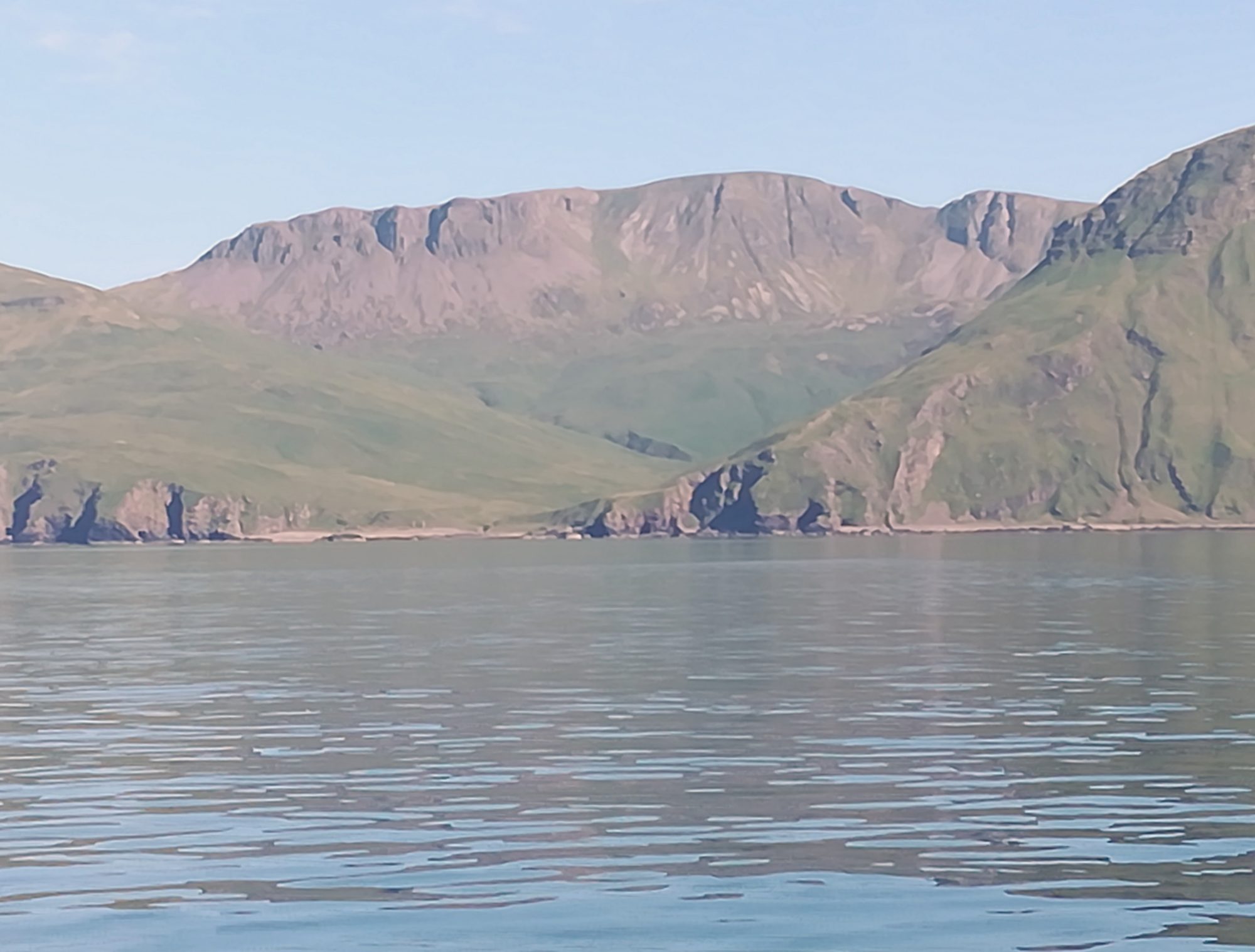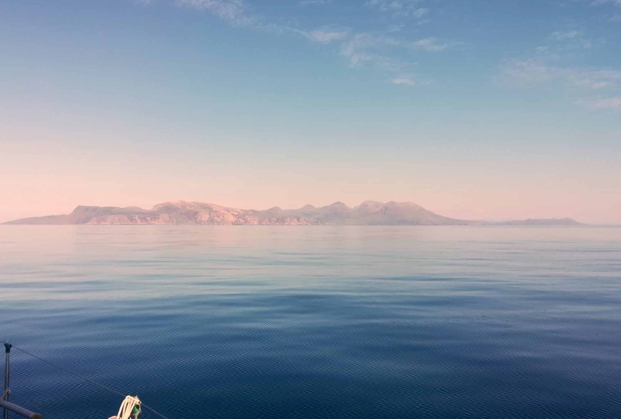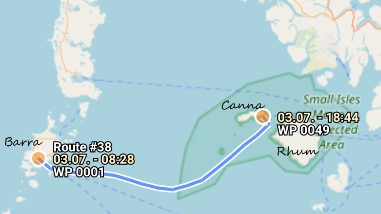 3.7., Dienstag, 50. Tag: Heute ein sonniger Tag, bis 15:00 mit Wind mit 6 bis 8kn, zuerst aus NO, dann auf N drehend. Hoch am Wind segelnd verlassen wir die Äußeren Hebriden in Richtung Small Isles. Unser heutiges Ziel eine der Vulkaninseln vor der schottischen Westküste, laut Reiseführer die reizvollste. Unterwegs neben uns mehrfach Delfine und Seehunde. Die Sicht ist gut, Skye und Rhum mit ihren hohen Gipfeln sind schon bald in Sicht. Ab 15:00 wird The Sea of Hebrides spiegelglatt, die letzten 13sm muss der Motor brummen. 17:15 ist die Insel Rhum (schön die steil abfallenden Berge) querab, 17:40 die Bucht zwischen Canna und Sanday erreicht – alle Mooringtonnen sind besetzt. Und unser Anker lässt sich nicht bewegen, Anschlüsse sind korrodiert. Die beiden Männer schaffen es, der Anker fällt nach 30min (57°03,3’N 06°29,6’W).