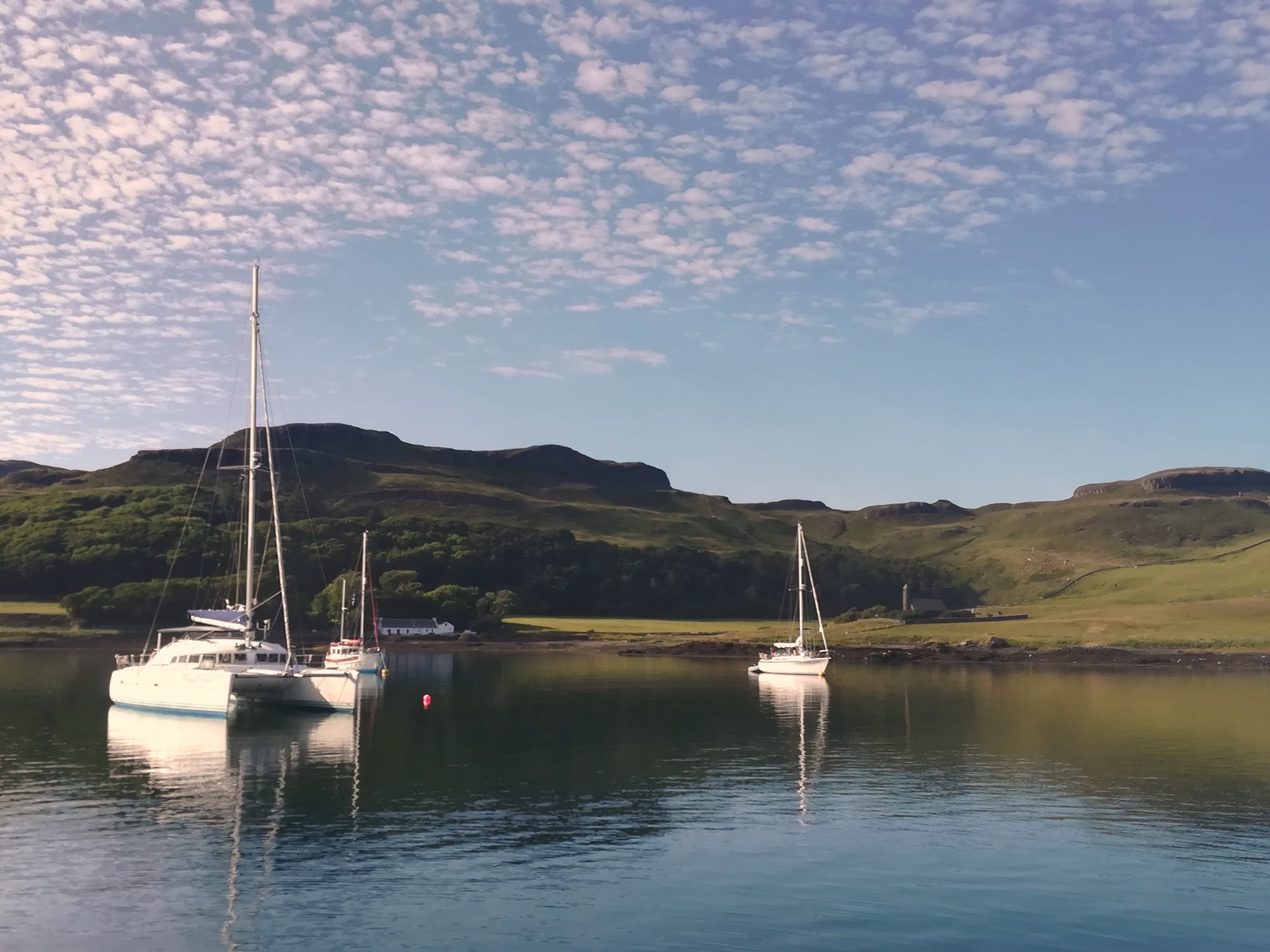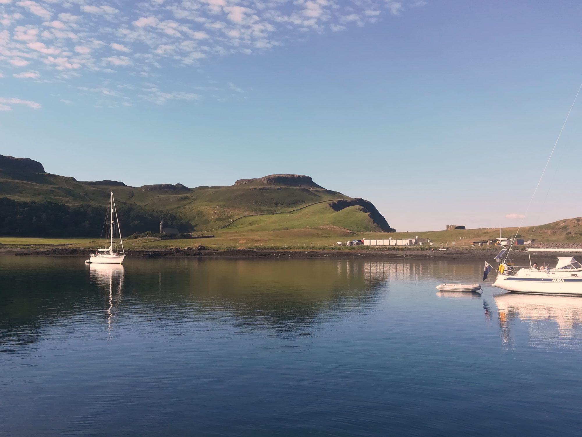 Und wir liegen hier romantisch schön bei sich spiegelnden Bergen, Kirchen und Booten. 21:30 verschwindet die Sonne hinter Canna, erst jetzt wird es kühl.