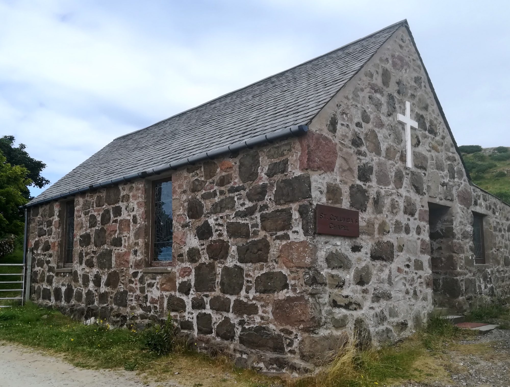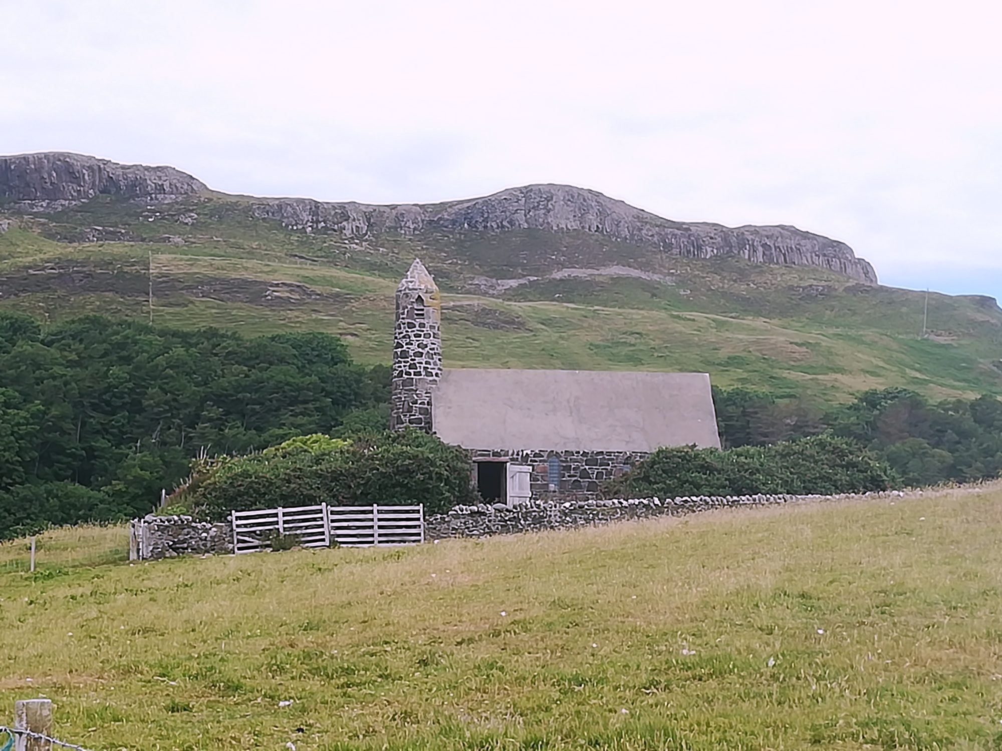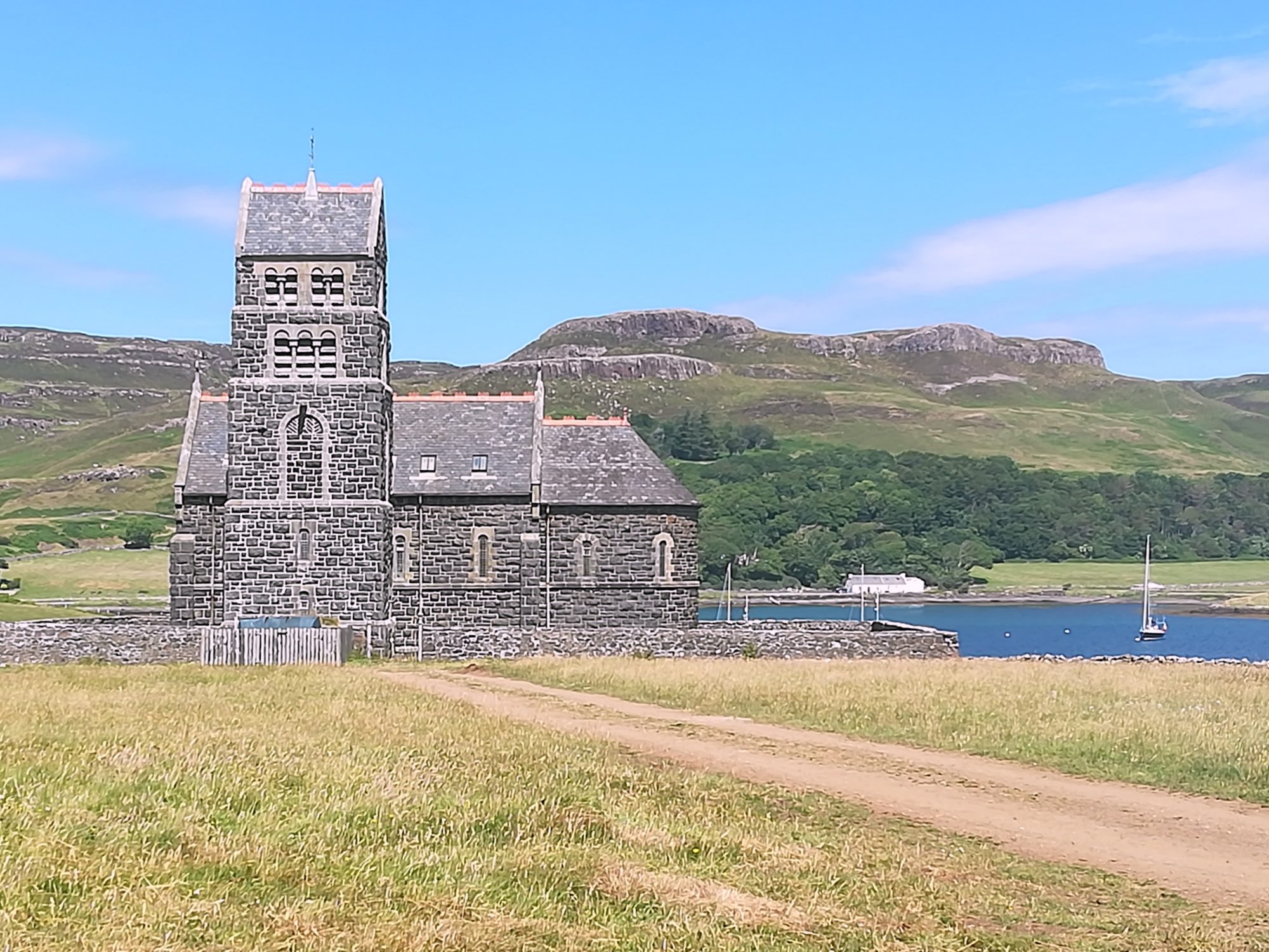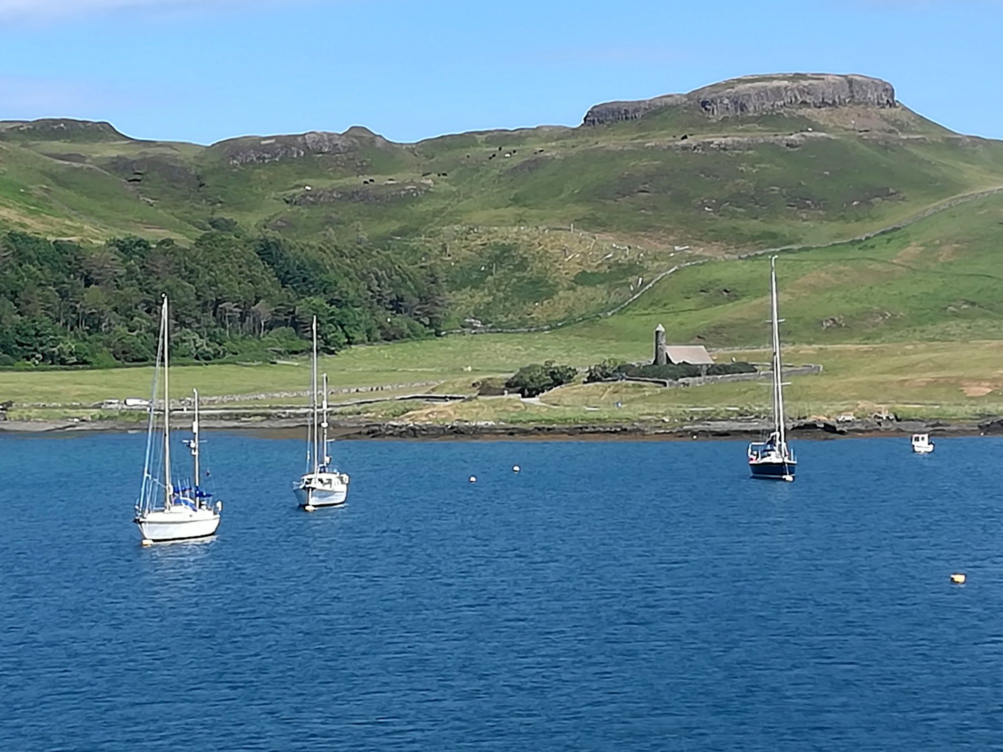 4.7., Mittwoch, 51. Tag: Ich glaube, wir haben einen der besten Sommer in Schottland – heute wieder Sonne pur und wenig Wind. Für einen Hafentag bestens geeignet. Mooringtonnen werden frei, wir fangen uns eine ein. Mit dem Schlauchboot zur Pier und dann in der tollen Natur der beiden Inseln wandern. Zuerst die Church of Scotland von außen und innen, dann das Canna House mit verwilderten Garten von außen, die kleine St. Columba’s Chapel und dabei immer Blicke auf die vulkanischen Berge von Canna (interessant vor allem die Basaltblöcke).
