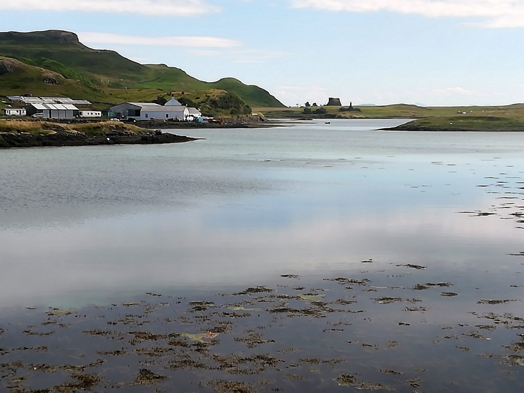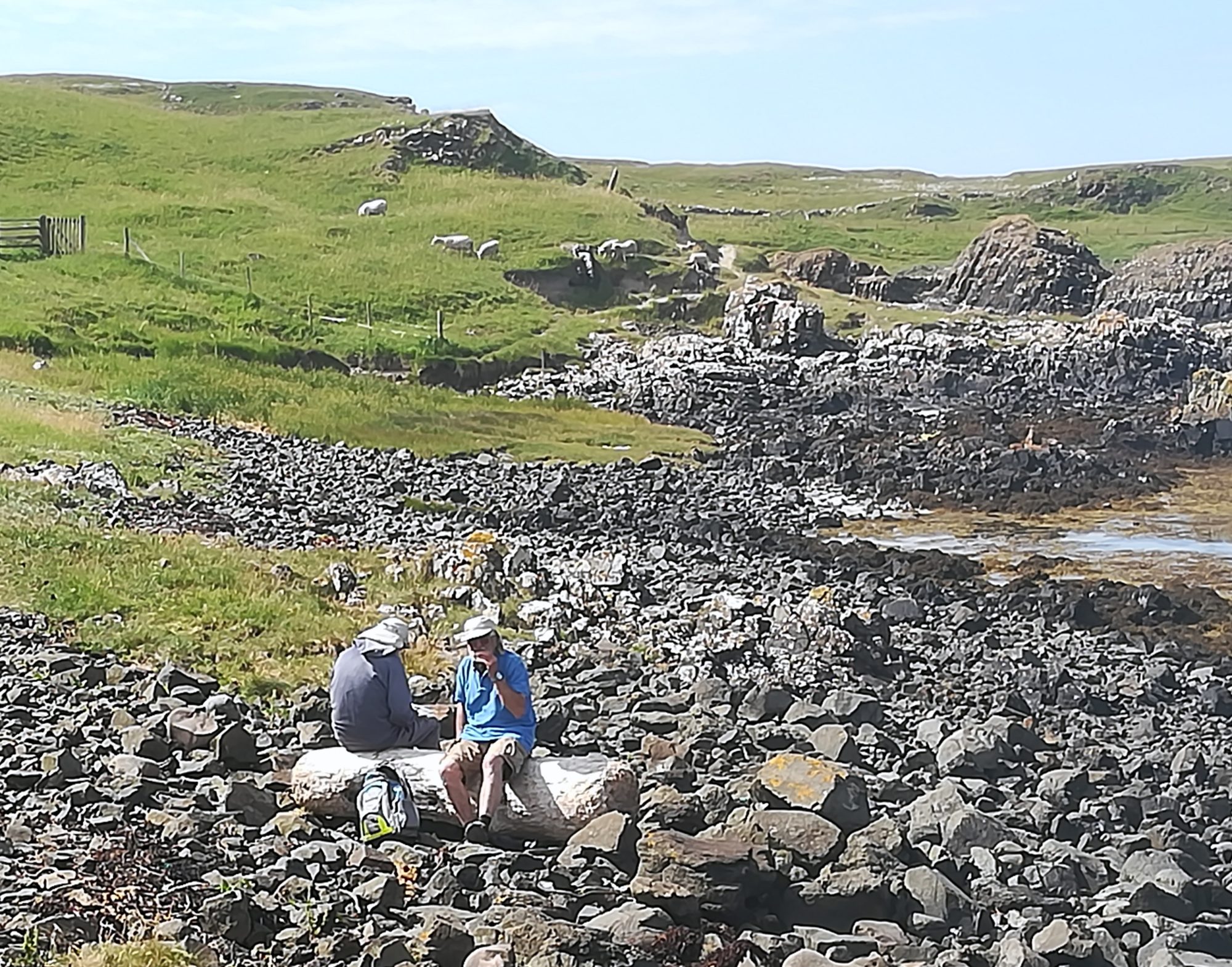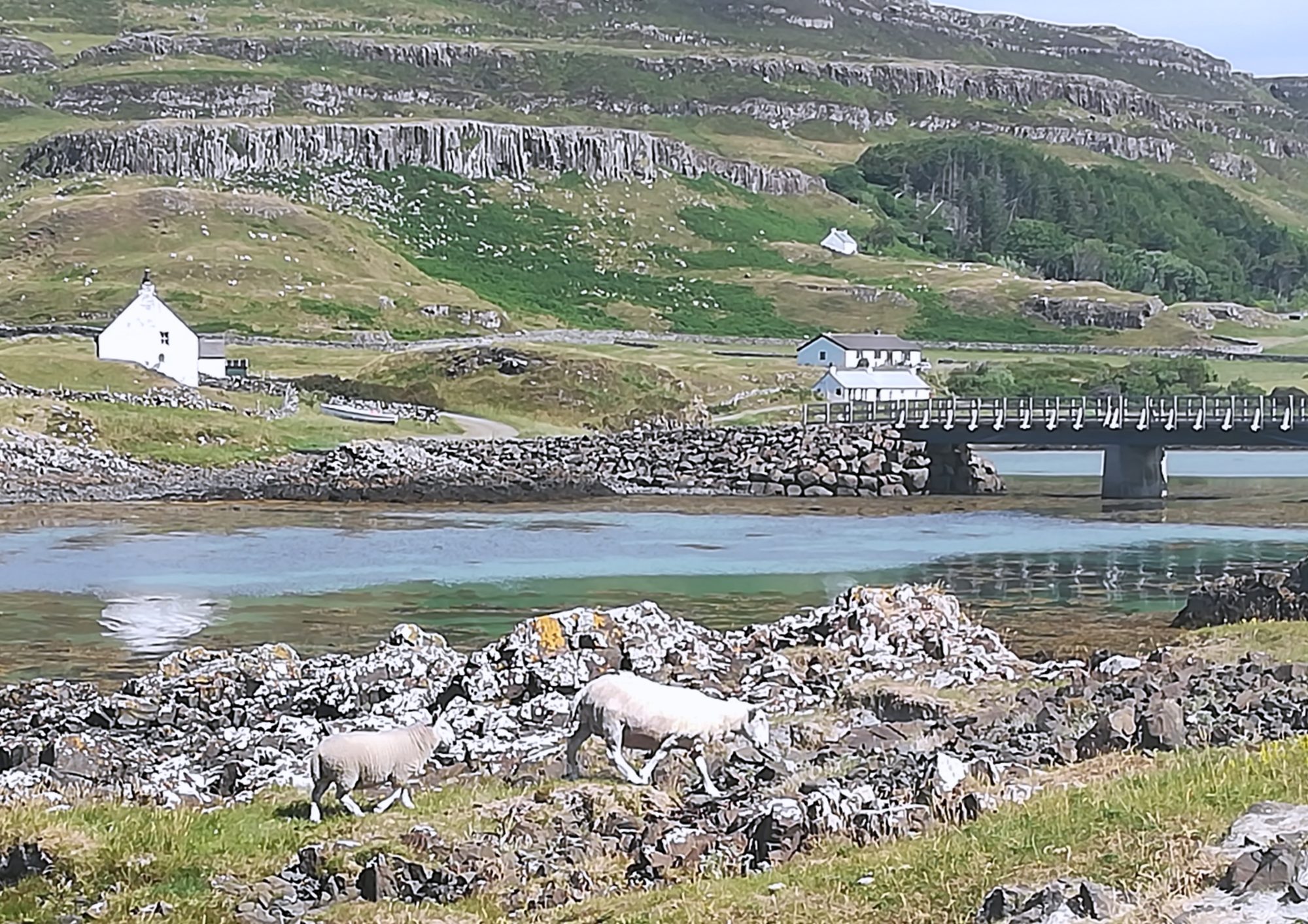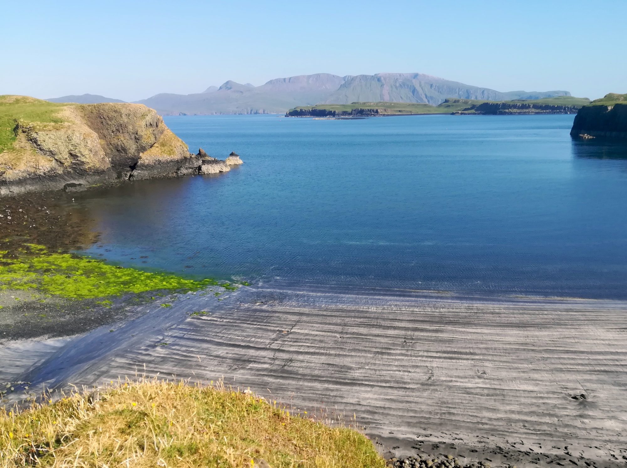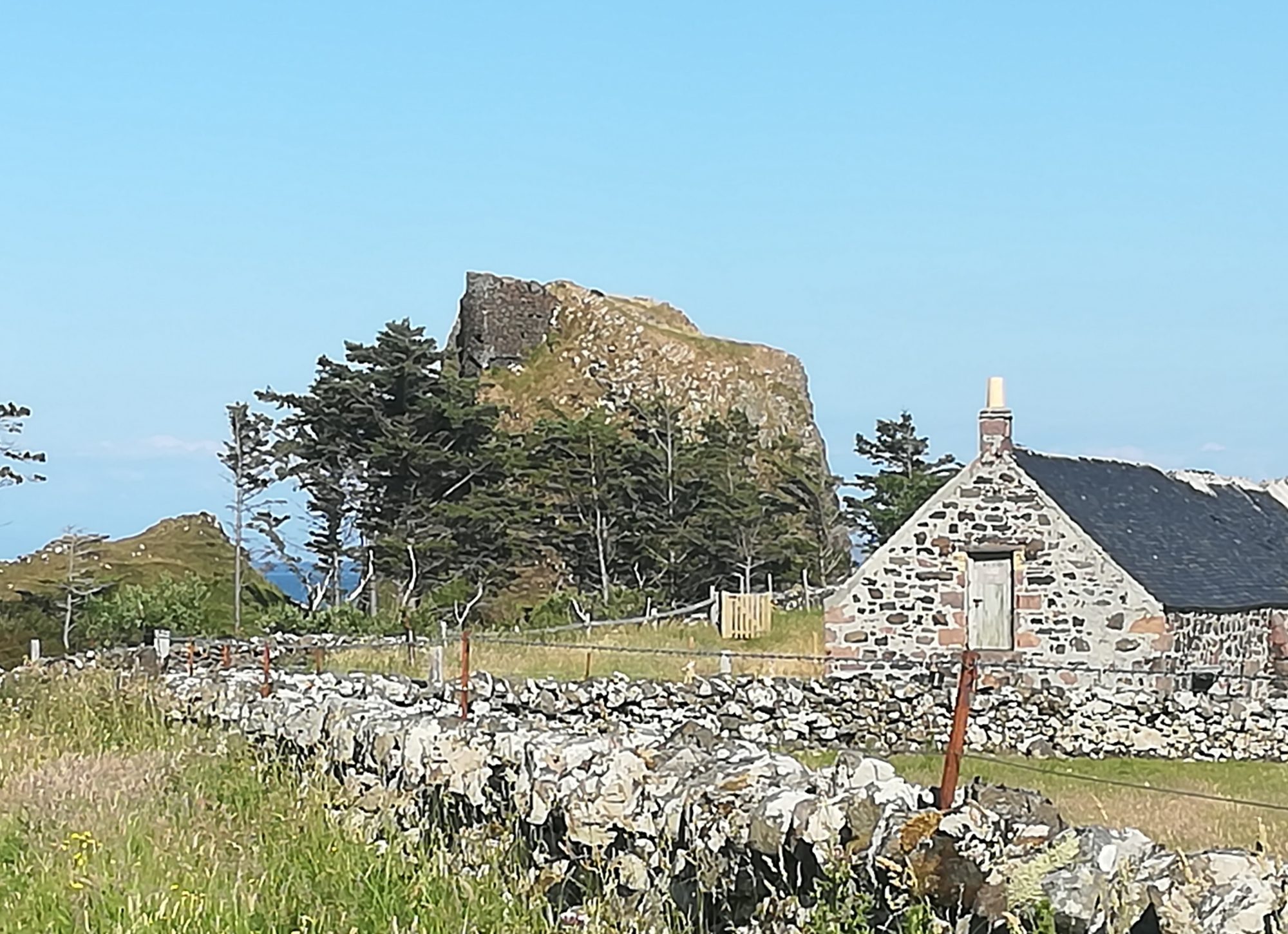 4.7., Mittwoch, 51. Tag: Ich glaube, wir haben einen der besten Sommer in Schottland – heute wieder Sonne pur und wenig Wind. Für einen Hafentag bestens geeignet. Mooringtonnen werden frei, wir fangen uns eine ein. Mit dem Schlauchboot zur Pier und dann in der tollen Natur der beiden Inseln wandern. Zuerst die Church of Scotland von außen und innen, dann das Canna House mit verwilderten Garten von außen, die kleine St. Columba’s Chapel und dabei immer Blicke auf die vulkanischen Berge von Canna (interessant vor allem die Basaltblöcke).