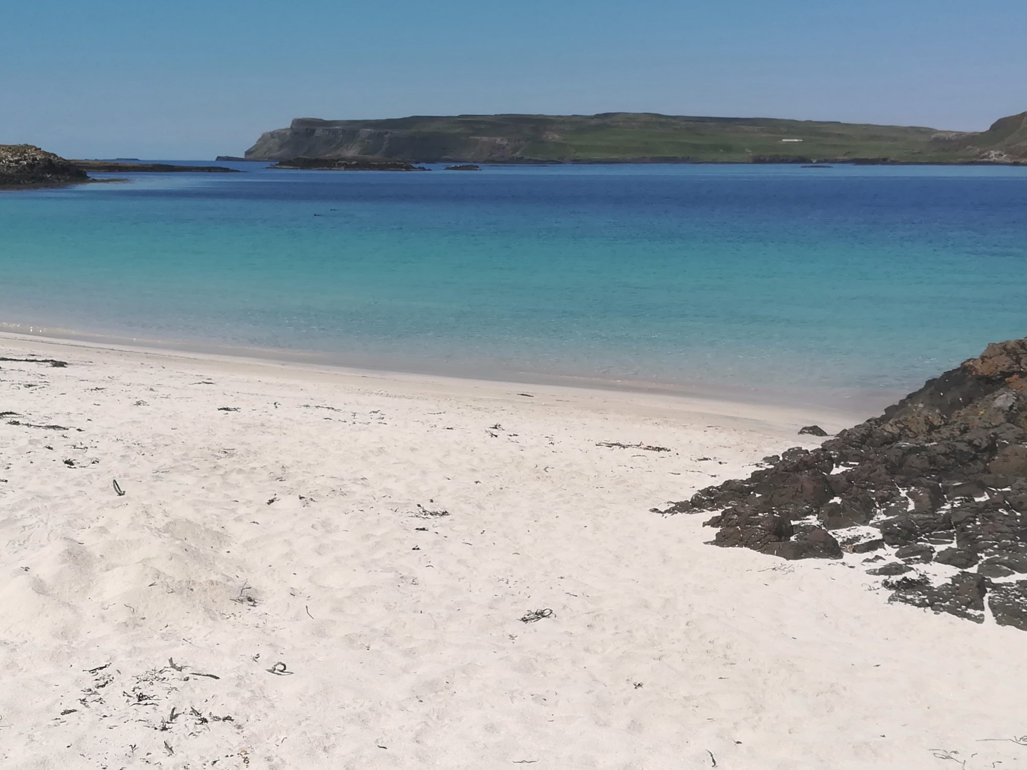 Eine Brücke verbindet die beiden Inseln. Auf Sanday zuerst ein „karibischer“ Sandstrand und am Ende unseres Weges die St. Edward’s Church von außen. Zurück auf dem selben Weg.