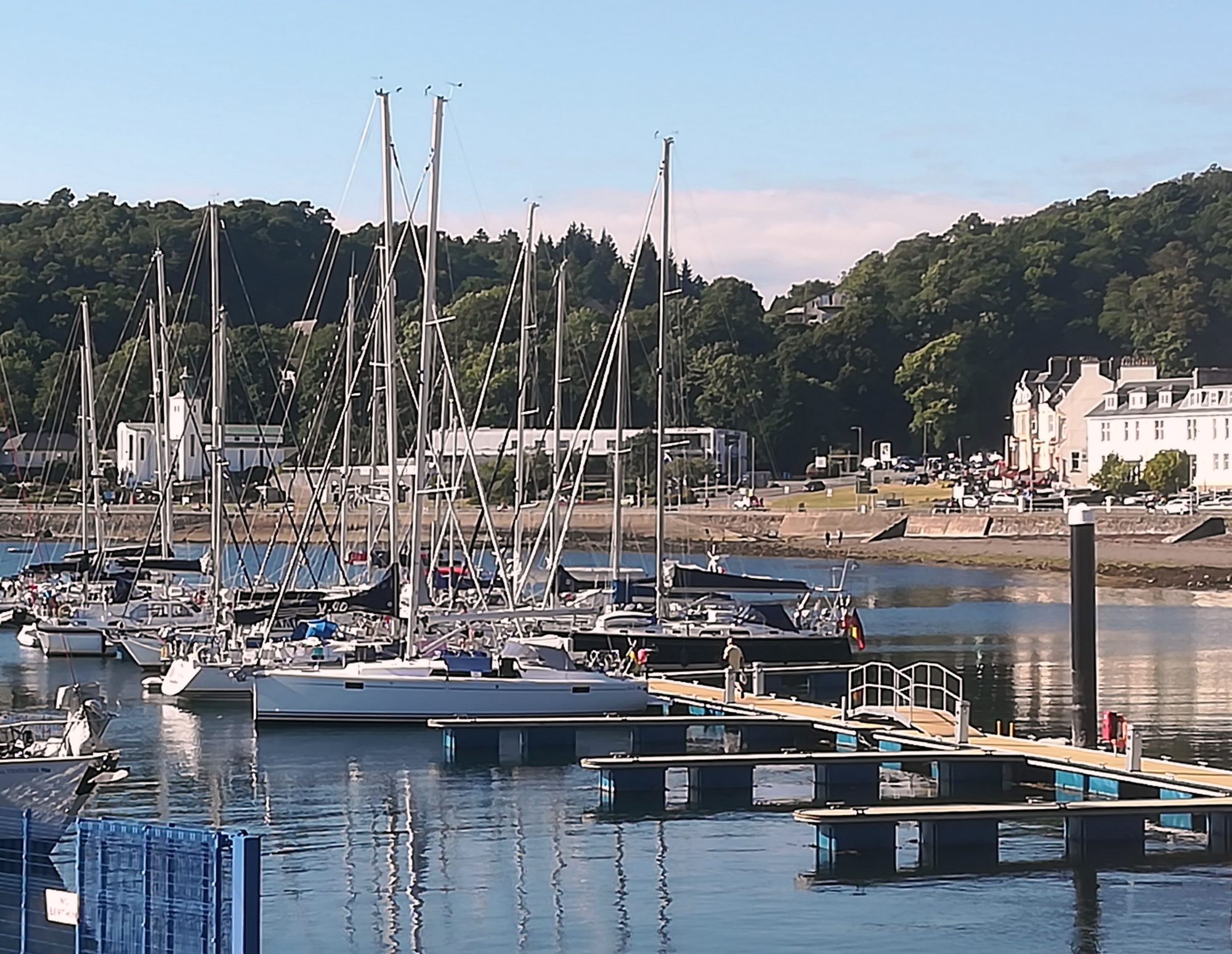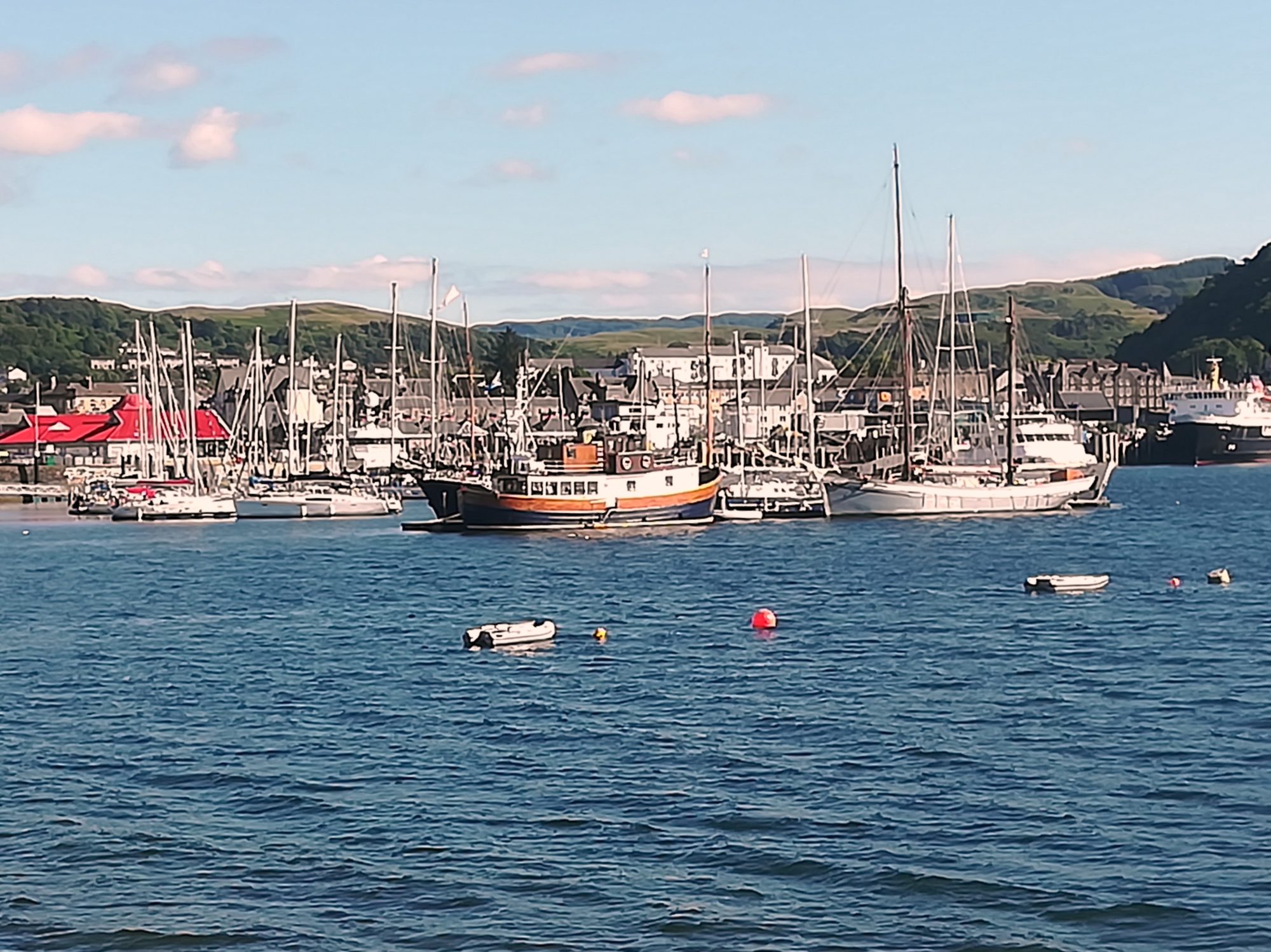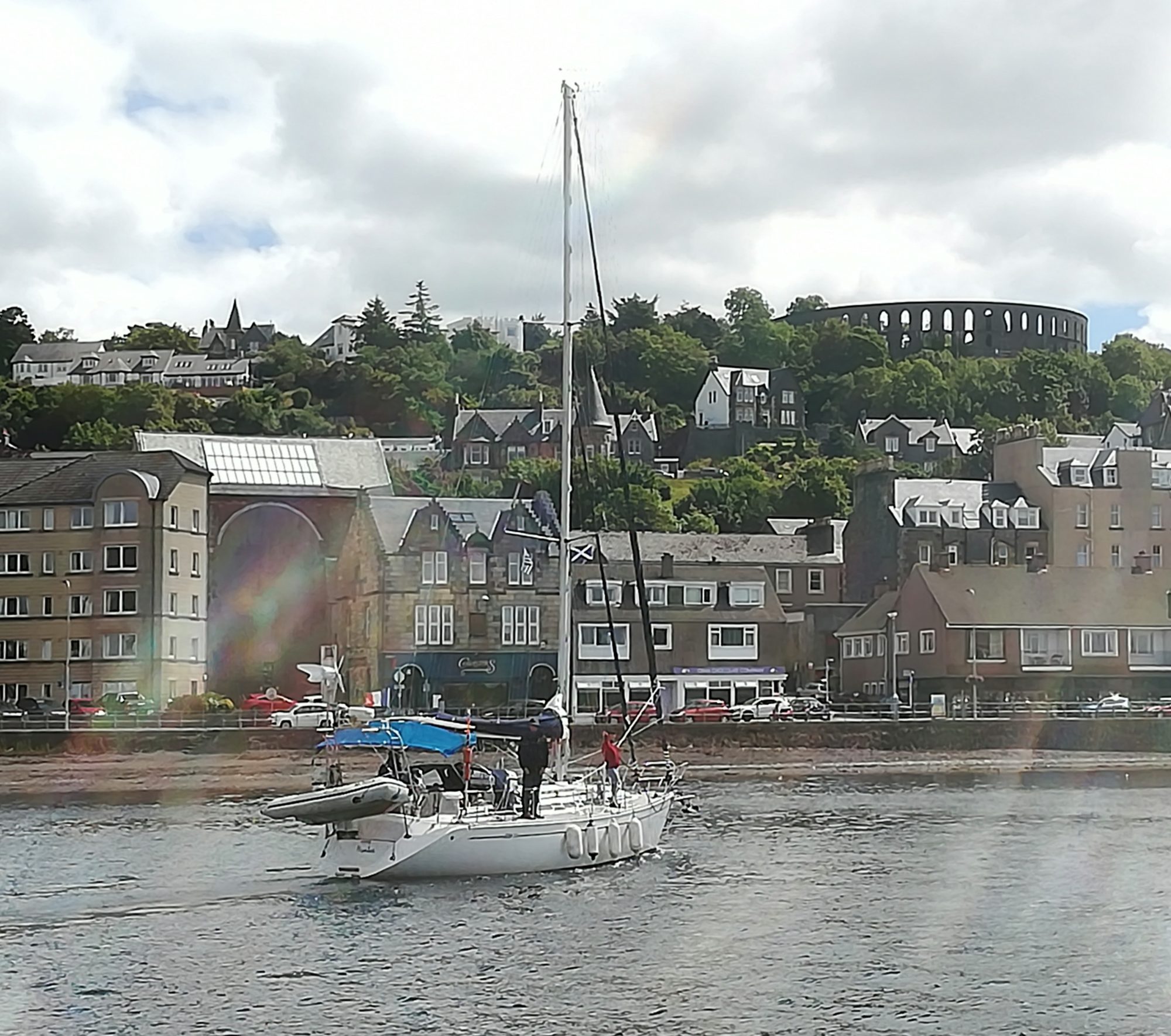 6.7., Freitag, 53. Tag: Für die 14sm nach Oban haben wir heute 4h gebraucht, es war wie angekündigt schwachwindig. Trotzdem sind 11sm davon gesegelt, nur als der Gegenstrom mehr als 1kn wurde, haben wir auf den Knopf gedrückt. Das Panorama von Oban bei der Hafeneinfahrt ist schön, haben uns für die neue Marina im Stadtzentrum entschieden (Liegegebühr 33£) (56°24,9’N 05°28,5’W). Der Sanitärbereich hier super.