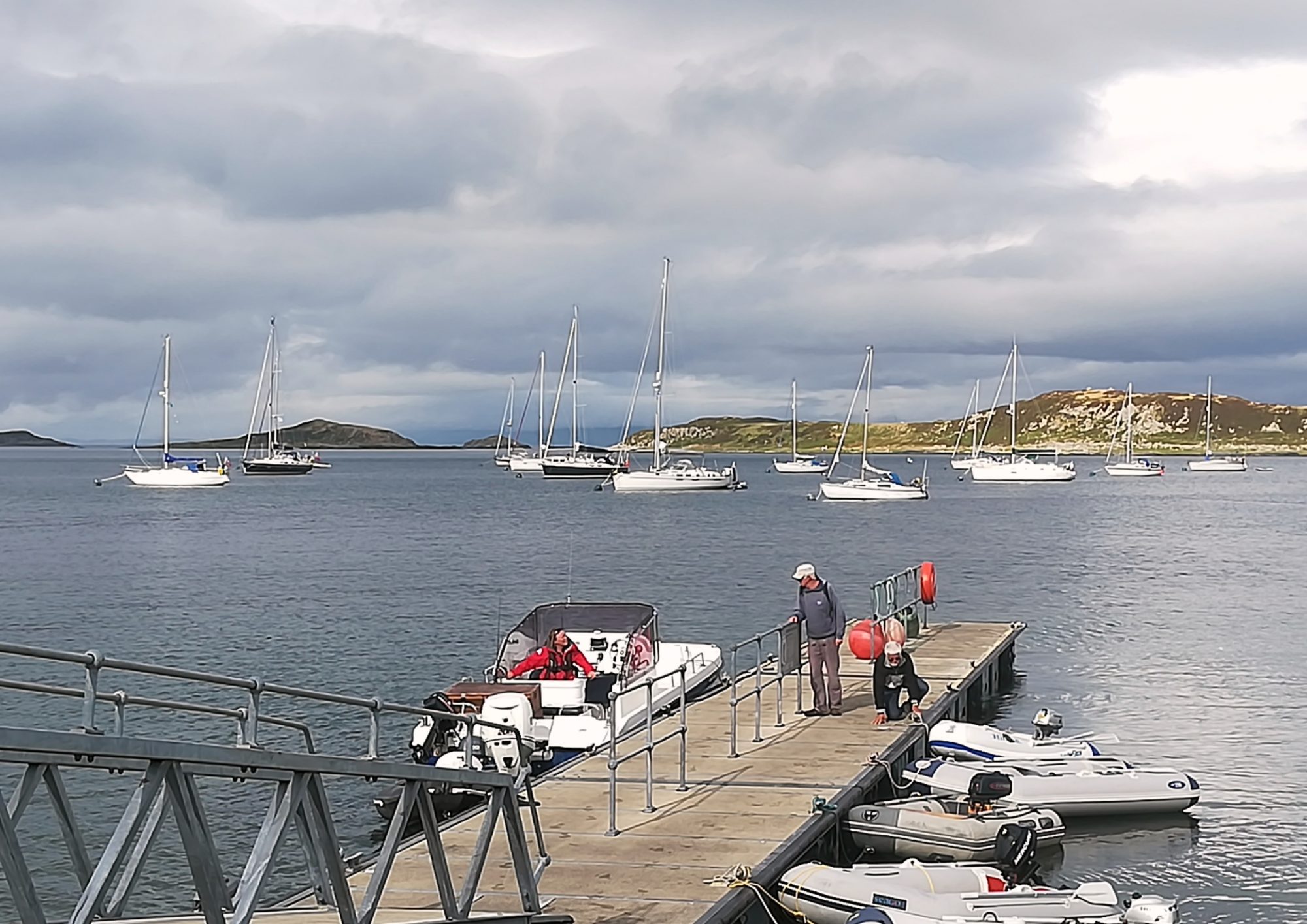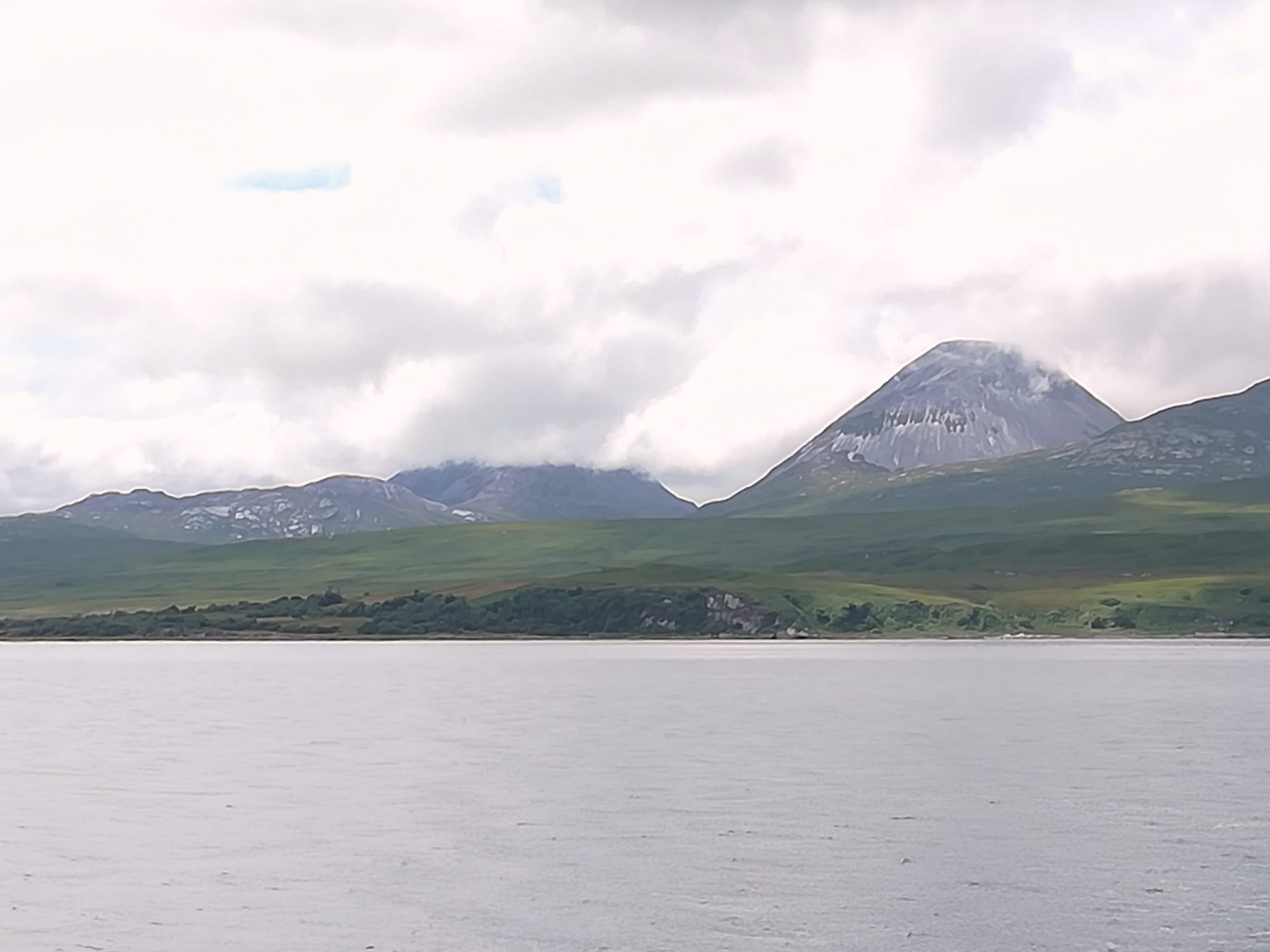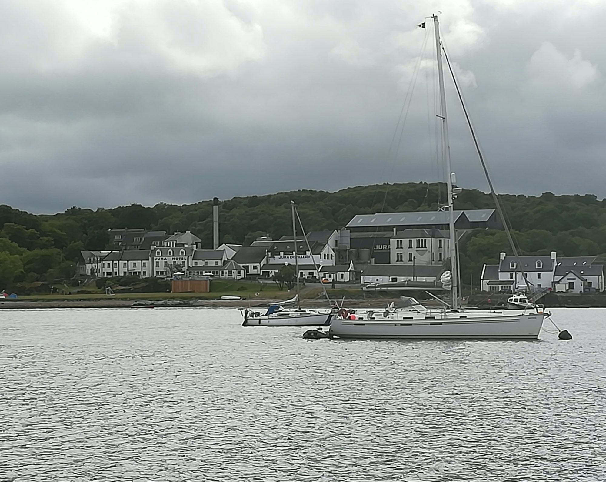 8.7., Sonntag, 55. Tag: Wir sind doch in Schottland – gestern Abend gab es Nieselregen und heute morgen auch. Dazu alles wolkenverhangen. Gegen 10:00 hört der Regen auf, wir starten unsere Tour. Es bleibt bis nachmittags bedeckt, aber mit Wind bis 15kn. Meist kommt er aus SW, Kreuzen ist angesagt mit kleine Holeschlägen. Bald ist die Nordspitze von Jura erreicht, wir sind im Sound of Jura. Da der Wind in Landnähe von Jura stabiler ist, segeln wir dort. Die Insel ist ziemlich eintönig. Erst kurz vor unserem Ziel wird es interessant, die fast 800m hohen Gipfel der Paps of Jura kommen in Sicht. Sie sehen eigentümlich aus, sollen aus Quarzit bestehen. In der Bucht von Craighouse (55°50,1’N 05°56,8’W) angeln wir uns eine Mooringtonne, Anlegemöglichkeiten gibt es nur für Schlauchboote. Eine schön gelegene geschützte Bucht, die Jura-Destillerie von weitem zu sehen.