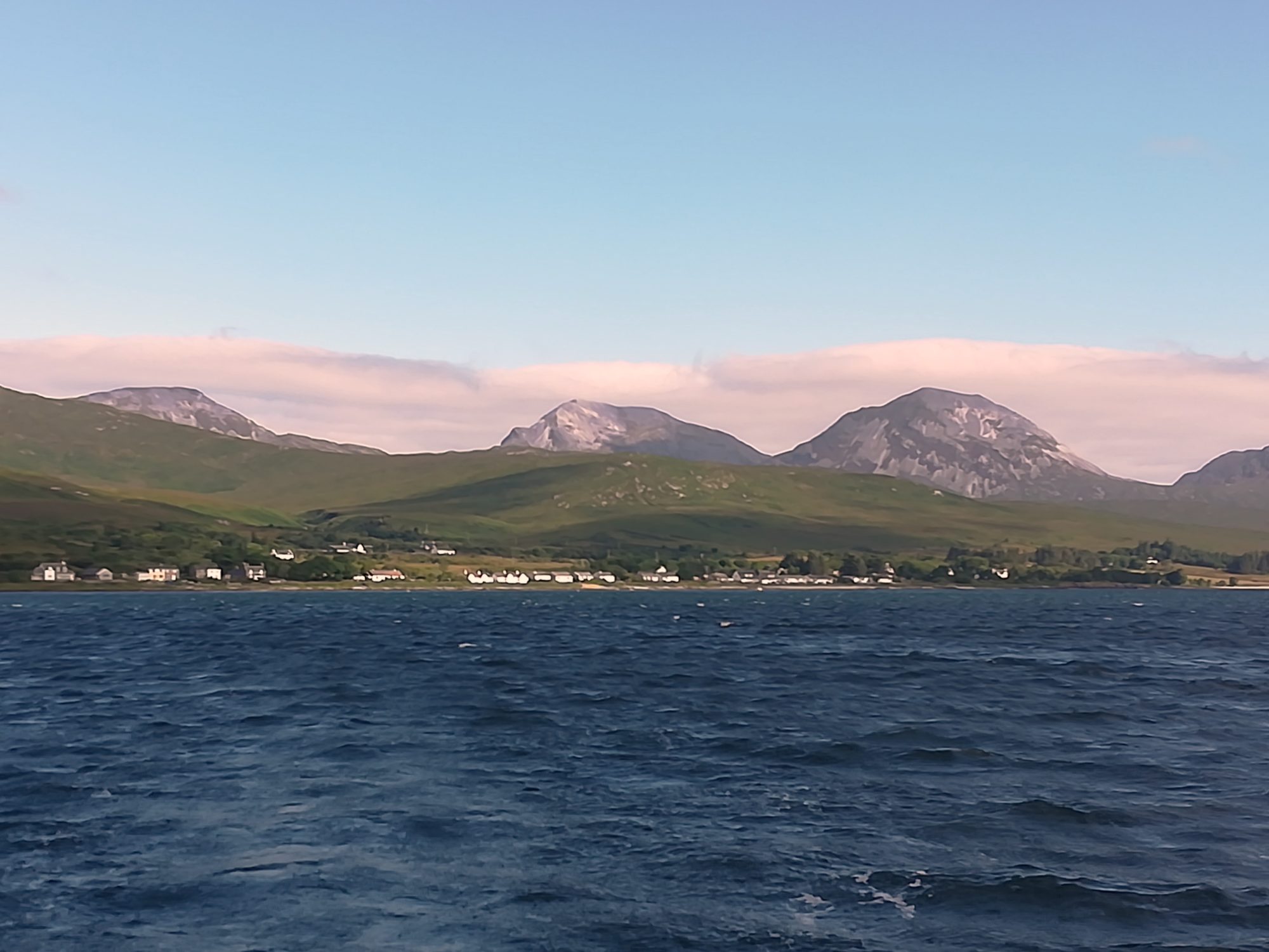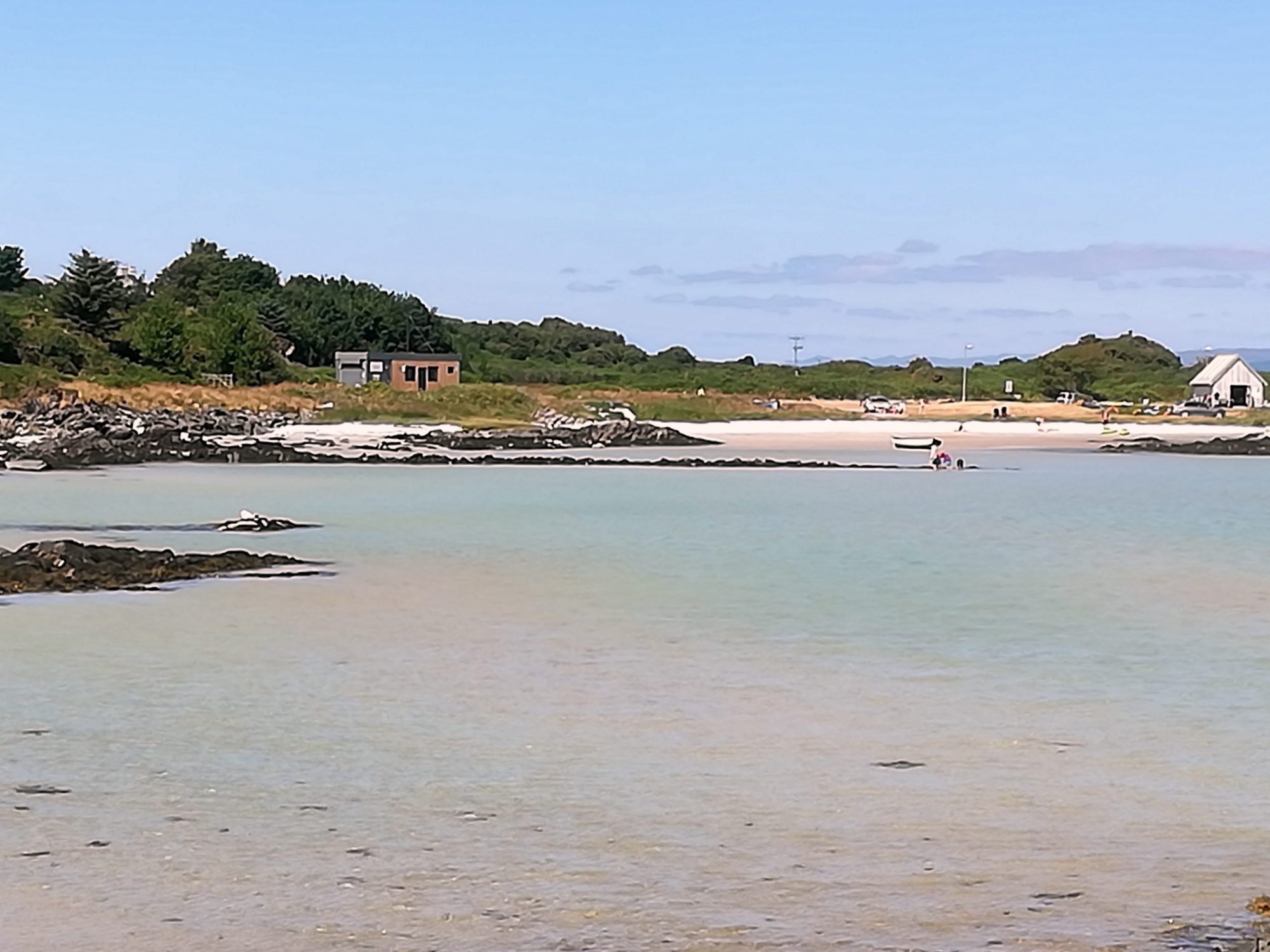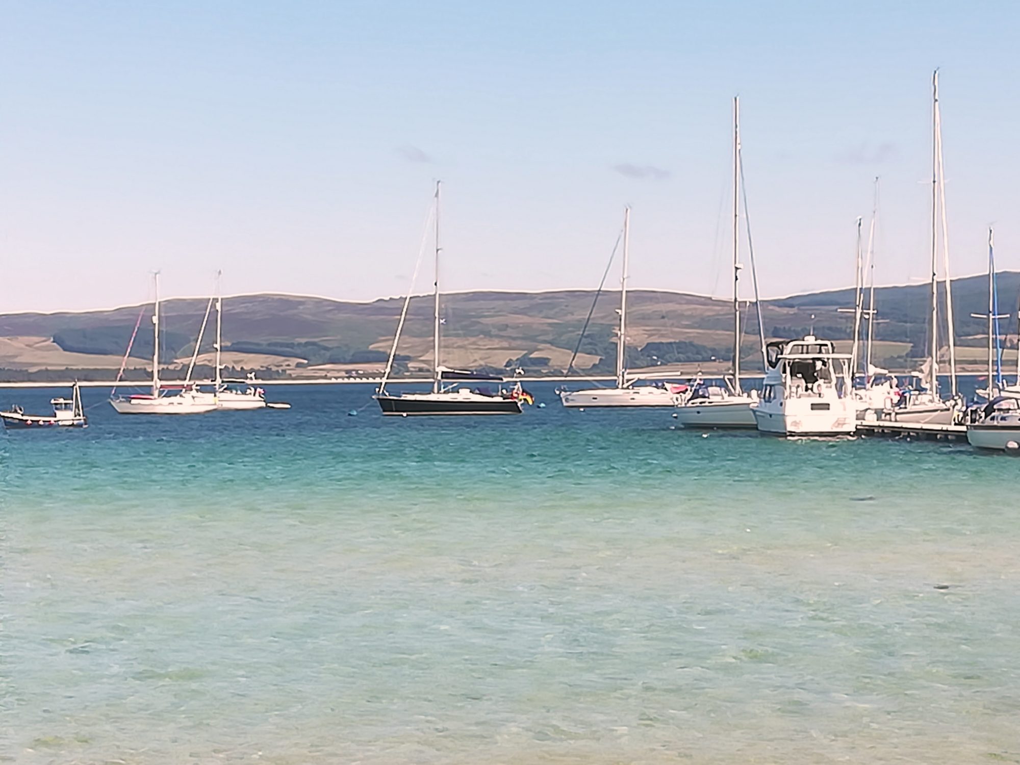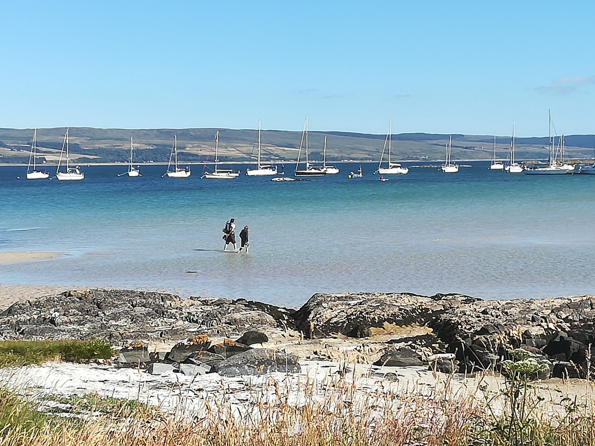 9.7., Montag, 56. Tag: Heute sind die 3 Gipfel sehr schön sichtbar. Sonne, Wind. Wir segeln trotzdem nur 14sm, unser Ziel – die Insel Gigha – wurde uns mehrfach empfohlen. Und es ist wirklich schön hier- hat wieder was von „karibischem Flair“. Und es gibt hier sogar einige Mutige, die bei 14°C Wassertemperatur ins Wasser gehen.