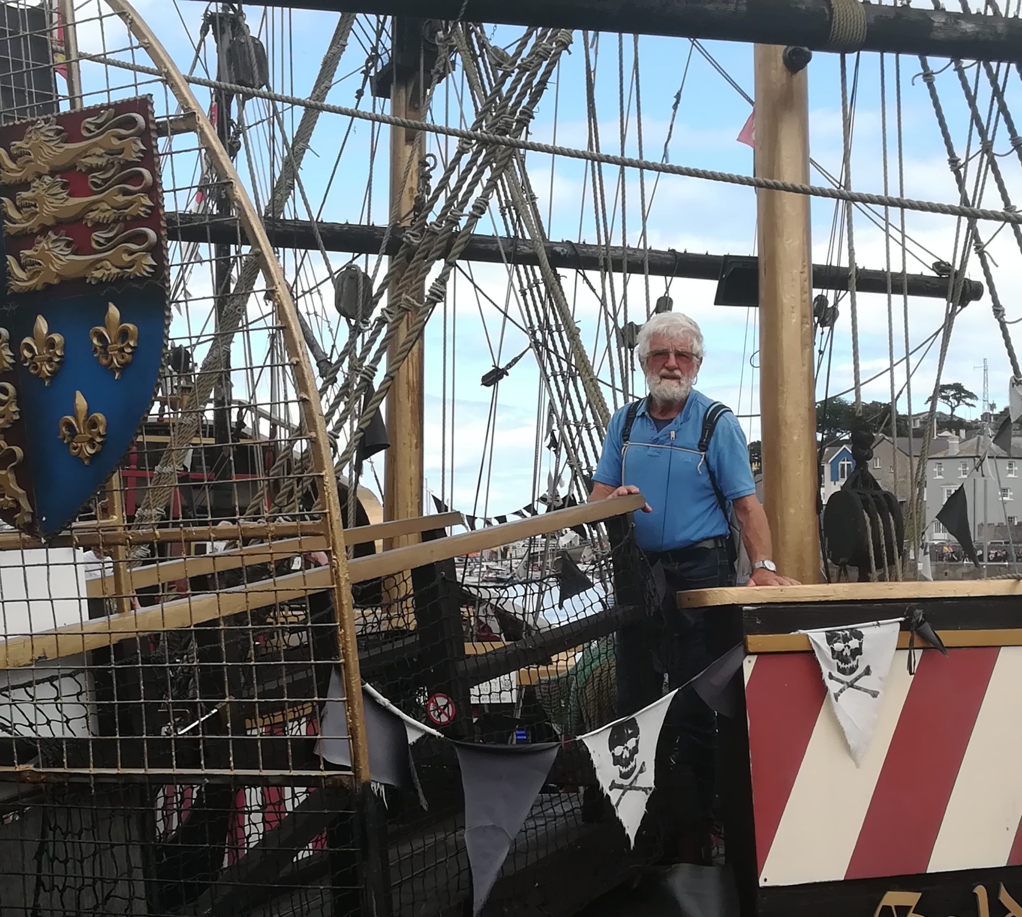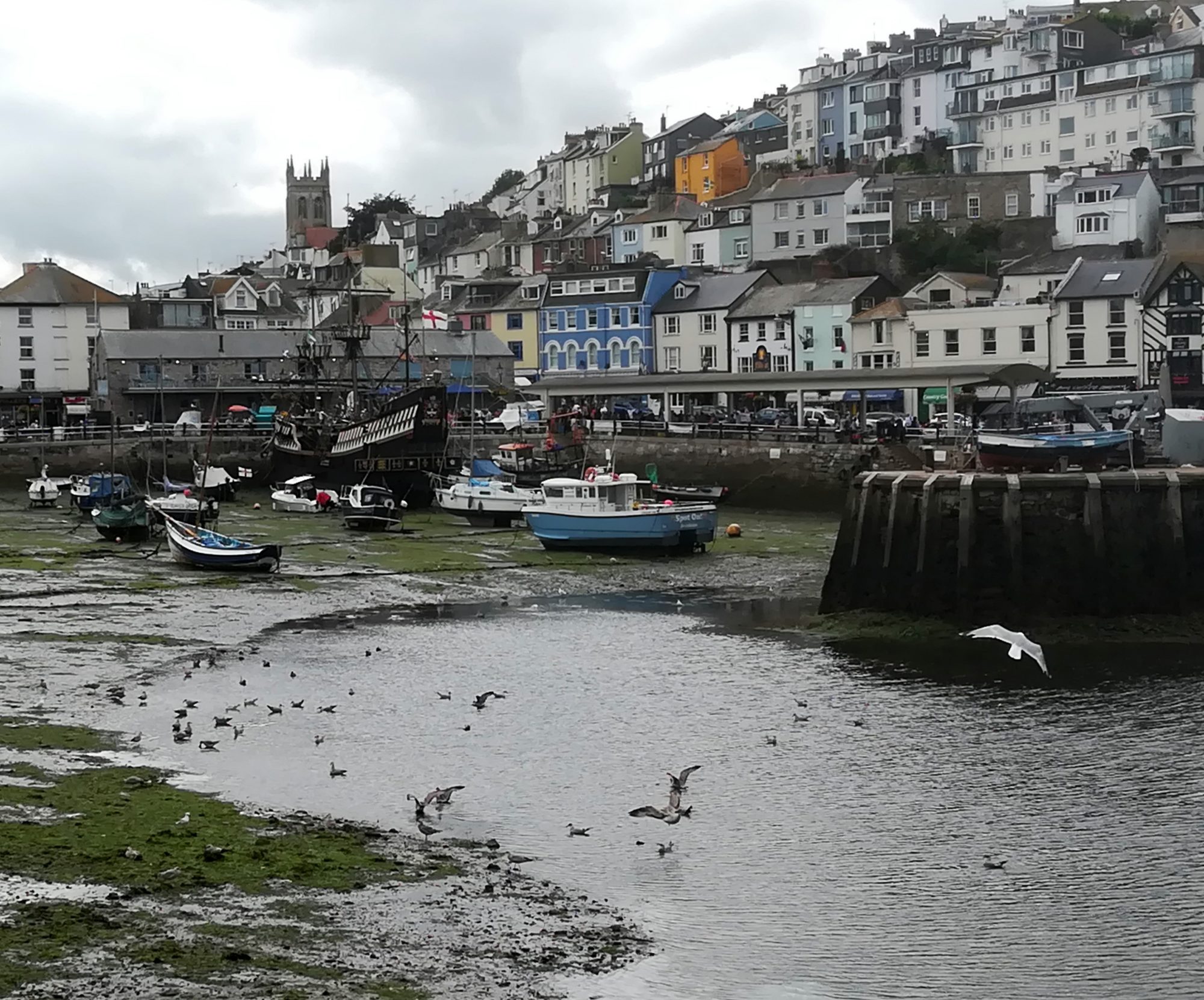 Mittags sind wir mit dem Bus nach Brixham gefahren (10£ als Gruppe für den ganzen Tag), auch ein Touristenmagnet. Die Stadt hat einen attraktiven Hafen, in dem u.a. die „Golden Hind“ liegt. Es ist jetzt Museumsschiff – ein orginalgetreuer Nachbau des Schiffes, mit dem Francis Drake von 1577 bis 1580 die Welt umsegelte und als erfolgreichster Freibeuter der englischen Geschichte zurückkehrte. Schön, wie sich die Häuser, vom Hafen ausgehend, an die umliegenden Hügel anschmiegen.