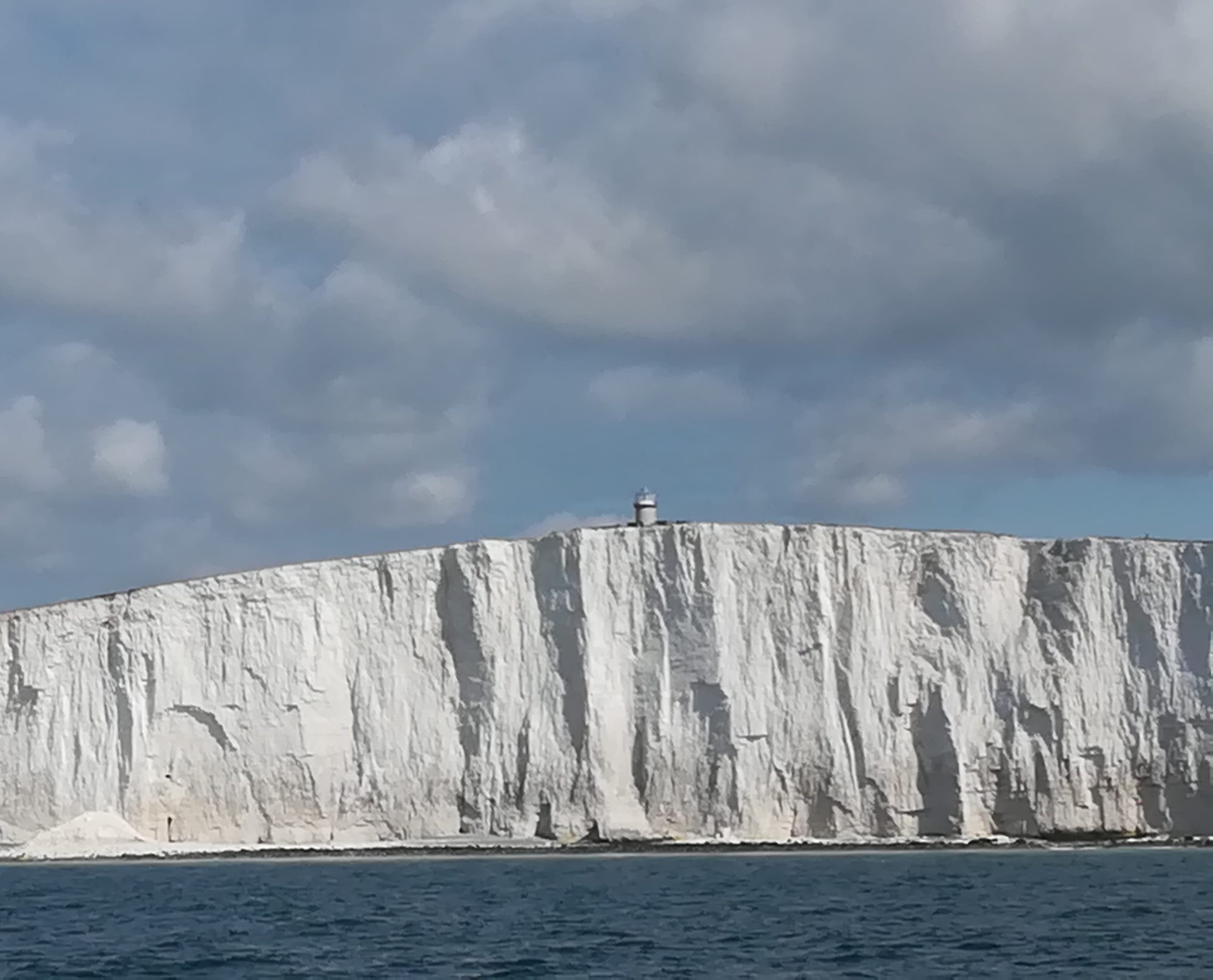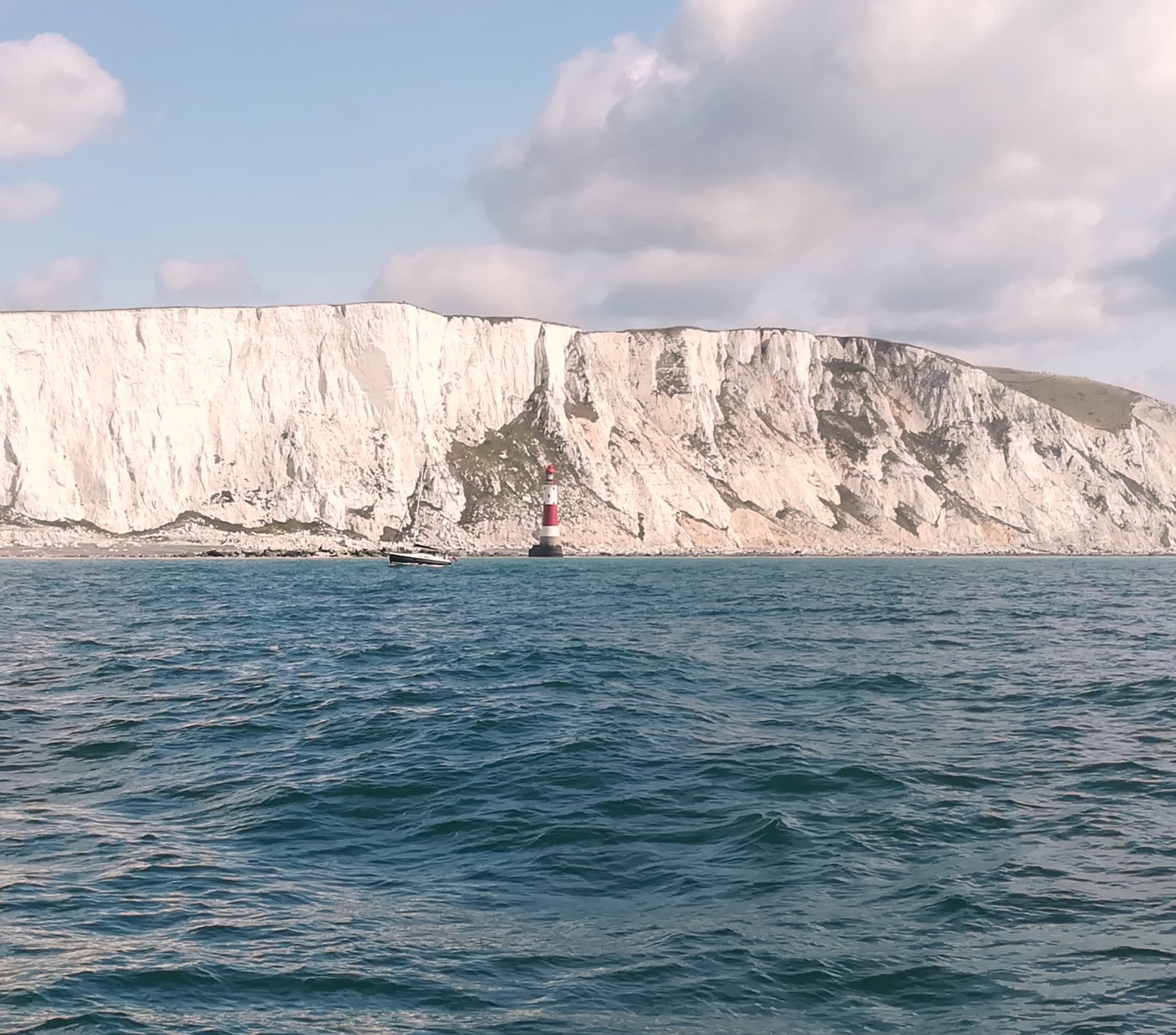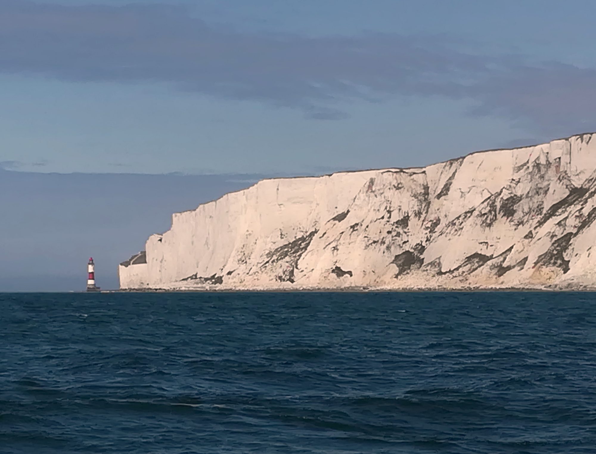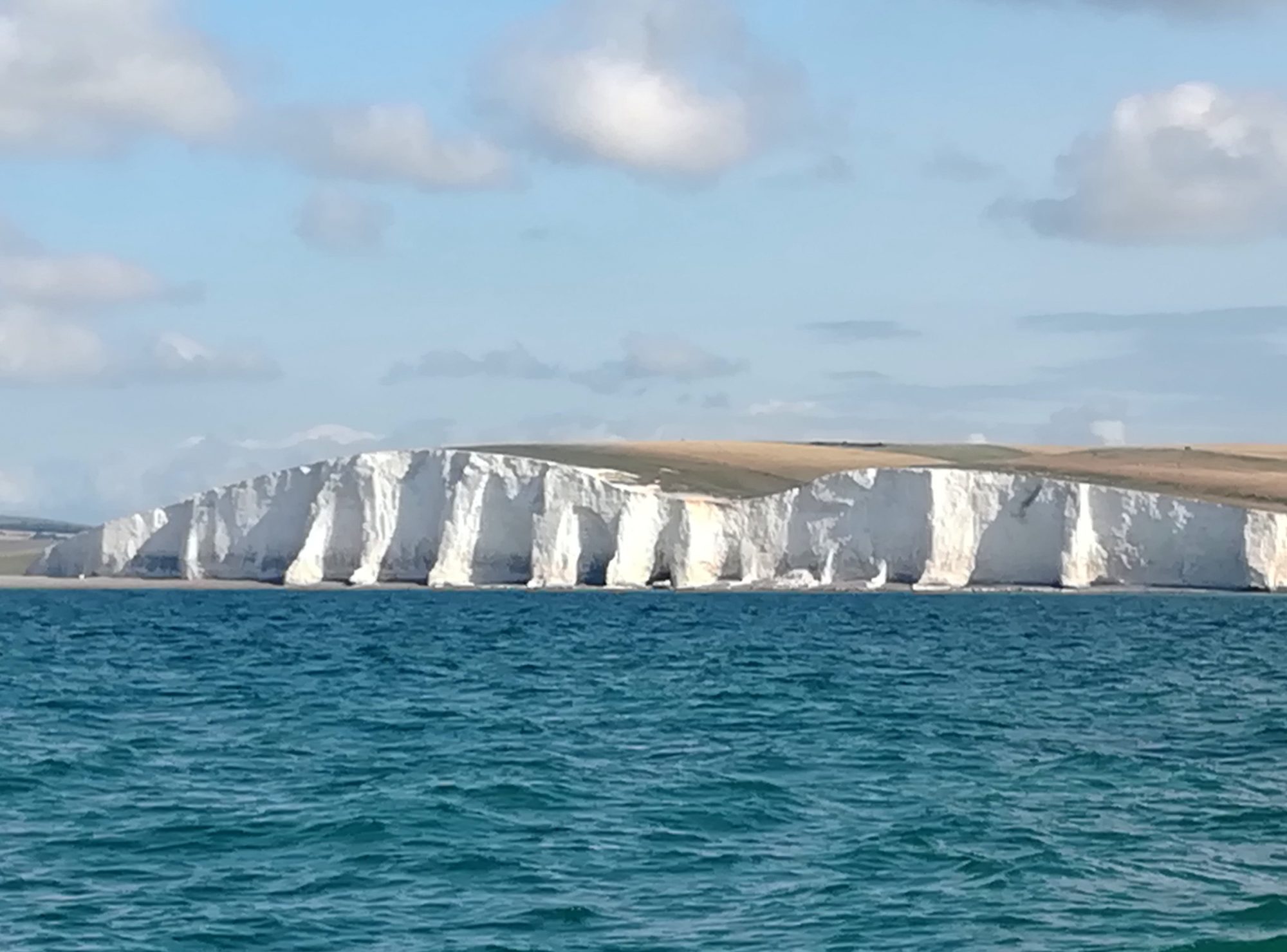 20.8., Montag, 98. Tag: Heute ist wieder guter Wind für uns vorhergesagt und es ist auch so. Mit Wind aus SW, für uns also achterlich, segeln wir an der Südküste von England entlang. Vormittags ist es teilweise zu wenig, für 1h nehmen wir die Segel nochmal runter, weil sie in der Dünung klappern. Toll ist die Sicht auf die weißen Kreidefelsen, zuerst die Sieben Schwestern und dann auf Beachy Head, 162m hoch. Gesichert wird die Klippe mit 2 Leuchttürmen, einer auf der Klippe und der 2. im Meer.
