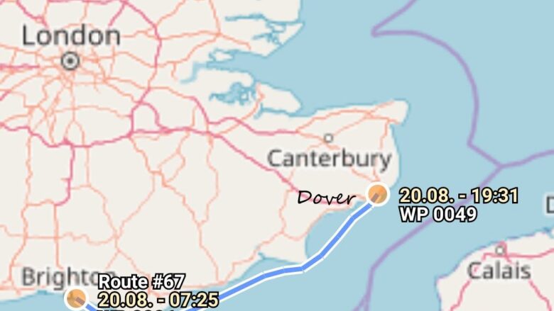 Nach Beachy Head frischt der Wind auf und wir können gut Segeln- heute wieder bei Sonnenschein. 11:05 Überquerung des Nullmeridians. 16:10 ist Kap Dungeness querab, das dortige Atomkraftwerk haben wir schon von weitem gesehen. 19:17 die Freigabe zur Einfahrt in den Hafen von Dover von Bord Control, ¼h später haben wir den uns zugewiesenen Platz in dem Granville Dock (51°05,8’N 01°17,9’O) eingenommen. Wir konnten gleich einfahren, da wir den Hafen bei Hochwasser erreicht haben.