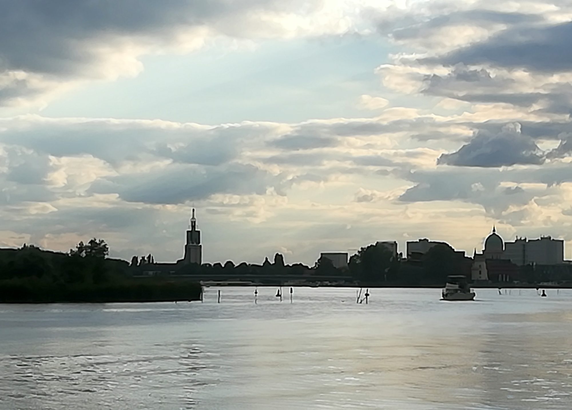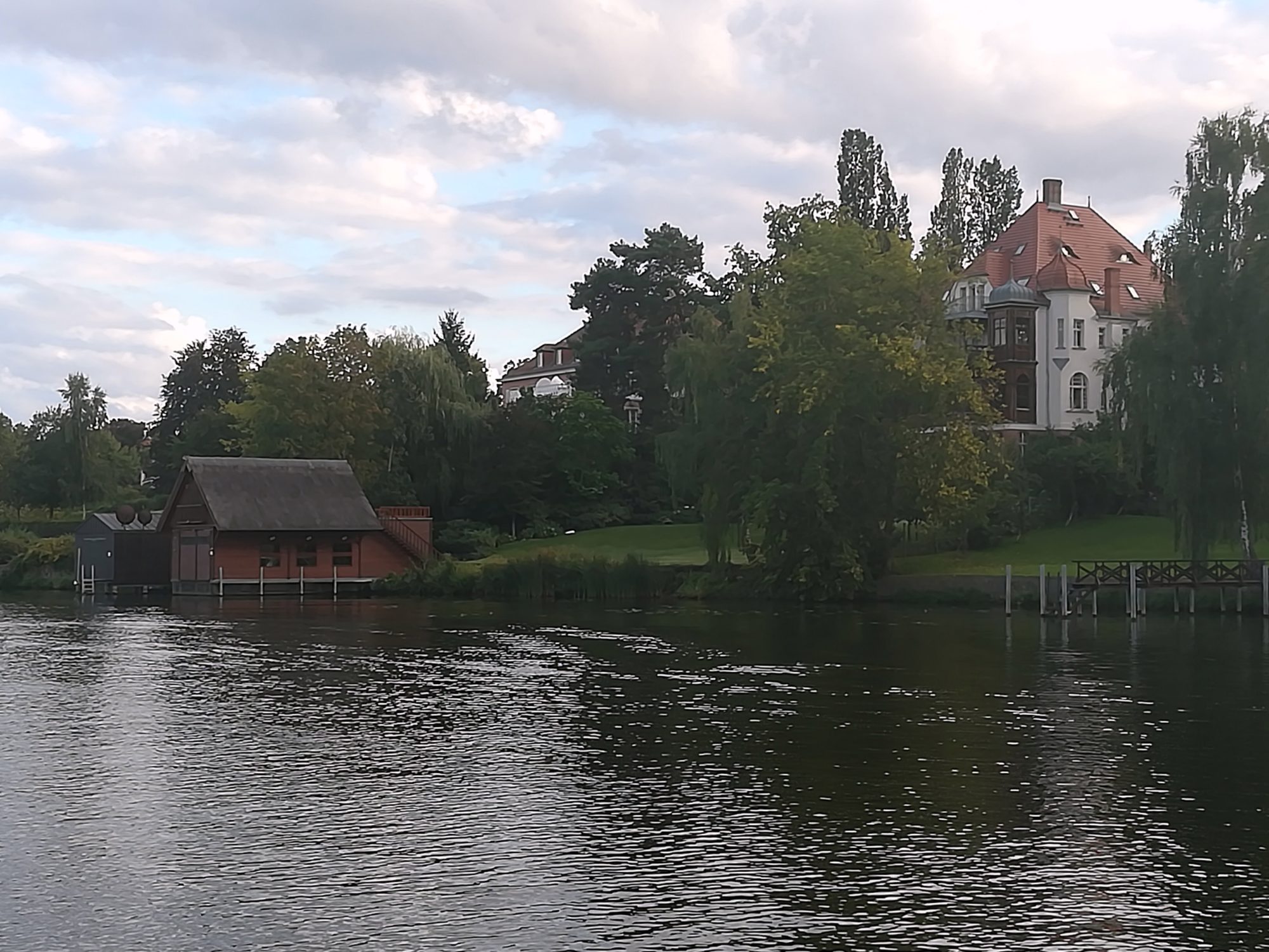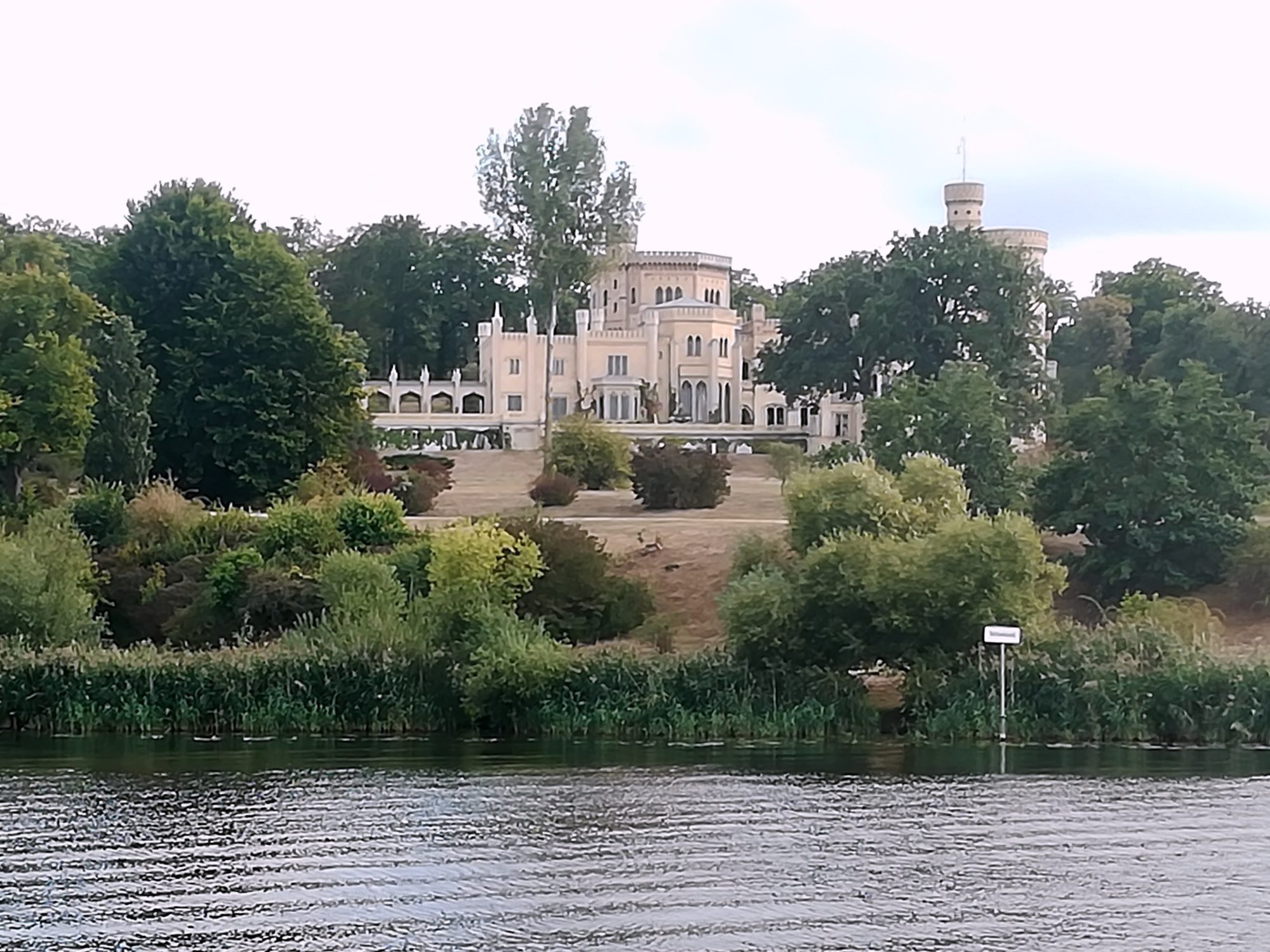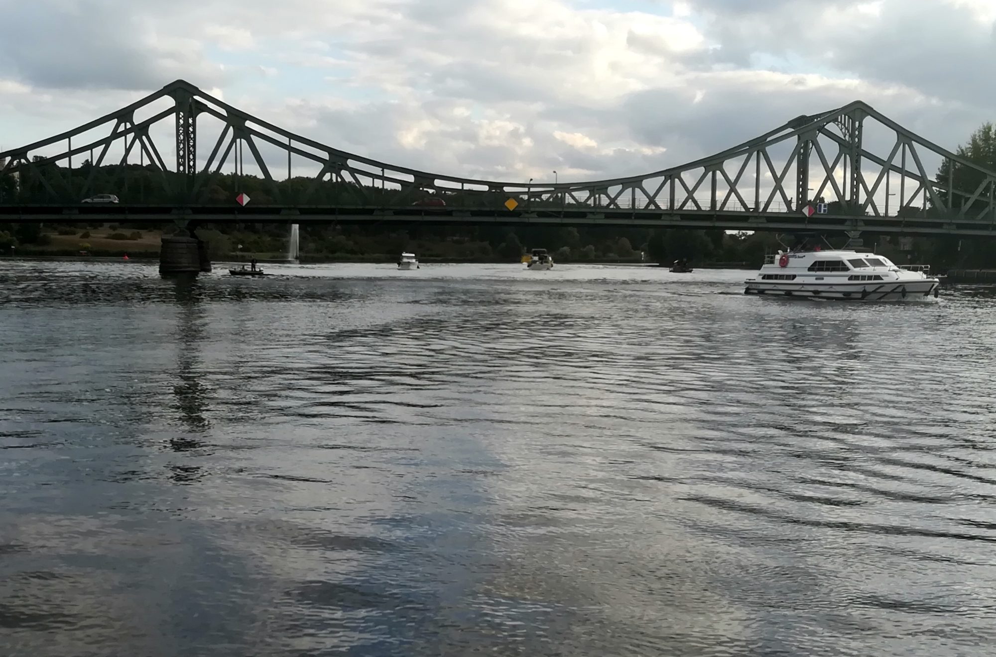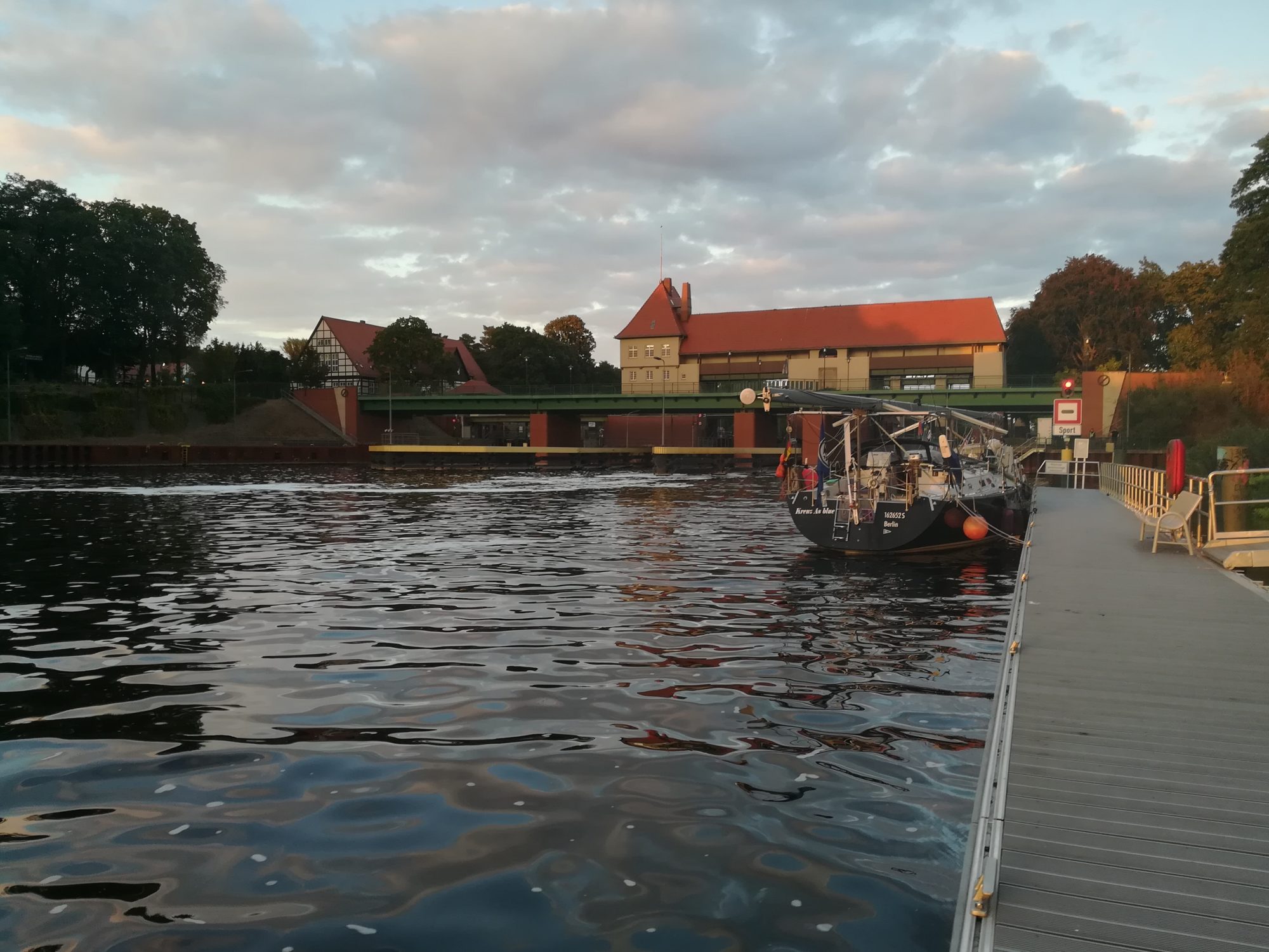 mit ~ 4,5kn voran. 11:50 ist die Schleuse Lehnitz erreicht, nach einer ¾ h sind wir durch. Heute eine kurze Wartezeit – wir sind anderes gewöhnt. 13:50 auf der Havel, anschließend gleich das Stahl- und Walzwerk Henningsdorf. Bald die Seen Kette und weiter auf der Havel, Schleuse Spandau ohne große Wartezeit passiert. Heute müssen wir weiter Richtung Süden, in der Innenstadt ist es zu flach. An der Scharfen Lanke CareDiesel tanken (biofrei), vorbei an der Sacrower Heilandskirche, dem Glienicker Schloss und Schloss Babelsberg. Durch die Glienicker Brücke und von Ferne Potsdam mit seinem Nikolai Dom. Ja, und dann auf den Gribnitz See mit seinen tollen Villen am Ufer. Jetzt verstehe ich endlich die Diskussion um den Uferweg. 18:10 biegen wir in den Teltowkanal ein, 18:45 stehen wir vor der Schleuse Kleinmachnow. Dort arbeitet man wegen Personalmangel seit 16:00 nicht mehr (hat uns die aktuelle Internetseite aber nicht verraten). Nun dann gibt es die Pause eben vor der Schleuse im Sportbootwartebereich. Nun müssen wir morgen früh um 6:00 dem Schleusenwärter nur noch klar machen, dass wir um diese Zeit noch schlafen. 49sm waren es heute.