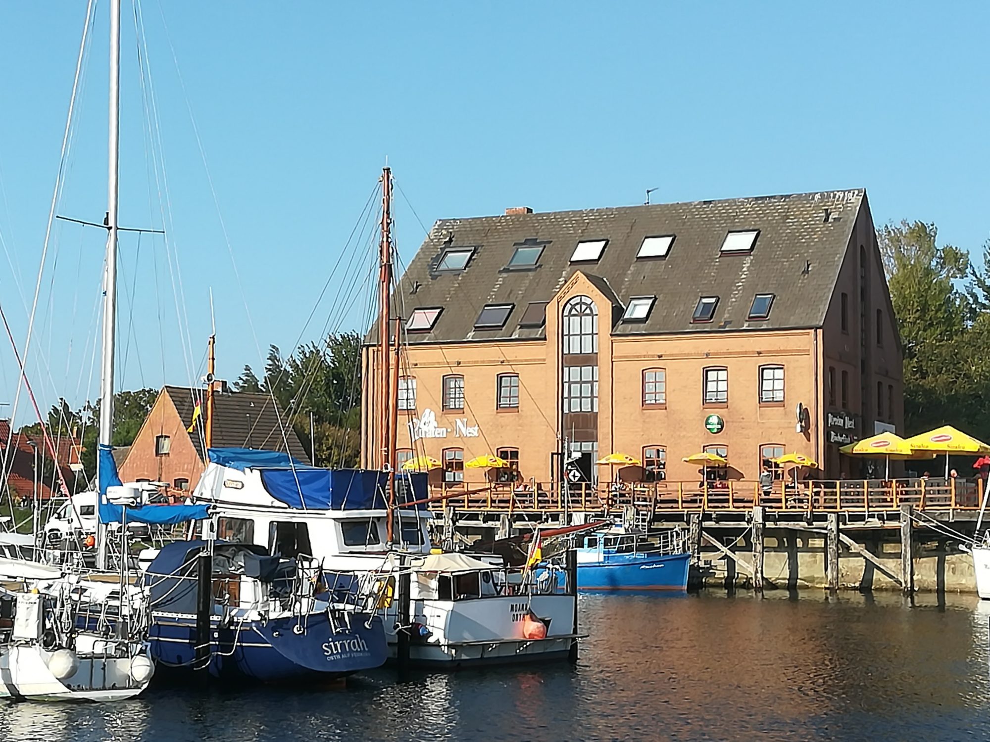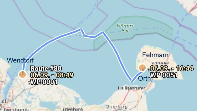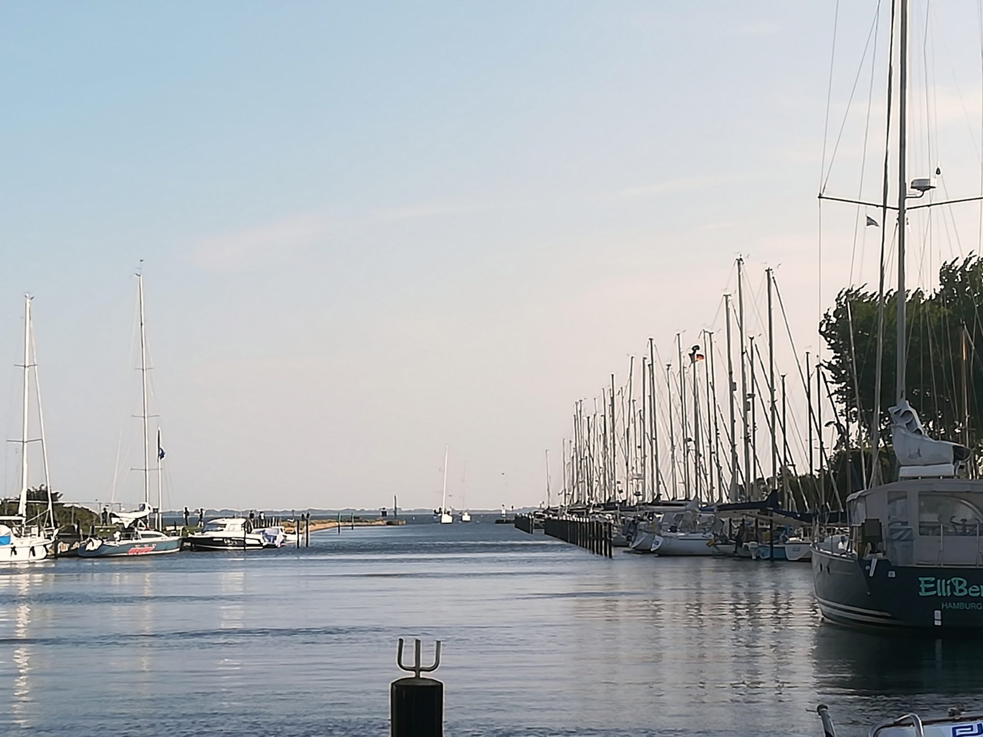 Und wer sich über unsere Kurslinie wundert, wir „durften“ heute das Schießgebiet umfahren und ein paar kurze Schläge waren auch noch erforderlich. 13:35 konnten wir dann endlich Kurs Richtung Fehrmarn-Sund aufnehmen. Dort waren noch einige Schläge erforderlich, bevor wir 16:15 die Segel bergen und nach Orth/Fehmarn die letzten Meilen in der schmalen Fahrrinne mit dem Motor fahren. Wegen des erforderlichen Umwegs waren es heute 45sm, alles bei blauem Himmel. Orth/Hafen gefällt uns gut, irgendwie heimelig. Liegegebühr: 16€.