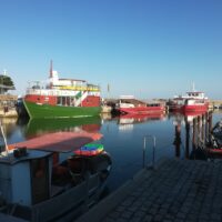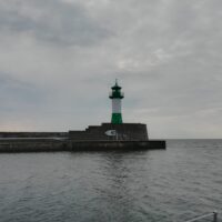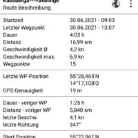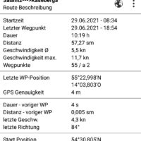Es war nicht einfach, Jockel zu überzeugen nicht gleich früh Richtung Saßnitz zu segeln, da der Wind erst ab 14:00 Uhr kommen sollte. Also wurde die Zeit vorher genutzt, den Hafen Peenemünde Süd und Kröslin anzulaufen, vorrangig um Wasser zu bekommen. Und dann noch 1½h Badepause für Hillu. 12:13 Uhr gab es kein Halten mehr, Anker hoch und gegen den Wind mit Motor in der Fahrrinne. 13:05 Uhr konnte der Motor aus, bei Wind aus NW mit 5kn ging das gerade. Und siehe da, 13:43Uhr kam wie aus dem Nichts der vorausgesagte Wind aus ONO mit 9kn. Und so ging es hoch am Wind mit über 5kn Speed vorbei am Süd- und Nordperd bis kurz vor Saßnitz. Alles in allem ein schöner Tag, der mit Einkaufen und Fischessen im „Kutterfisch“ ein gutes Ende fand.